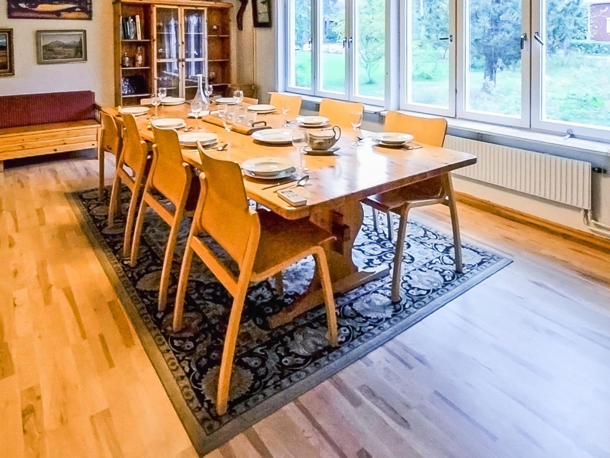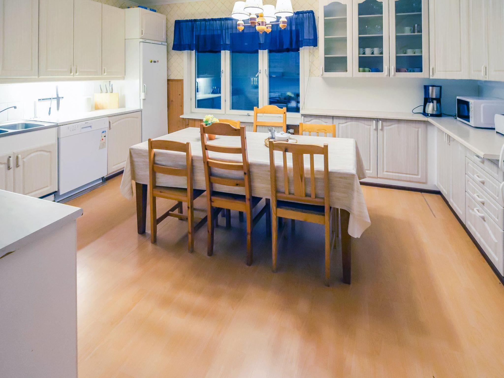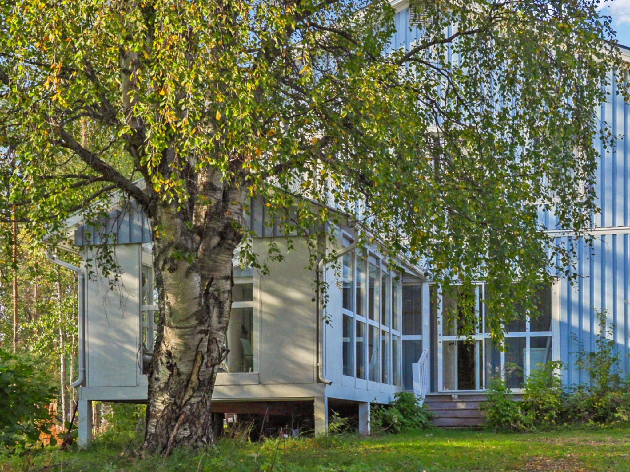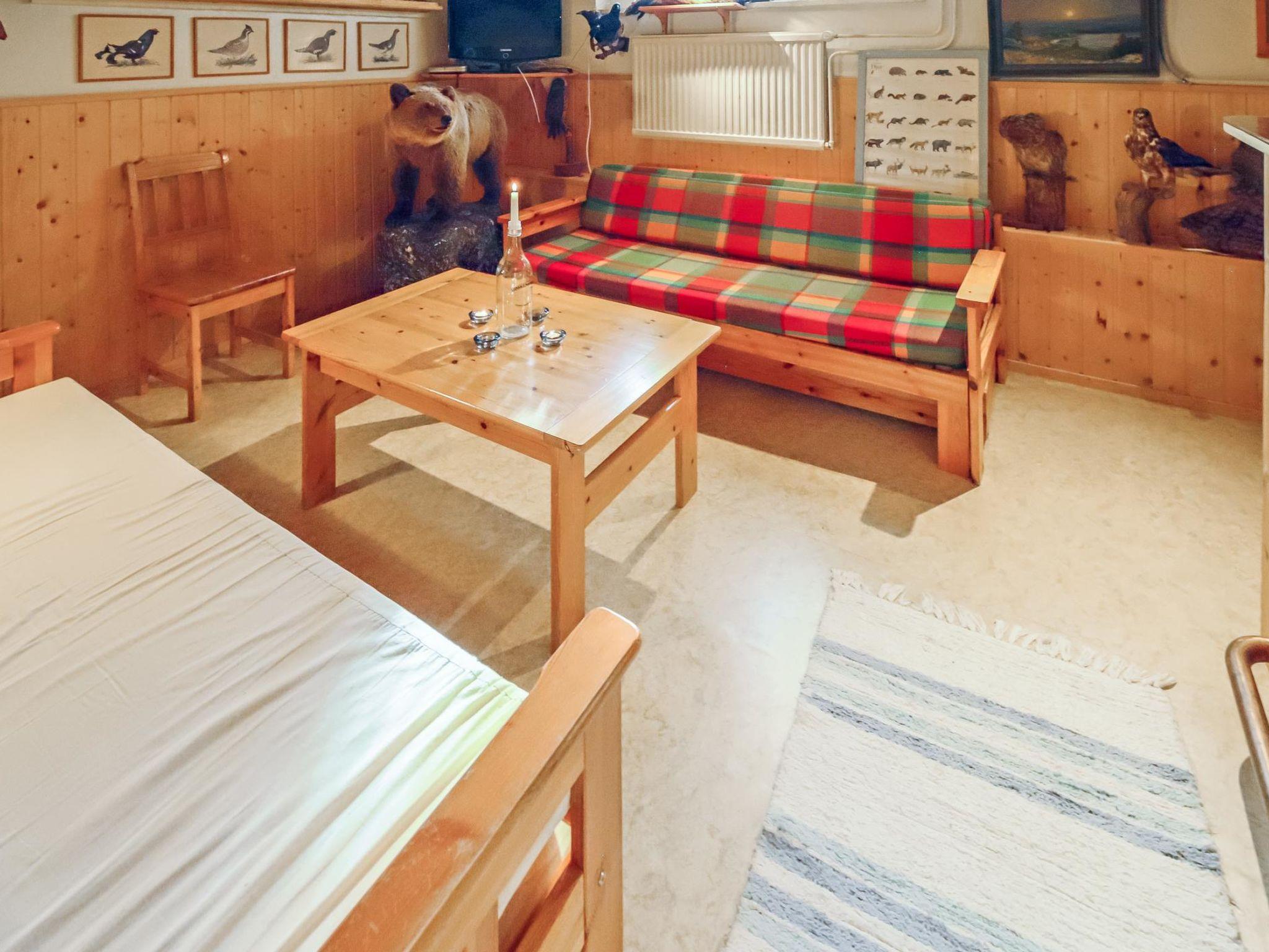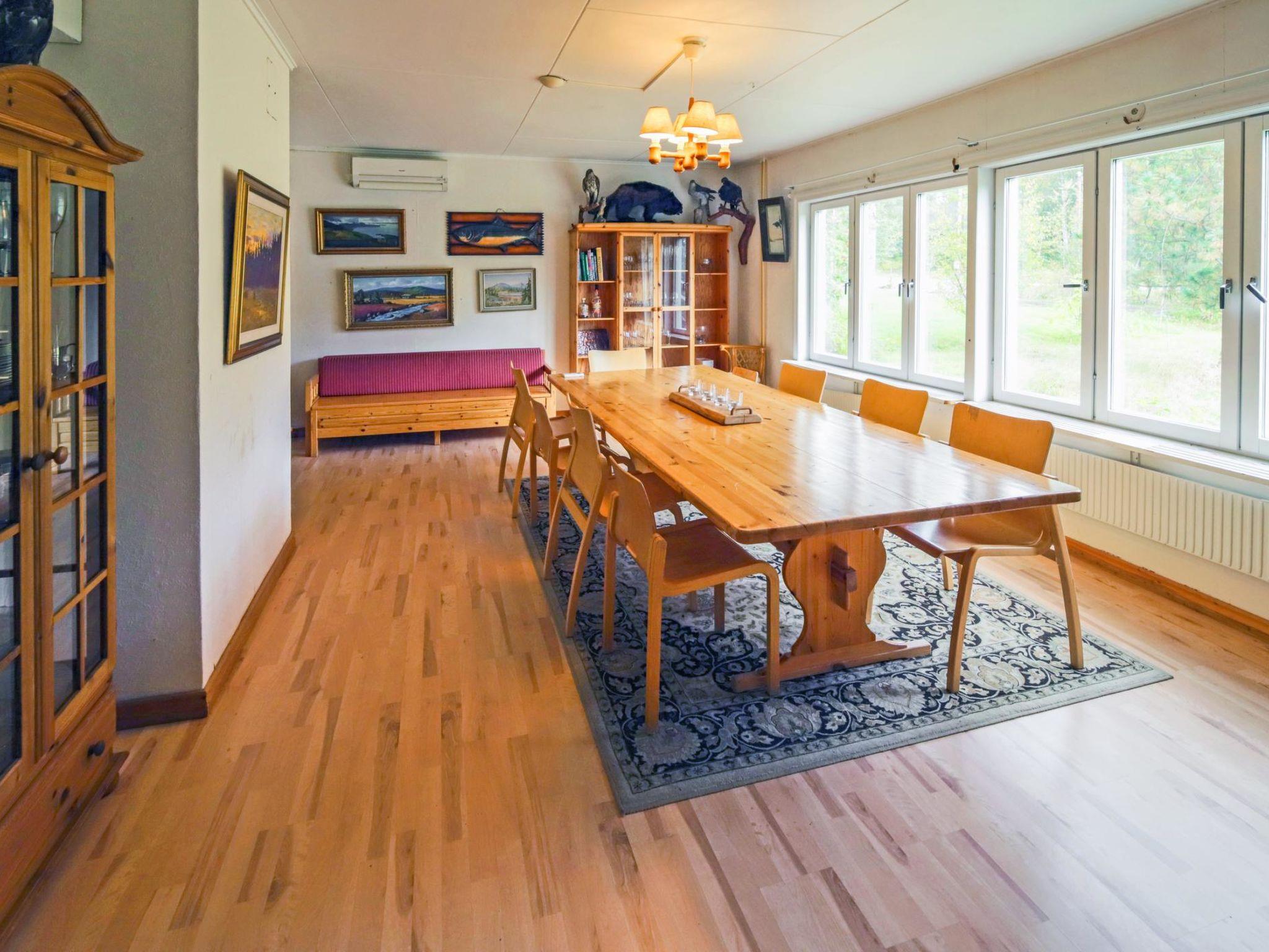 Wooden house 1938, renovated 2008, rooms on 3 storeys, kitchen, dining room/living room, TV room, “hunters’ bar”, 4 bedrooms each with 2 beds (one room with own WC and shower), 2 bedrooms each with 2 beds plus top bunk, 1 bedroom 1 bed, sauna, washroom, room with fireplace, glazed terrace, large open balcony. House has total of 6 showers, WC facilities also upstairs, equipment includes spin drier. More extra beds by arrangement.