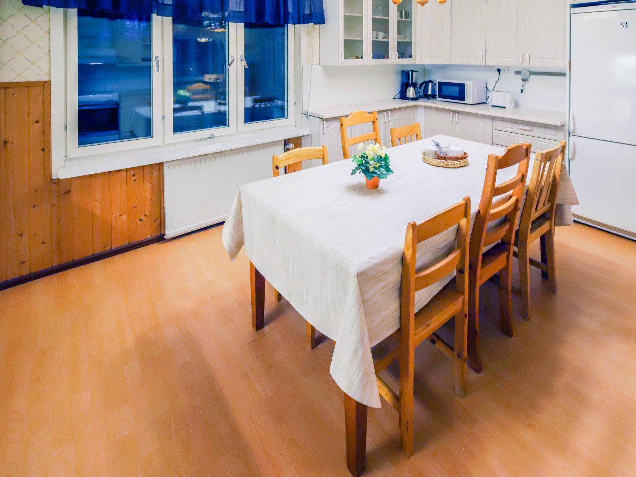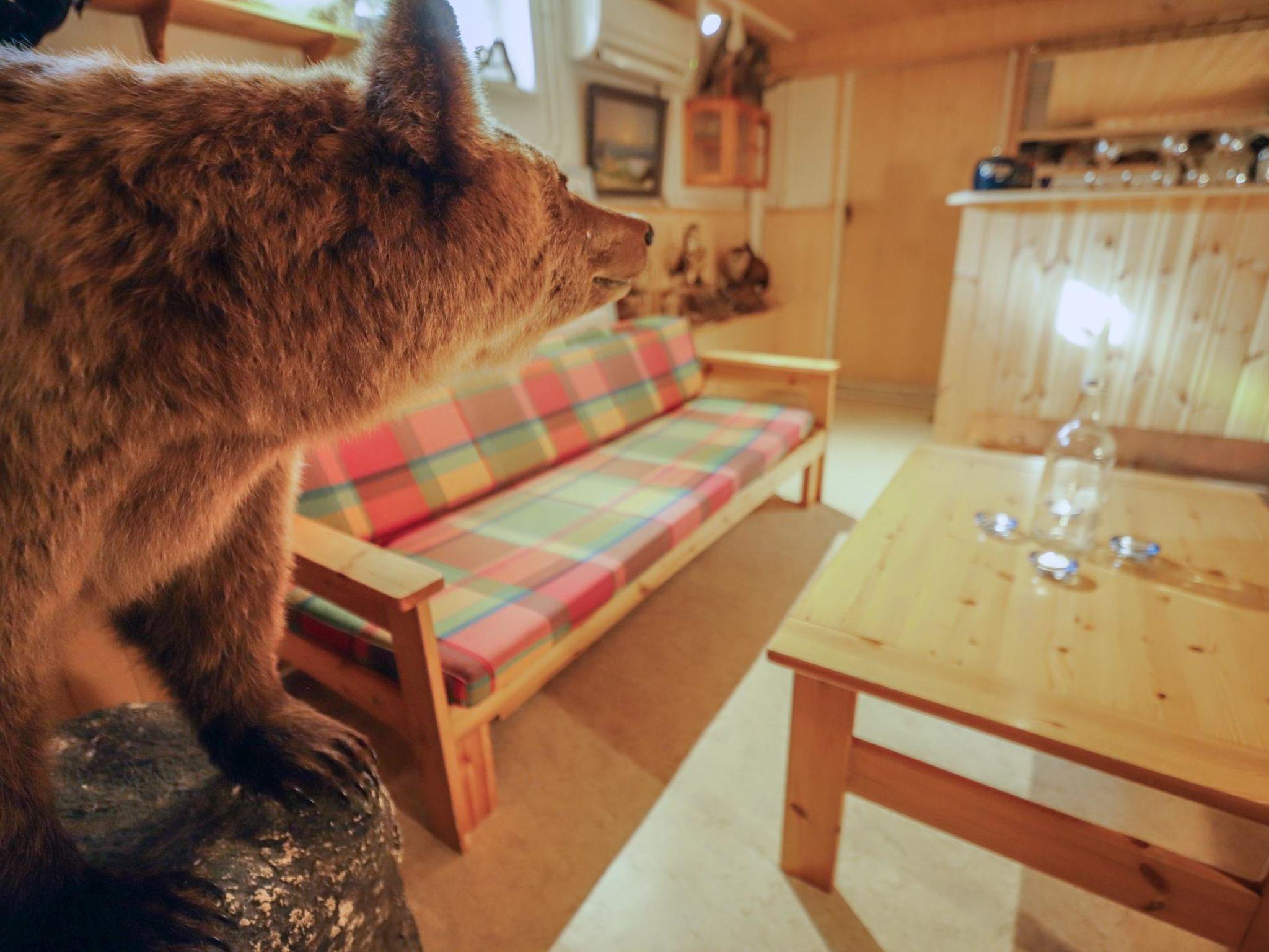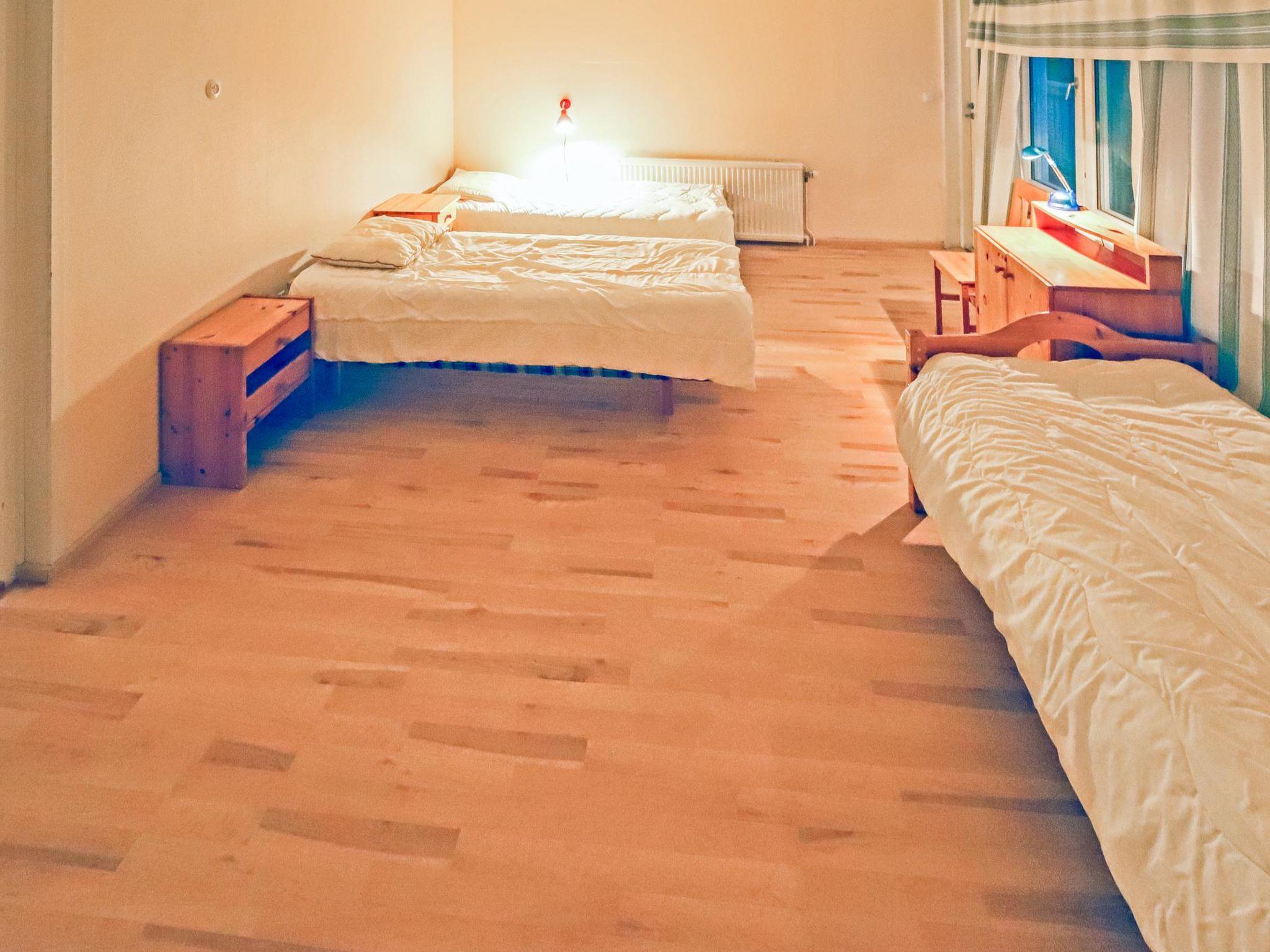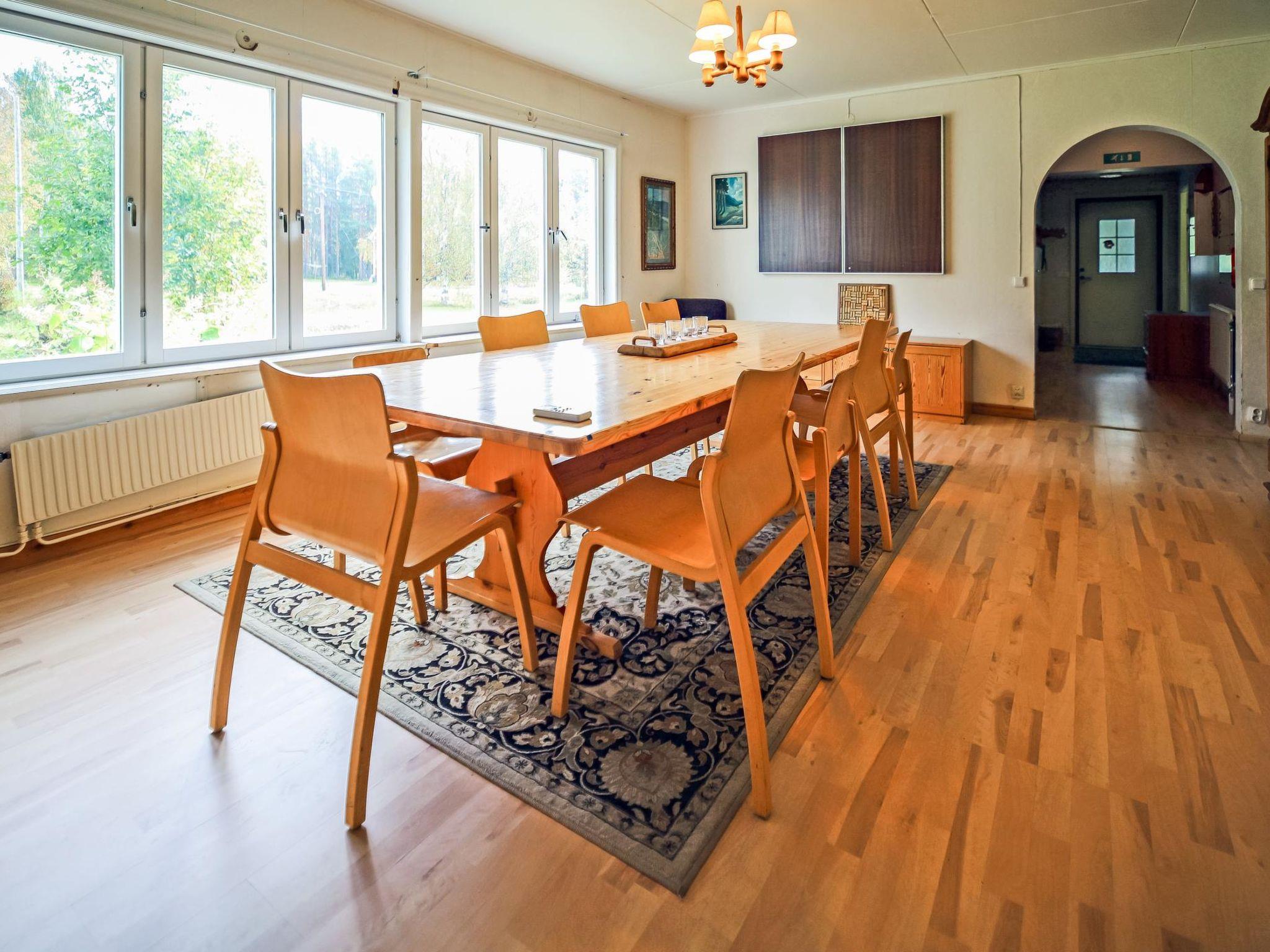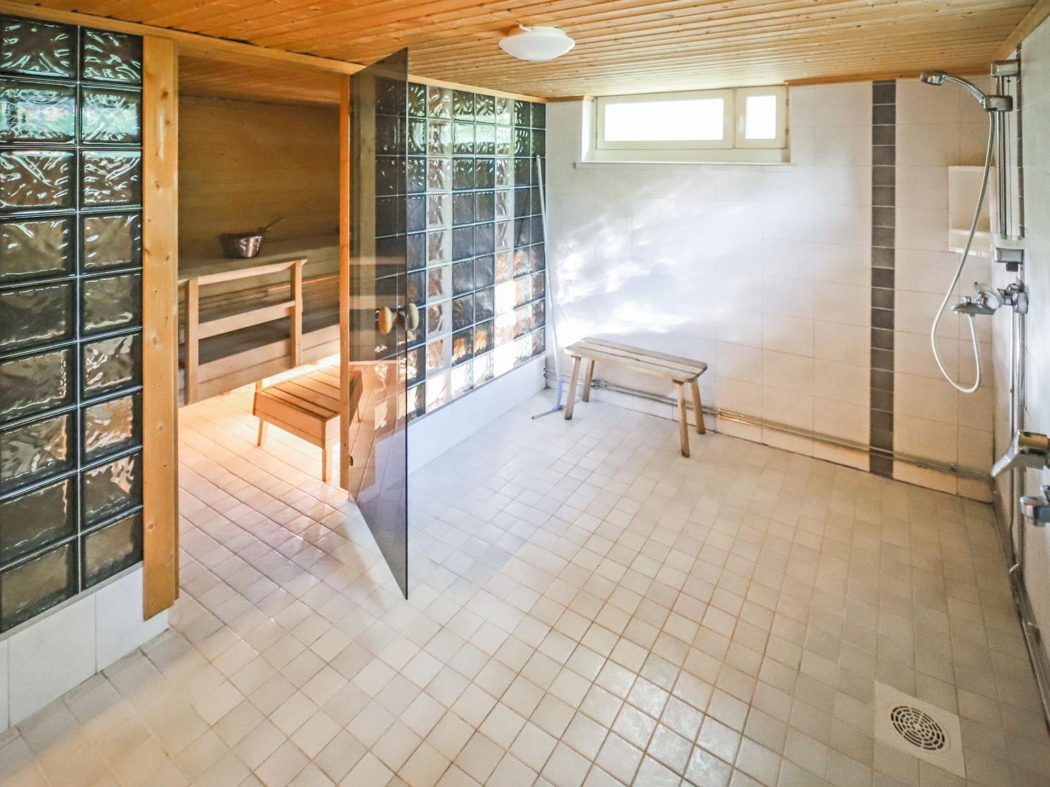 Wooden house 1938, renovated 2008, rooms on 3 storeys, kitchen, dining room/living room, TV room, “hunters’ bar”, 4 bedrooms each with 2 beds (one room with own WC and shower), 2 bedrooms each with 2 beds plus top bunk, 1 bedroom 1 bed, sauna, washroom, room with fireplace, glazed terrace, large open balcony. House has total of 6 showers, WC facilities also upstairs, equipment includes spin drier. More extra beds by arrangement.