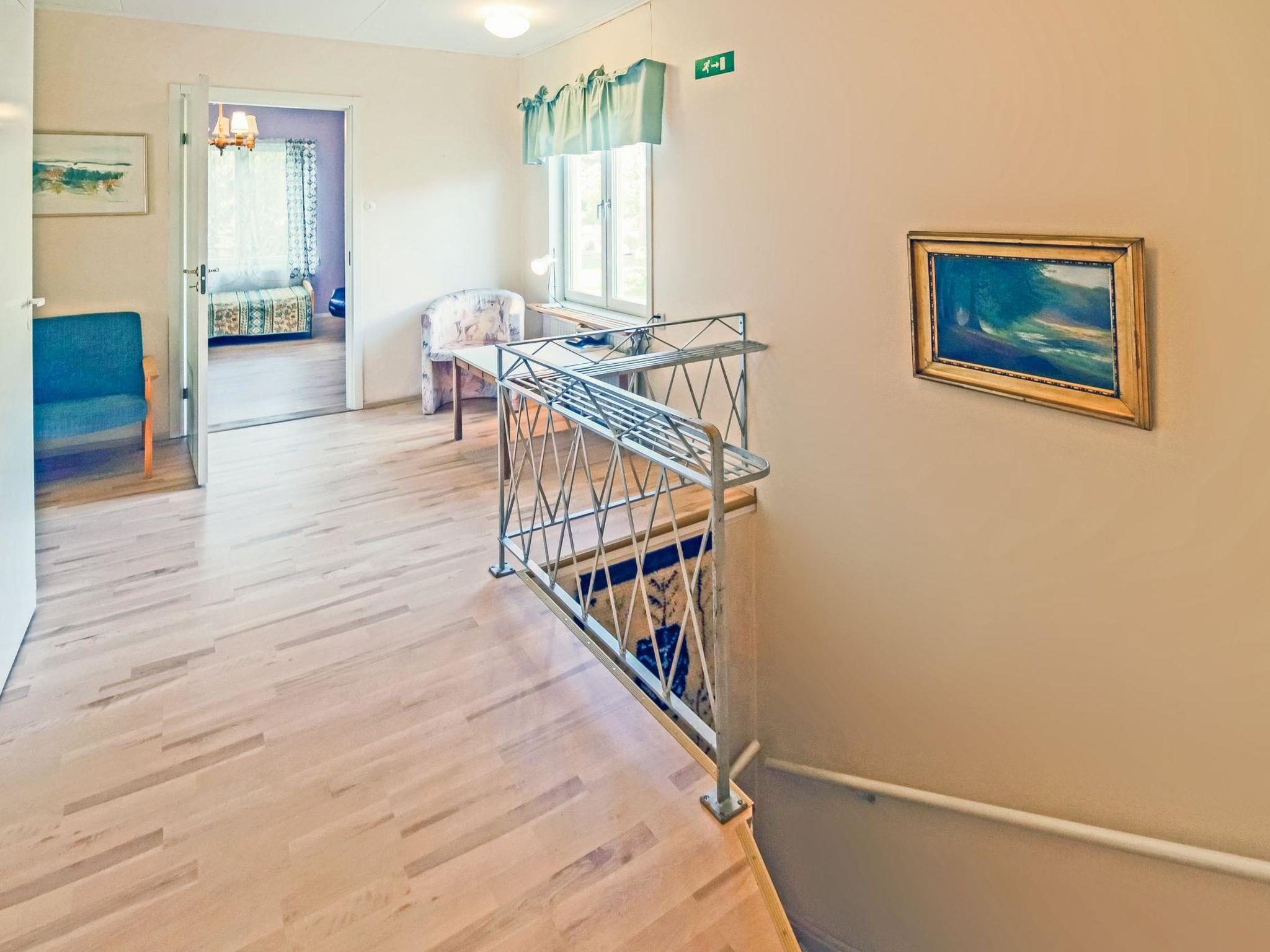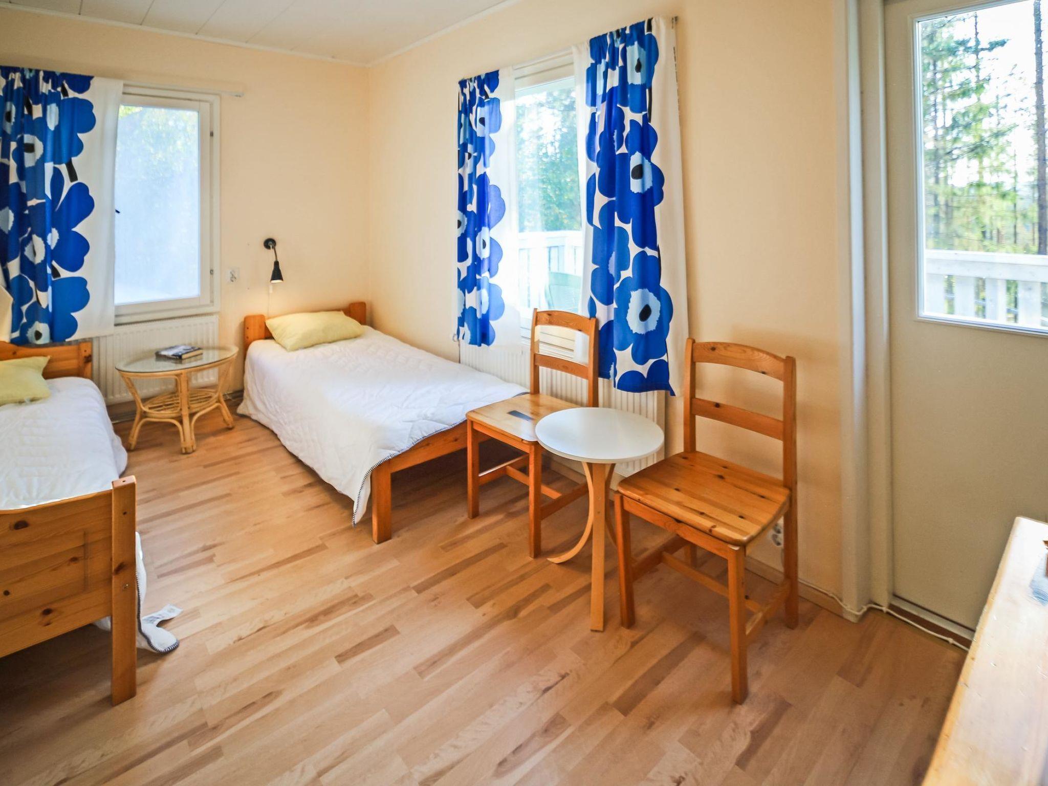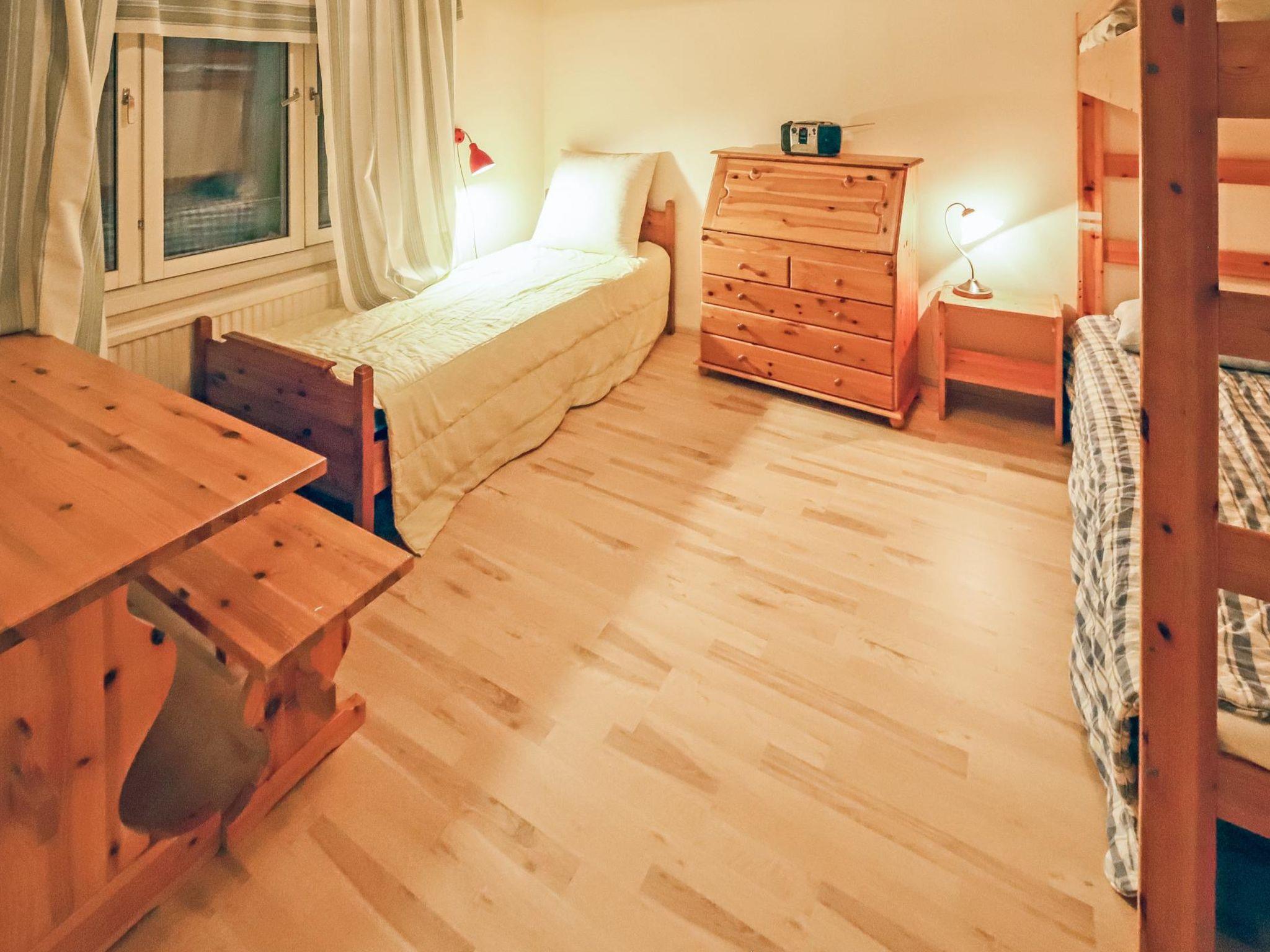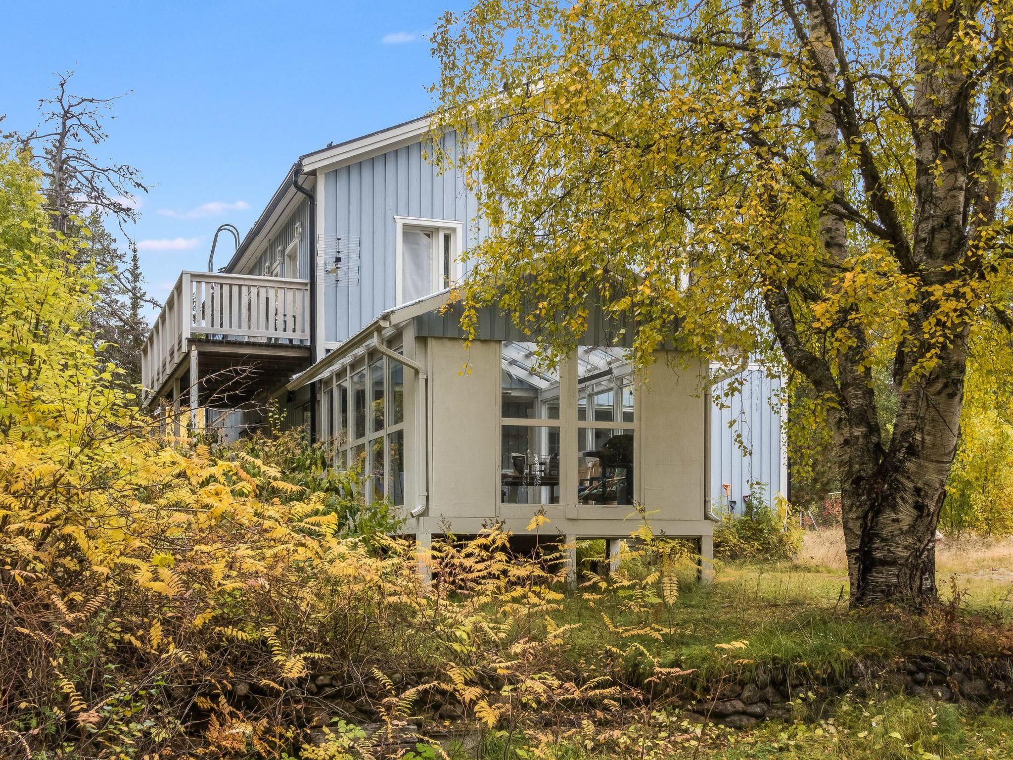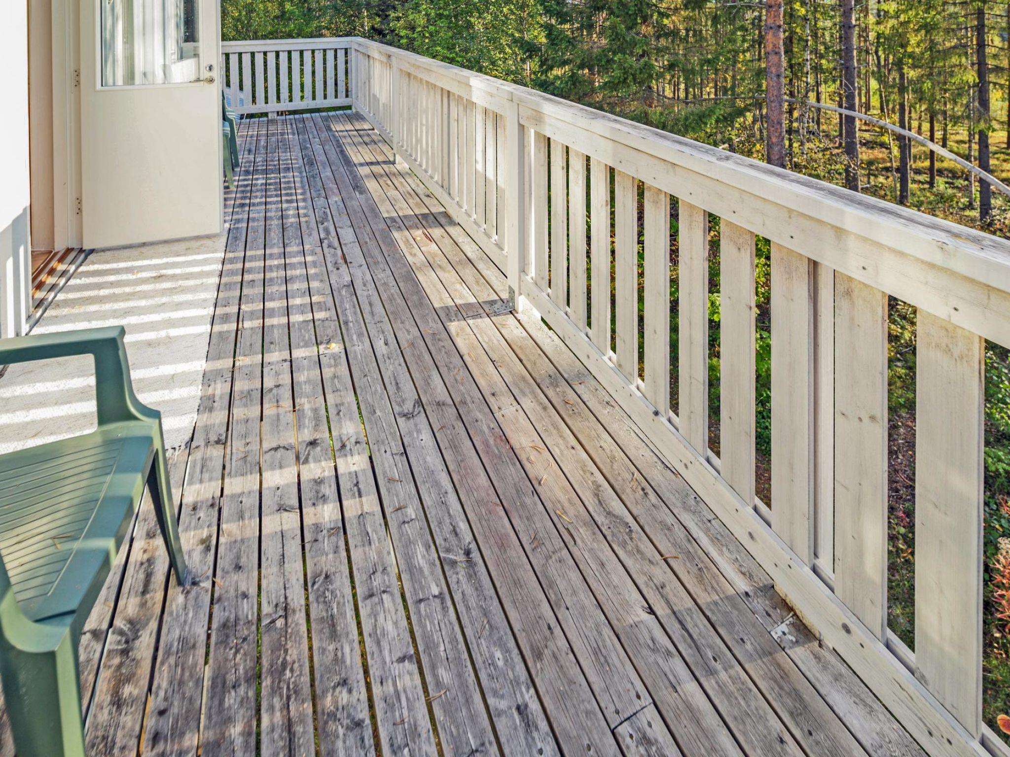 Wooden house 1938, renovated 2008, rooms on 3 storeys, kitchen, dining room/living room, TV room, “hunters’ bar”, 4 bedrooms each with 2 beds (one room with own WC and shower), 2 bedrooms each with 2 beds plus top bunk, 1 bedroom 1 bed, sauna, washroom, room with fireplace, glazed terrace, large open balcony. House has total of 6 showers, WC facilities also upstairs, equipment includes spin drier. More extra beds by arrangement.