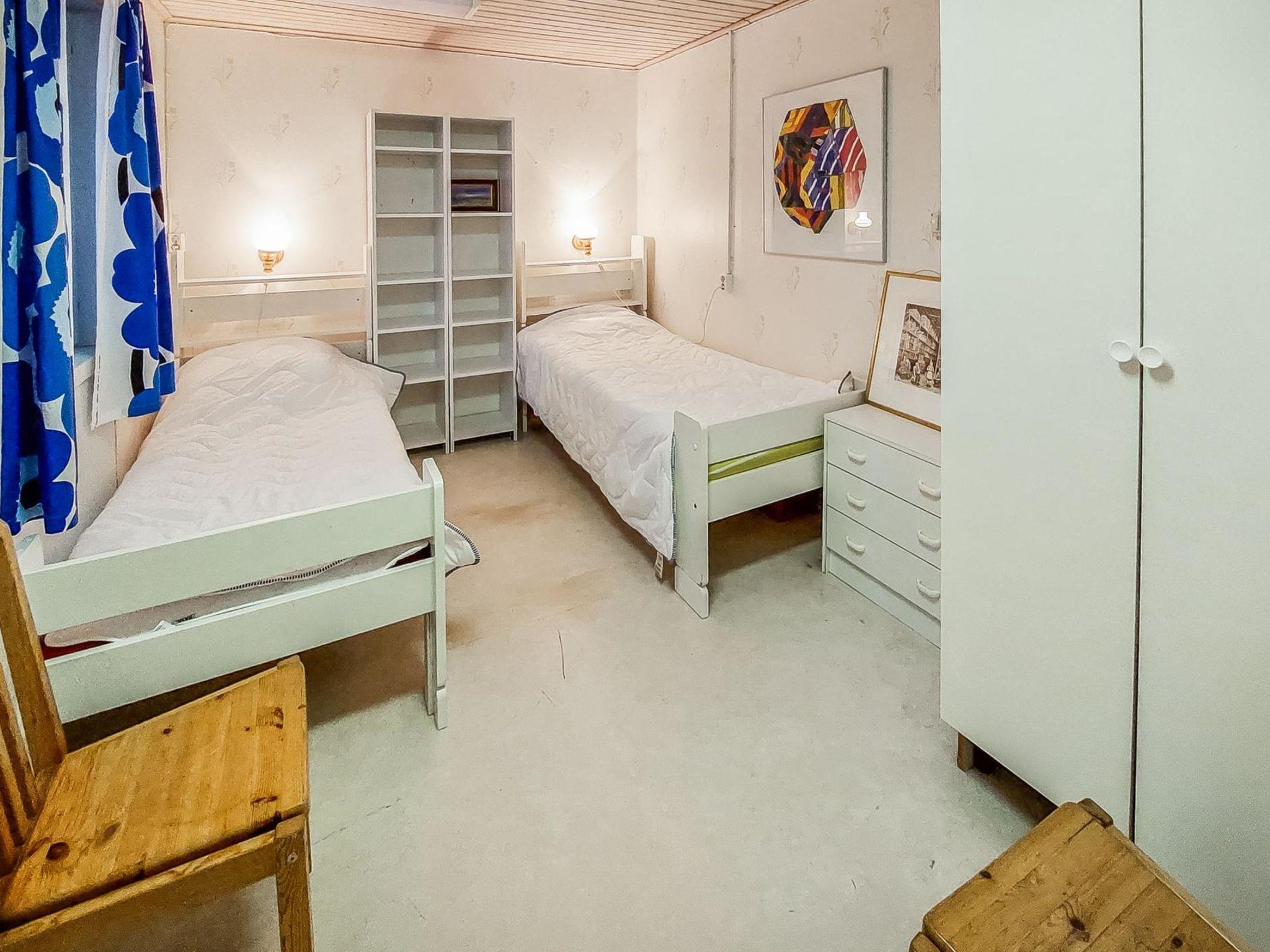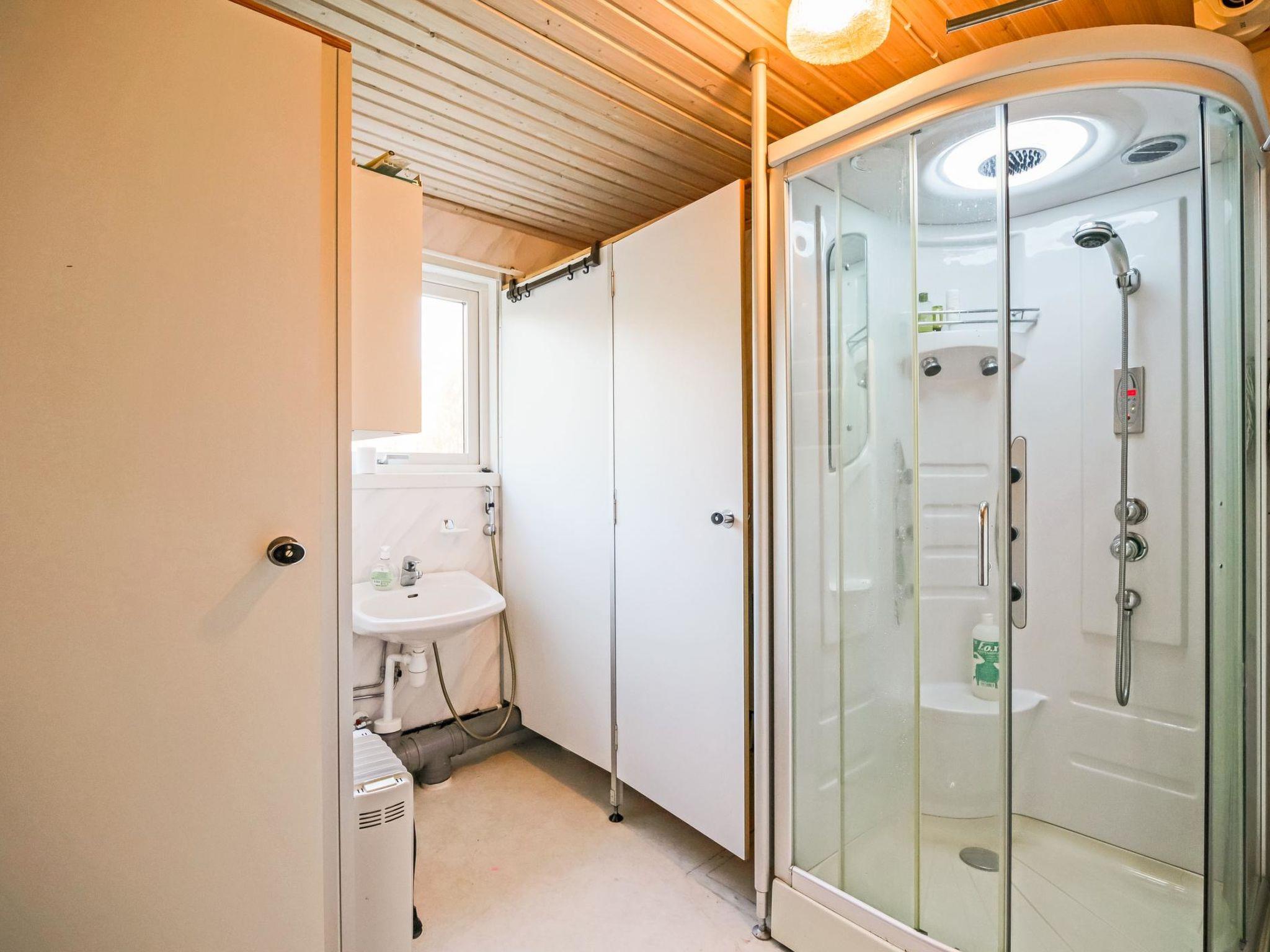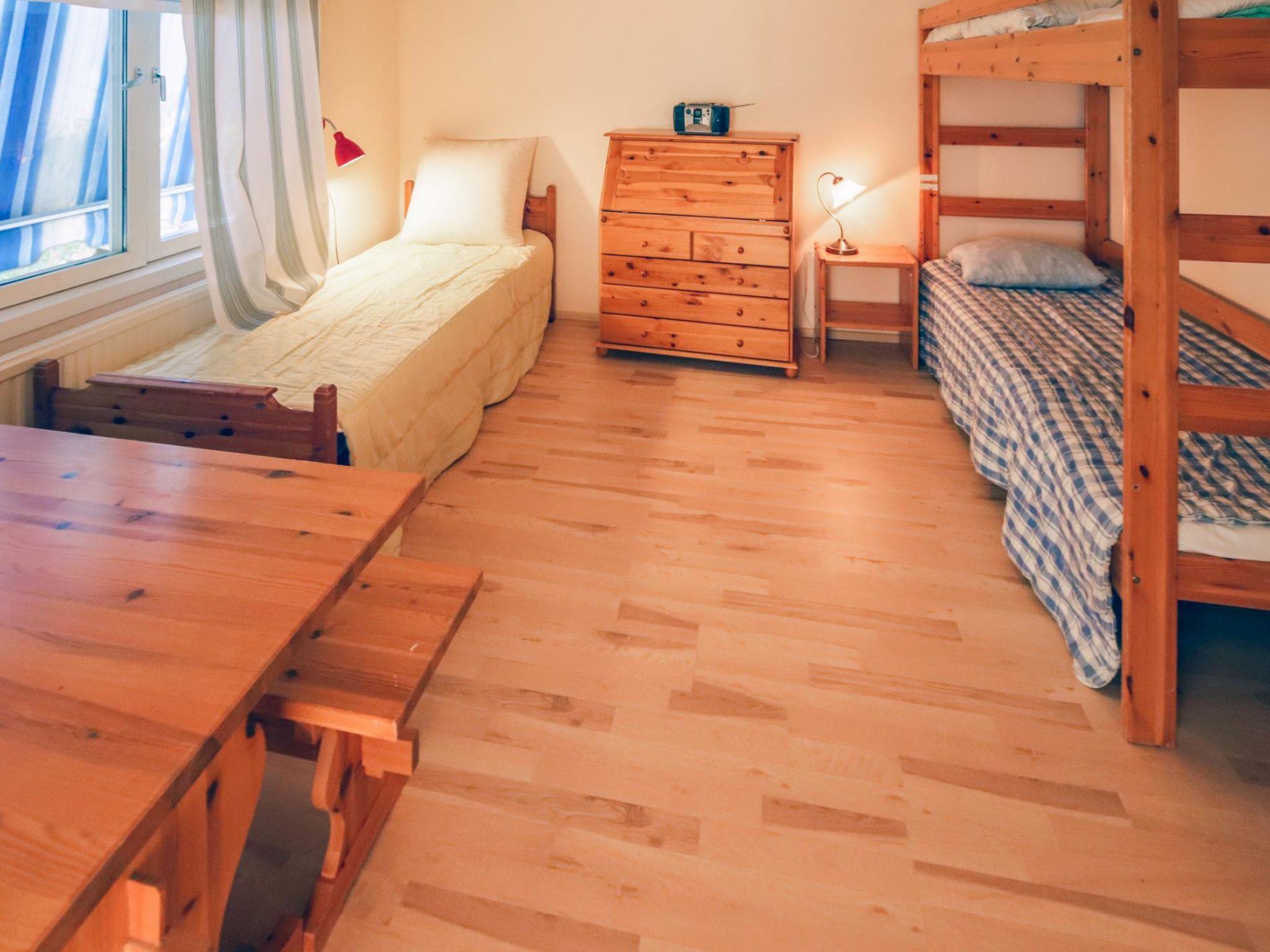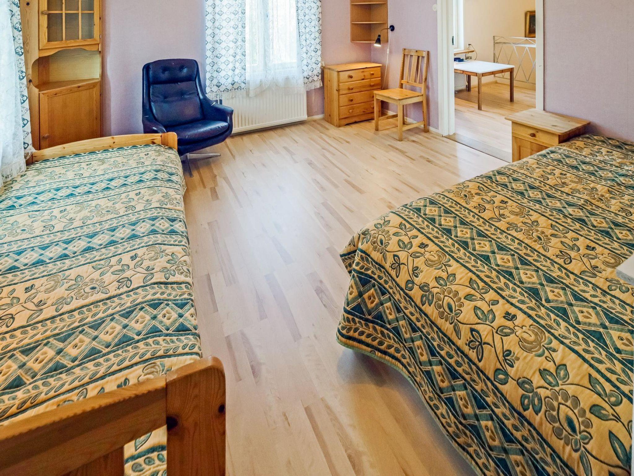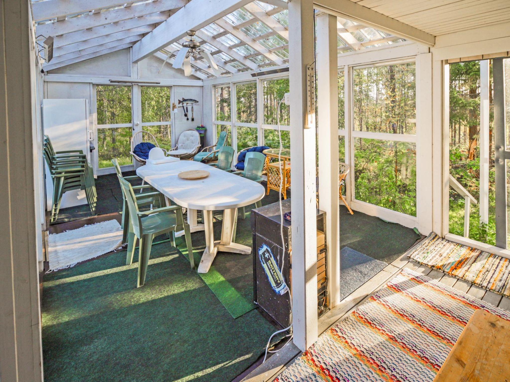 Wooden house 1938, renovated 2008, rooms on 3 storeys, kitchen, dining room/living room, TV room, “hunters’ bar”, 4 bedrooms each with 2 beds (one room with own WC and shower), 2 bedrooms each with 2 beds plus top bunk, 1 bedroom 1 bed, sauna, washroom, room with fireplace, glazed terrace, large open balcony. House has total of 6 showers, WC facilities also upstairs, equipment includes spin drier. More extra beds by arrangement.