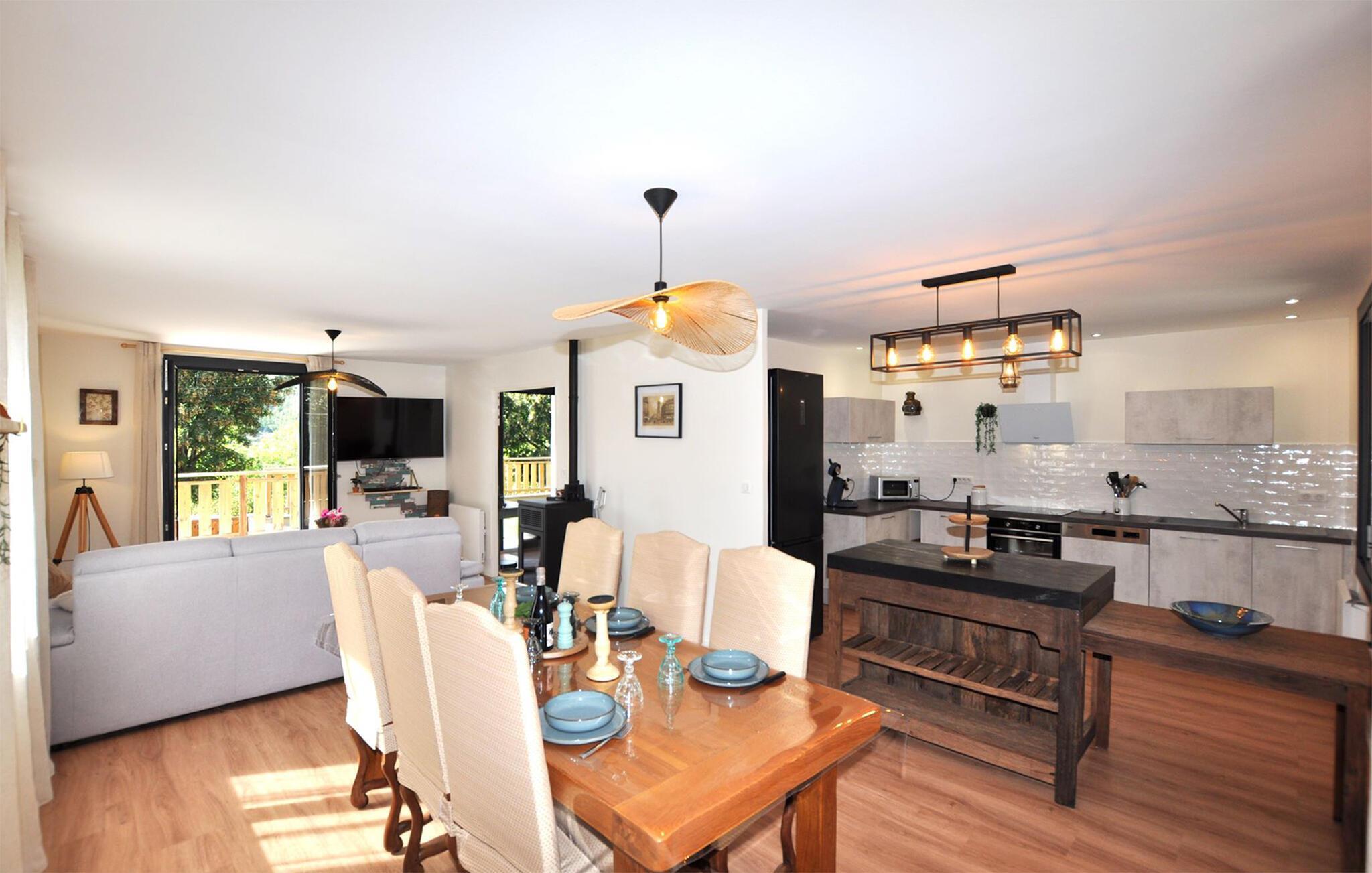 Legg hverdagen bak deg og nyt en avslappende ferie i dette innbydende huset. Våkn opp til en fantastisk utsikt over området rundt, som du også kan nyte mens du slapper av i sofaen. Spis sammen ved spisebordet mens dere legger planer for neste dag.