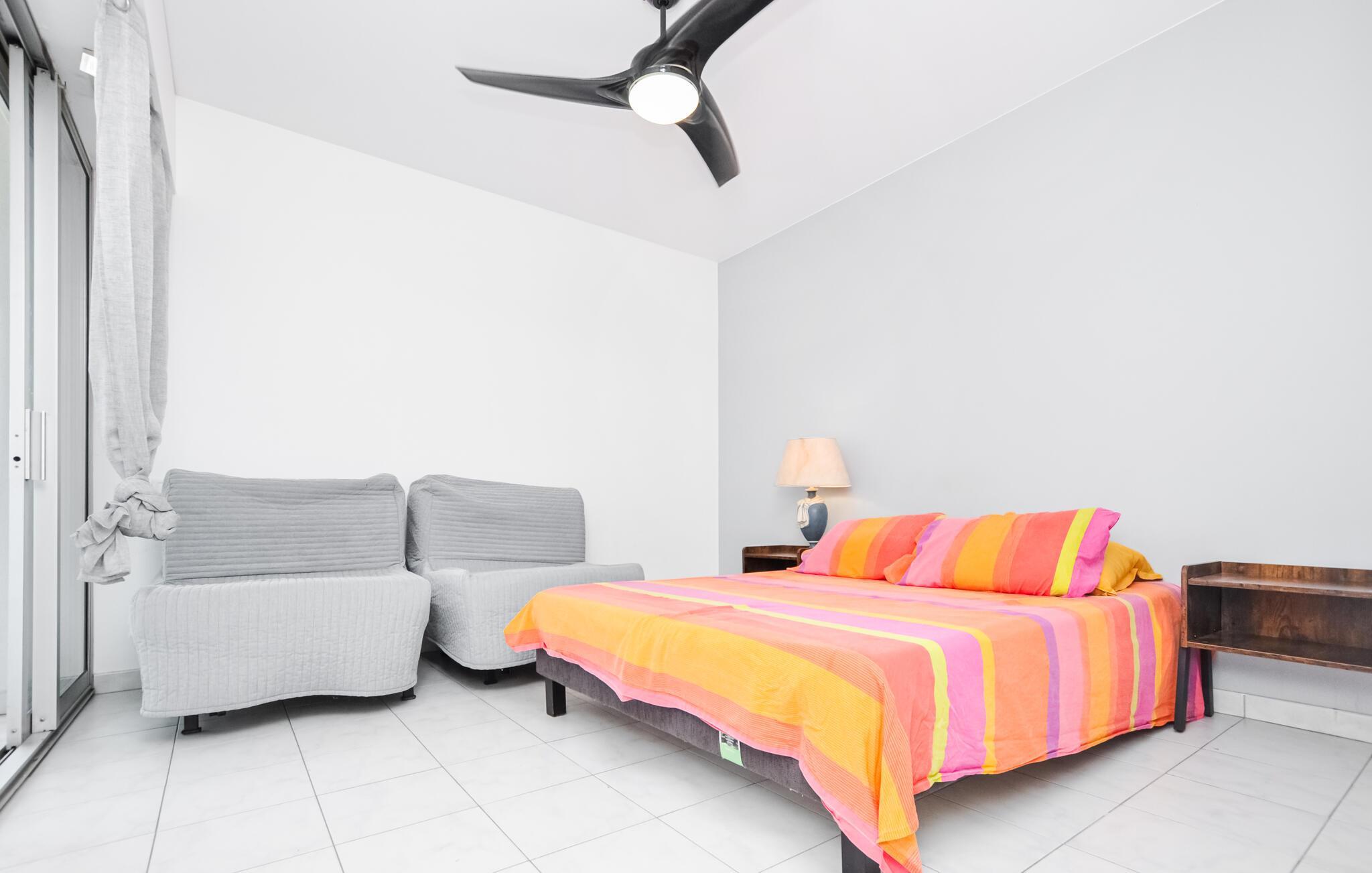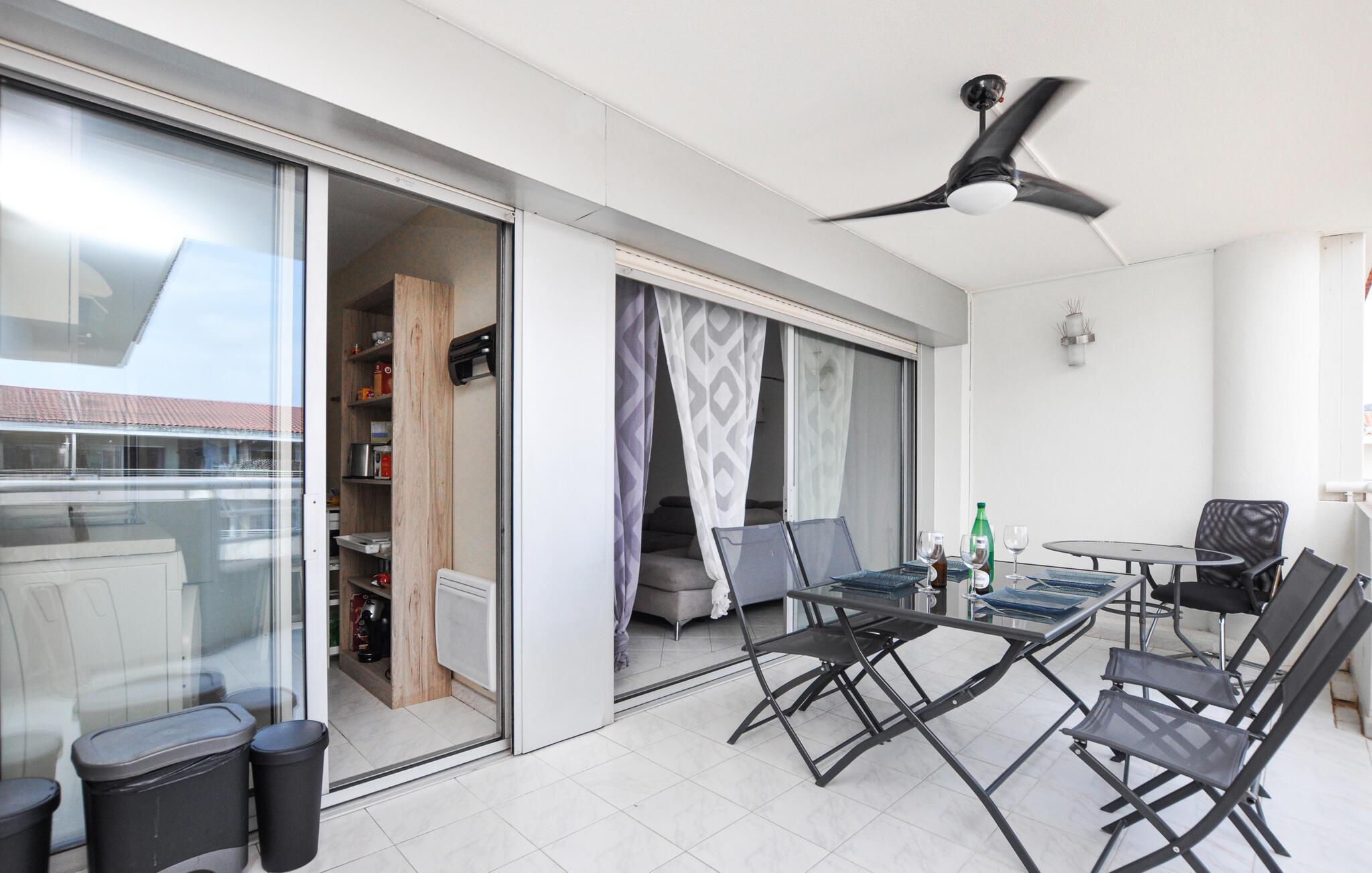 Nyt morgenen på den romslige balkongen, som er møblert med et koselig spisebord. Start med en avslappet frokost og la blikket vandre over det velholdte boligkomplekset og det omkringliggende panoramaet. Ferieleiligheten har en lys og romslig stue med en komfortabel sofa og spisebord, ideelt for avslappende kvelder eller måltider sammen. Det klassisk innredede kjøkkenet inviterer deg til å tilberede deilige måltider, som du deretter kan nyte i stuen eller på balkongen utenfor.