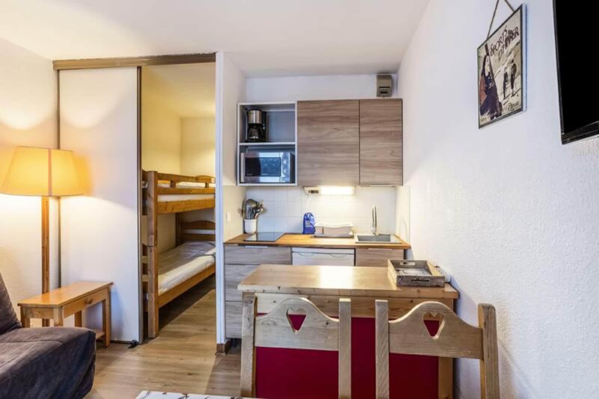 Høyt over det pittoreske feriestedet Flaine tilbyr Résidence Doris et rolig alpint tilfluktssted som er perfekt for de som søker både ro og eventyr. Denne sjarmerende residensen ligger i Flaine Forêt-distriktet, og gir en fredelig flukt samtidig som du holder deg nær hjertet av begivenhetenes sentrum. Tenk deg å våkne opp til frisk fjelluft og gå ut på din private balkong for å nyte den fantastiske utsikten over de omkringliggende toppene. Her føles hvert øyeblikk som en feiring av natur og avslapning. Leiligheten er gjennomtenkt designet for å maksimere komfort og funksjonalitet innenfor sitt 26 m² store område. Den har en koselig stue med en toseters sofa, en spiseplass med plass til fem og et velutstyrt kjøkken åpent mot stuen. Soveplassene inkluderer en lukket alkove med en dobbeltseng og en annen alkove med køyesenger, noe som gjør den ideell for familier eller små grupper. Badet har et badekar for avslapning etter en dag med utforsking, og et separat toalett gir ekstra bekvemmelighet. Moderne fasiliteter som Wi-Fi (tilgjengelig mot et tillegg) sikrer at du holder deg tilkoblet mens du nyter fjellferien. Bare 250 meter fra kjøpesenteret Flaine Forêt har du enkel tilgang til viktige butikker, inkludert en matbutikk. Den gratis skibussbussen stopper rett utenfor boligen din og tar deg til bakkene eller det livlige Flaine Forum-distriktet på få minutter. Fra stolheisen i Gerats til det vidstrakte skiområdet Grand Massif tilbyr regionen uendelige muligheter for ski, snowboard og fjelleventyr. Om sommeren forvandles området til et fristed for turgåere og naturentusiaster. Enten du er her for å klatre gjennom uberørt snø eller sole deg i Alpenes skjønnhet, er Résidence Doris din inngangsport til uforglemmelige minner. Bestill oppholdet ditt i dag og opplev magien i Flaine i alle årstider.