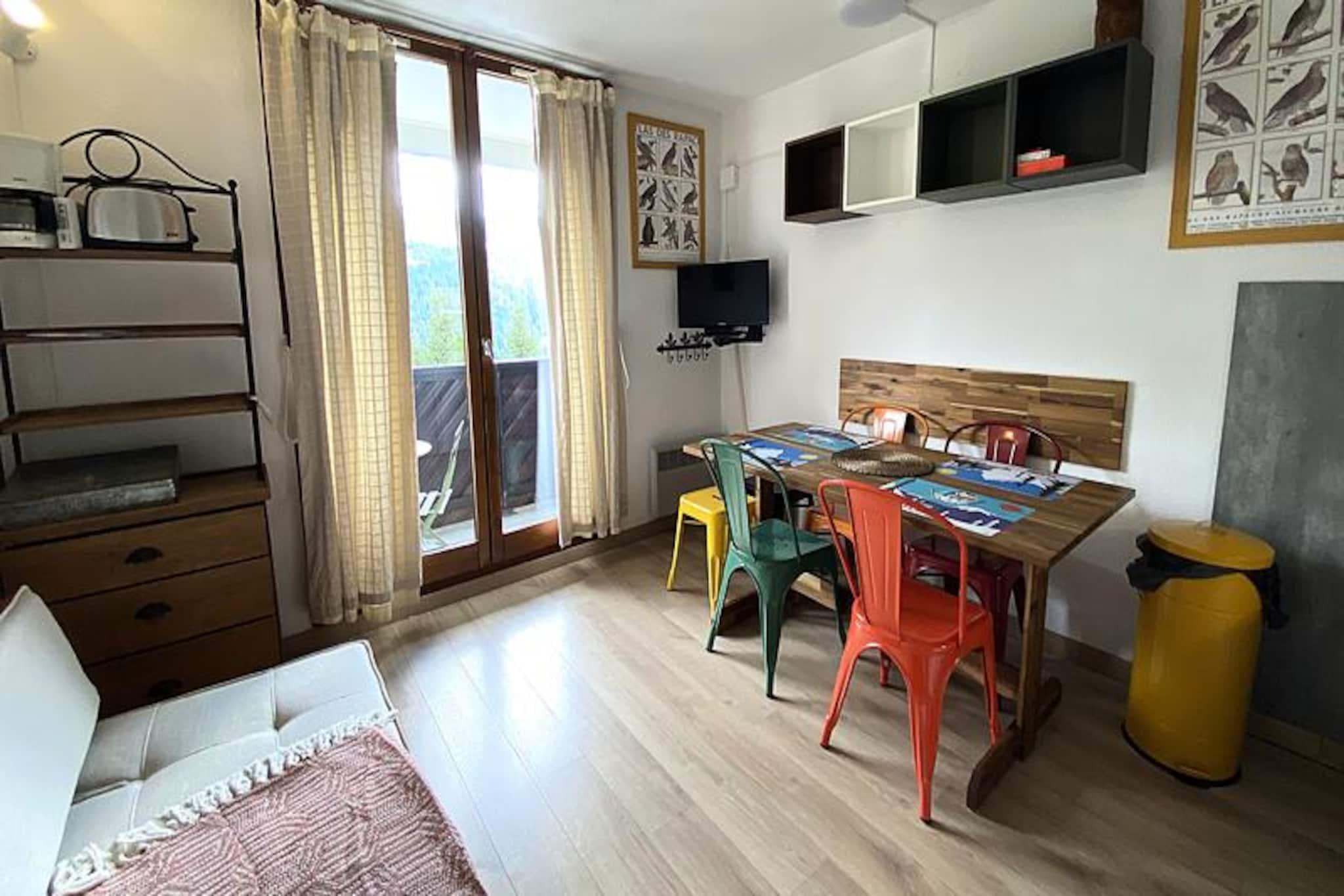 I det rolige Flaine Forêt-distriktet tilbyr denne sjarmerende leiligheten et rolig tilfluktssted midt i det fantastiske landskapet i de franske Alpene. Med en perfekt beliggenhet bare 250 meter fra kjøpesenteret Flaine Forêt, har du enkel tilgang til viktige butikker, inkludert en matbutikk, samtidig som du nyter en fredelig beliggenhet vekk fra det travle feriestedet. Enten du søker eventyr eller avslapning, er denne residensen den ideelle basen for din fjellferie. Leiligheten, som ligger i første etasje, er gjennomtenkt designet for å innkvartere opptil fire gjester. Den har en koselig stue med en treseters sofa, et åpent kjøkken utstyrt med alt du trenger, og en spiseplass med plass til seks. Soveplassene inkluderer en lukket alkove med en komfortabel dobbeltseng og en ekstra alkove med køyesenger, noe som gjør den perfekt for familier eller små grupper. En privat balkong inviterer deg til å slappe av og nyte den alpine utsikten, mens det moderne badet og det separate toalettet sikrer bekvemmelighet gjennom hele oppholdet. For skientusiaster ligger Gerats-stolheisen bare noen skritt unna, og den gratis Skibus-bussen stopper rett foran residensen, og gir rask tilgang til det berømte skiområdet Grand Massif. Flaine Forum, det pulserende hjertet av feriestedet med sine livlige barer, restauranter og aktiviteter, er lett tilgjengelig via en heis i nærheten, slik at du aldri er langt fra alt som skjer. Enten du slentrer gjennom uberørte bakker om vinteren eller utforsker naturskjønne turstier om sommeren, tilbyr denne residensen en harmonisk blanding av komfort, bekvemmelighet og alpin sjarm. Gjør oppholdet ditt i Flaine uforglemmelig med dette herlige tilfluktsstedet.