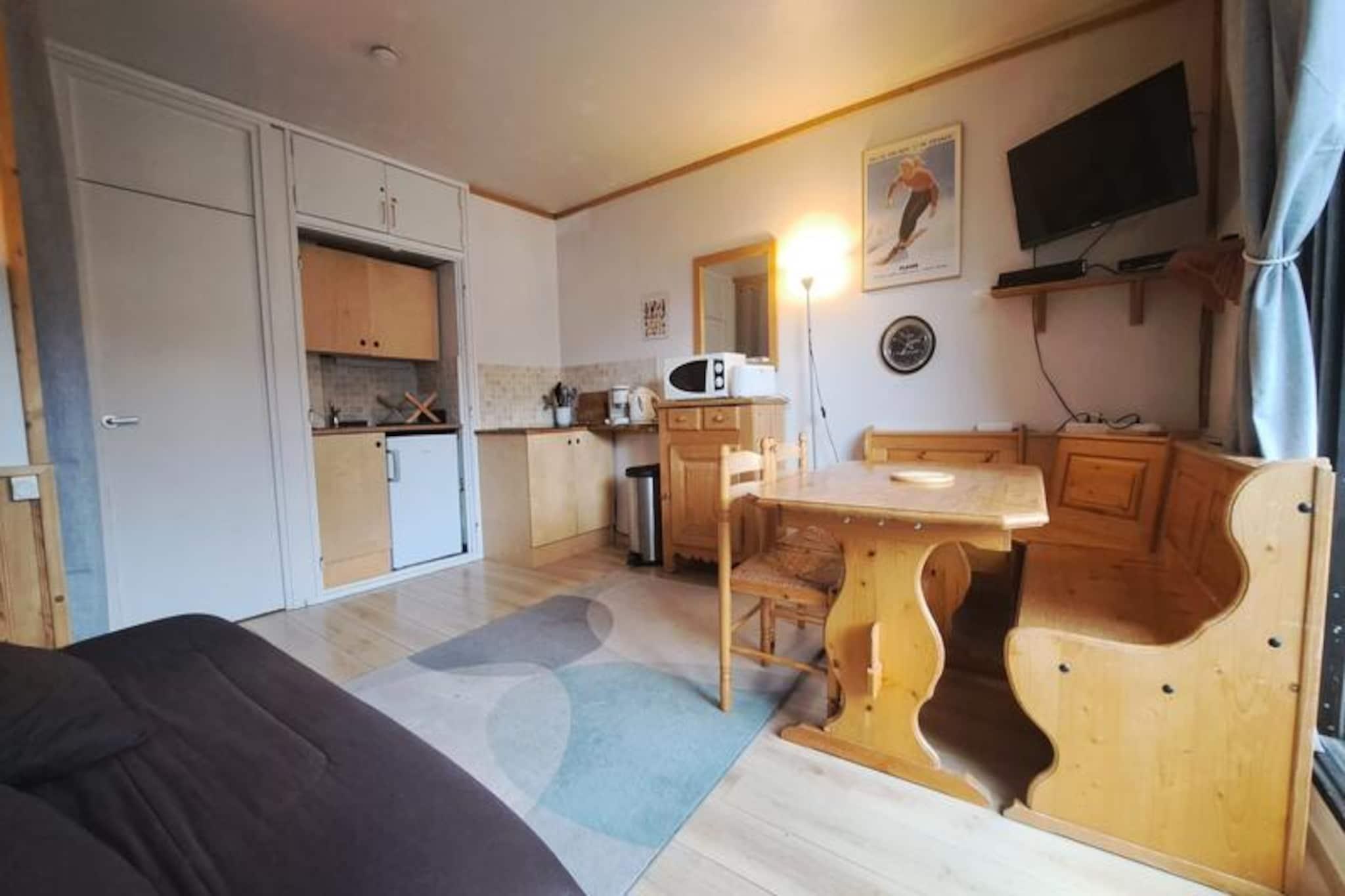 I hjertet av Flaine Forum, det pulserende sentrum av Flaine-feriestedet, inviterer denne koselige leiligheten deg til å oppleve den perfekte alpinferien. Enten du er her for spennende skieventyr eller rolige fjellturer, plasserer denne residensen deg midt i det hele, med bakkene bare 300 meter unna og bekvemmeligheten av feriestedets gratis skibuss som tar deg dit på få minutter. Etter en dag med utforsking kan du slappe av på din private balkong og nyte den friske fjelluften. Kompakt, men gjennomtenkt designet, denne leiligheten på 23 m² er ideell for par eller små familier. Stuen har en komfortabel sovesofa for to, mens den lukkede sovealkoven med køyesenger er perfekt for barn. Et fullt utstyrt kjøkken og en koselig spiseplass gjør det enkelt å nyte måltider sammen etter en dag med utendørsaktiviteter. Badet har et badekar for et avslappende bad, og viktige fasiliteter som sengetøy og håndklær er inkludert i vintersesongen. Gå ut, og du vil befinne deg bare 50 meter fra det lokale kjøpesenteret, hvor en rekke barer, restauranter og butikker venter. Flaine er kjent for sin livlige atmosfære og varierte aktiviteter, fra ski og snowboard om vinteren til fotturer og terrengsykling om sommeren. Feriestedets underholdningstilbud sørger for at det finnes noe for enhver smak, enten du søker eventyr eller avslapning. Velg Résidence Véga for den uslåelige beliggenheten, koselige komforten og den enkle tilgangen til alt Flaine har å tilby. Skap uforglemmelige minner i dette sjarmerende alpine tilfluktsstedet, hvor hver dag er en mulighet til å omfavne fjellenes skjønnhet.