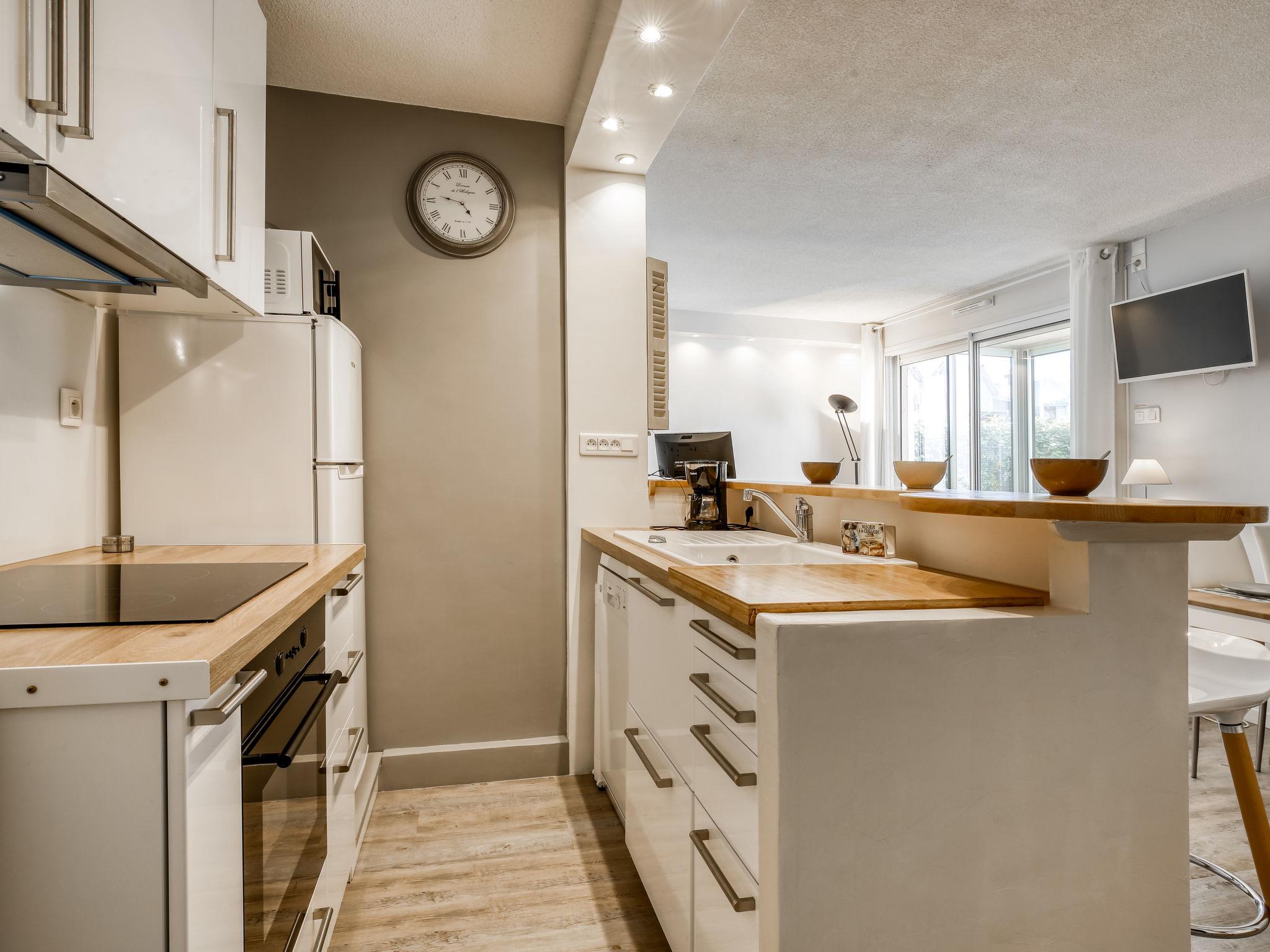 2-room apartment 36 m2, on the ground floor. Comfortable and beautiful furnishings: living/dining room with 1 double sofabed (1 x 160 cm, length 190 cm), TV (flat screen), hi-fi system. Exit to the loggia. 1 room with 1 french bed (1 x 140 cm, length 190 cm). Open kitchen (oven, dishwasher, 3 induction hot plates, toaster, kettle, microwave, freezer, electric coffee machine) with bar. Shower/WC. Electric heating. Terrace 6 m2, north facing position and west facing position. Terrace furniture. Facilities: washing machine, iron, hair dryer. Internet (WiFi, free). Parking space n 1237 (1 car). Please note: smoke alarm. Offer by a private individual according to Art. 155, IV of CGI. 3300900098275
