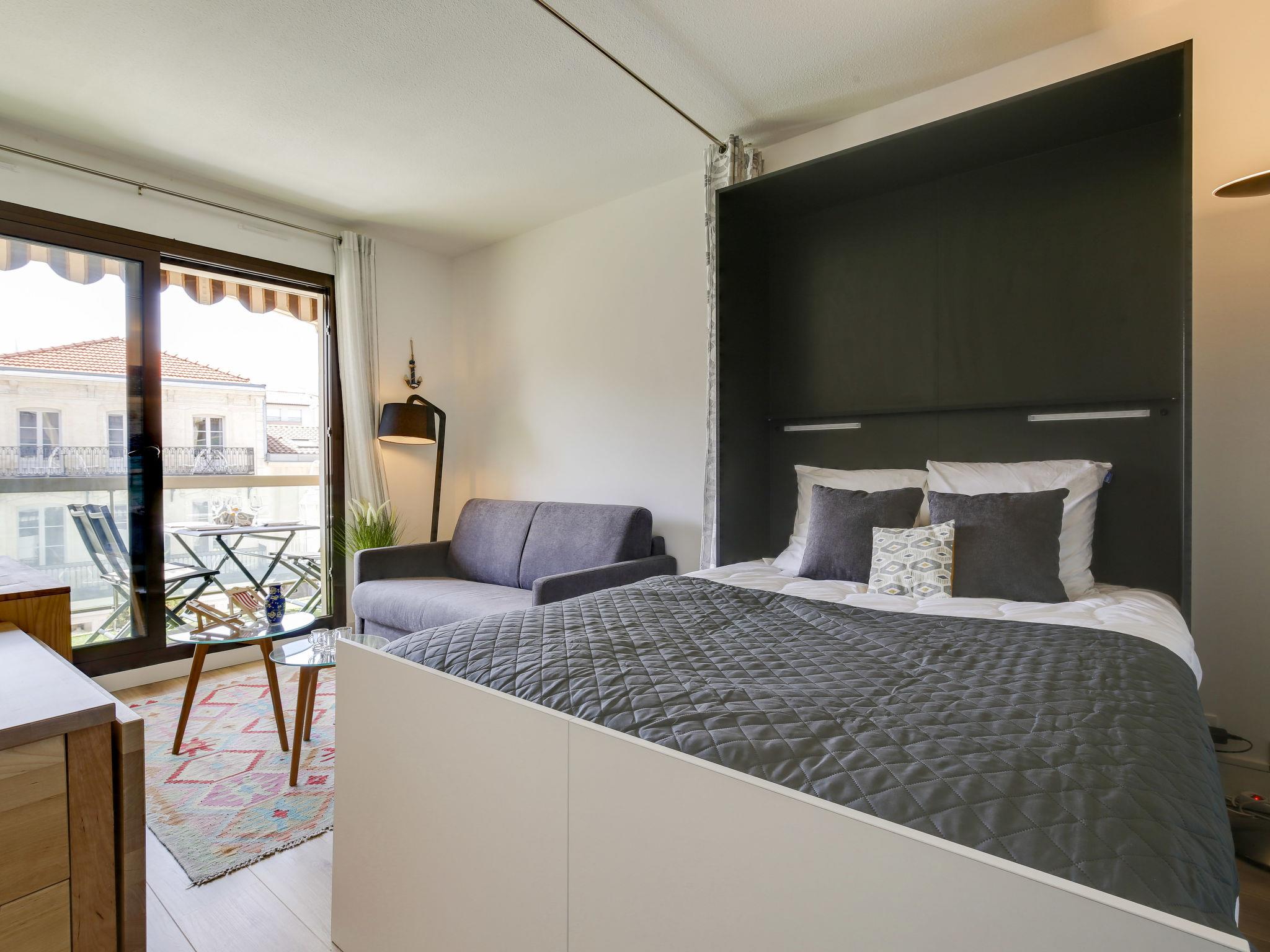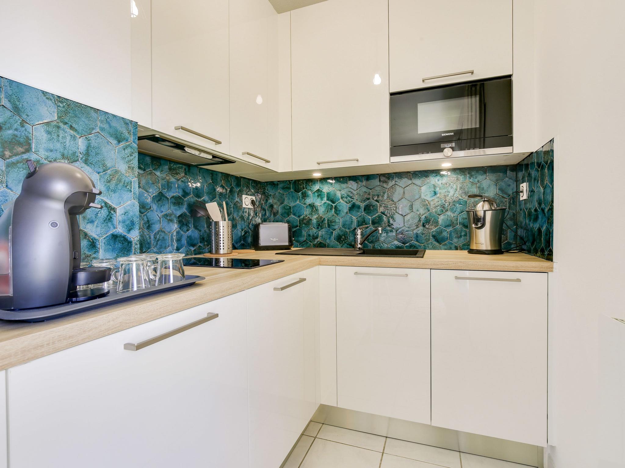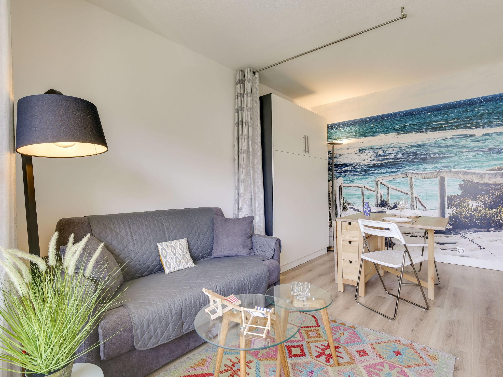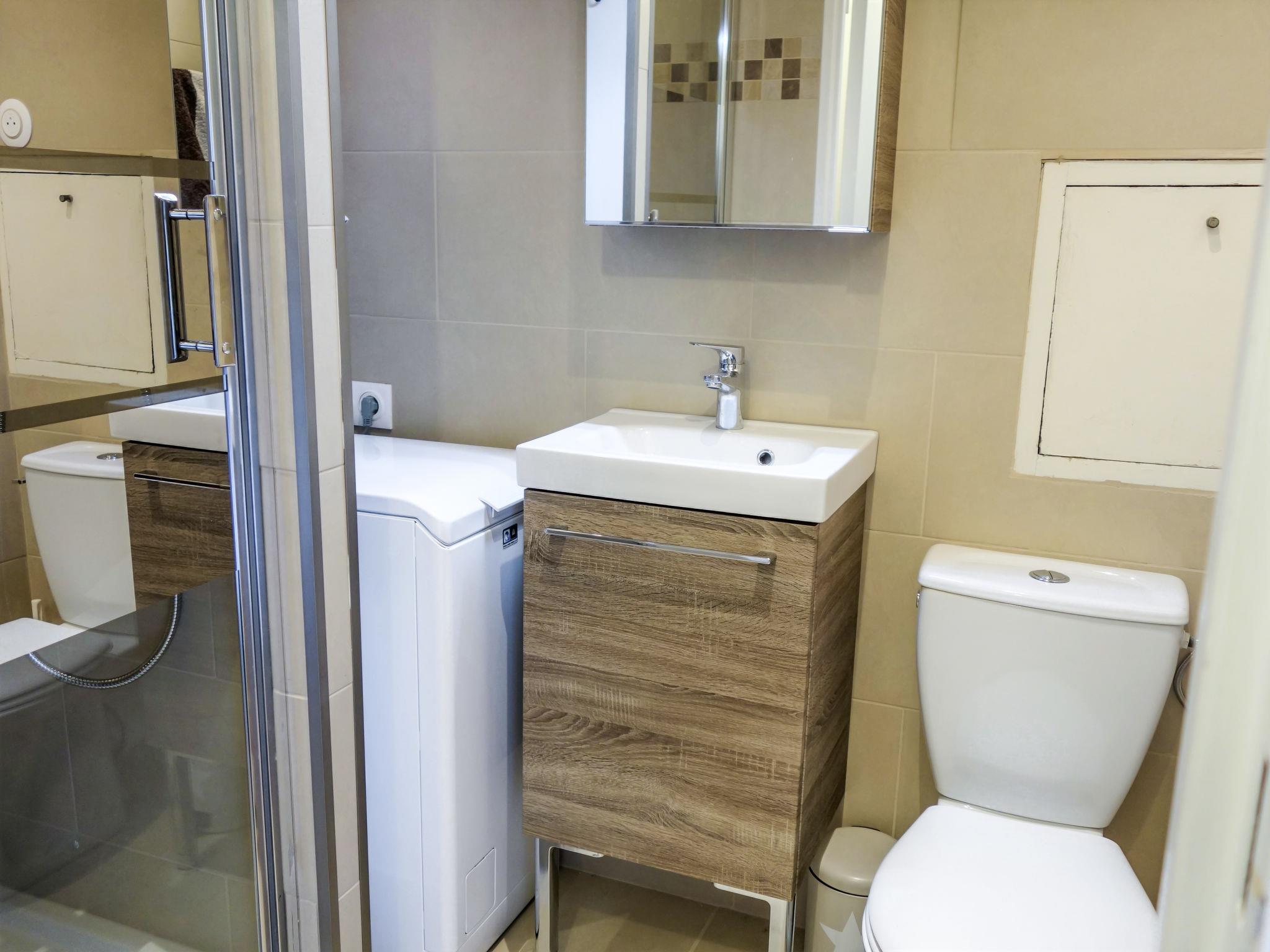 1-room studio 22 m2 on 2nd floor. Comfortable and beautiful furnishings: living/dining room with 1 double wall-trunk bed (1 x 140 cm, length 190 cm), TV (flat screen). Exit to the balcony. Open kitchen (dishwasher, 2 induction hot plates, toaster, kettle, microwave, electric coffee machine, Capsules for coffee machine (Dolce Gusto) extra). Shower/WC. Electric heating. Balcony 7 m2, south facing position. Balcony furniture. Facilities: washing machine, iron, hair dryer. Internet (WiFi, free). Parking space n 352. Please note: smoke alarm. 33009002335A0