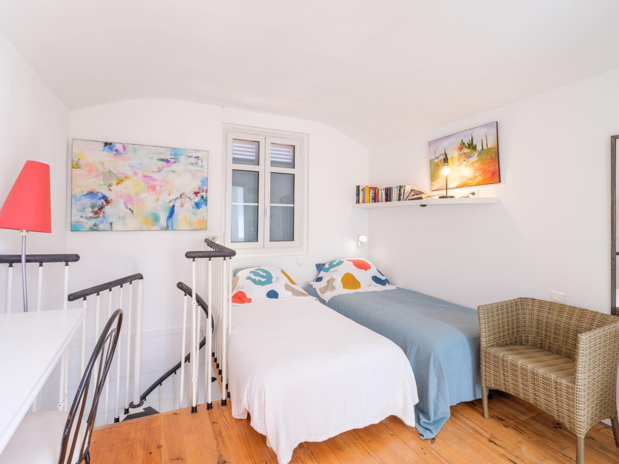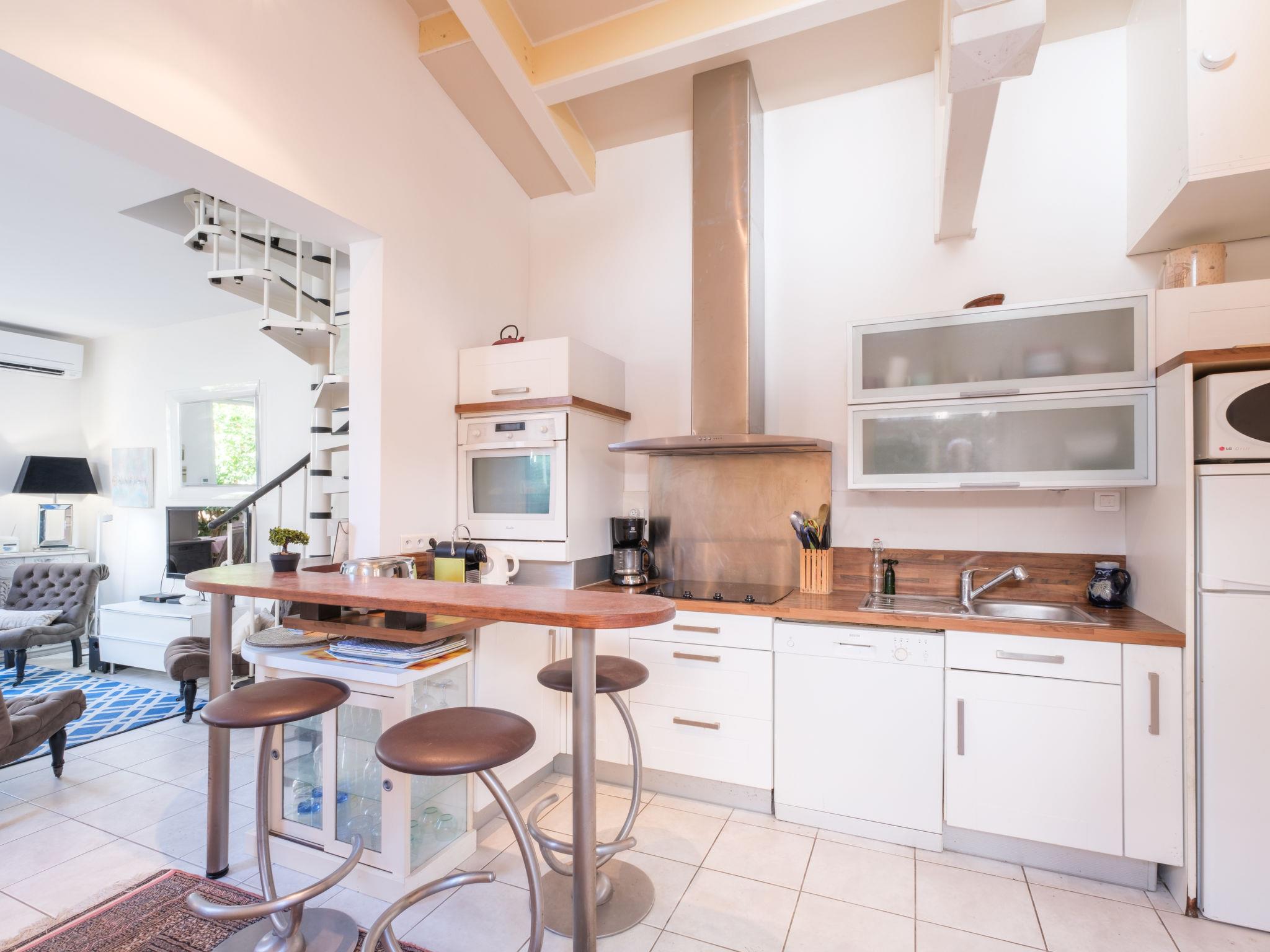 3-room house 62 m2 on 2 levels. Comfortable and beautiful furnishings: living/dining room with TV (flat screen), radio and air conditioning. Exit to the terrace. 1 room with 1 french bed (1 x 180 cm). Open kitchen (oven, dishwasher, 4 ceramic glass hob hotplates, toaster, kettle, microwave, freezer, electric coffee machine, Capsules for coffee machine (Nespresso) extra) with bar. Shower/WC. Upper floor: (spiral staircase), 1 room with 2 beds (90 cm, length 190 cm), shower and air conditioning. Exit to the balcony. Electric heating. Terrace 20 m2, south facing position. Terrace furniture, barbecue, deck chairs (1). Facilities: washing machine, iron, baby cot, hair dryer. Internet (WiFi, free). Please note: smoke alarm. Offer by a private individual according to Art. 155, IV of CGI. 33009002282B6