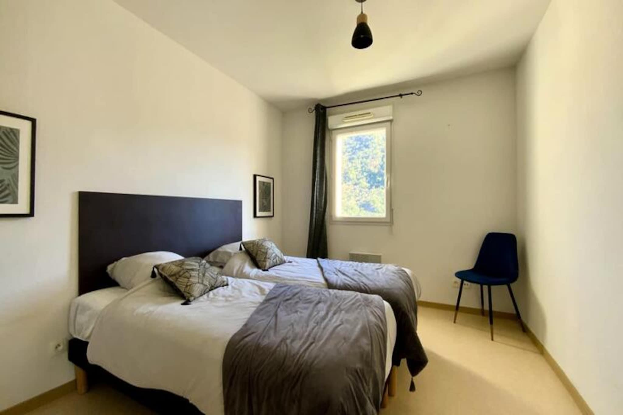 I hjertet av den regionale naturparken Haut-Languedoc, der Cévennes-fjellene møter den fredelige Øvre Orb-dalen, tilbyr denne sjarmerende leiligheten i andre etasje en rolig tilflukt, bare 10 minutters gange fra det berømte Avène Thermal Spa. Omgitt av frodige landskap og pittoreske stier, er det det perfekte tilfluktsstedet for både naturelskere og velværesøkere. Tenk deg å starte dagen med en spasertur gjennom den historiske landsbyen Avène, puste inn den friske fjelluften og avslutte den med et bad i det beroligende termiske vannet. Leiligheten er gjennomtenkt designet for komfort og bekvemmelighet, med en romslig åpen stue med et fullt utstyrt kjøkken, spiseplass og en koselig sovesofa. Store vinduer fyller plassen med naturlig lys, og utendørsterrassen inviterer deg til å slappe av med en kaffe eller nyte et måltid utendørs mens du nyter det omkringliggende grøntområdet. To soverom – ett med to enkeltsenger og et annet med køyeseng – gir rikelig med soveplasser for familier eller små grupper. Moderne fasiliteter som Wi-Fi, flatskjerm-TV og vaskemaskin sørger for et stressfritt opphold, mens sengetøy og håndklær er inkludert for din bekvemmelighet. Gå ut og oppdag en verden av eventyr. Fra fotturer rundt Avène-sjøen til å utforske de dramatiske Héric- og Colombières-sur-Orb-kløftene, tilbyr regionen utallige muligheter til å gjenopprette kontakten med naturen. Besøk den sjarmerende landsbyen Olargues, en av Frankrikes vakreste landsbyer, eller sykle gjennom vingårder og bølgende åser. For en forfriskende dukkert er svømmebassenget på stedet åpent i sommermånedene, og gir et perfekt sted å slappe av etter en dag med utforsking. Enten du søker en foryngende spa-ferie eller en aktiv ferie i det fri, tilbyr denne residensen det ideelle utgangspunktet for å skape varige minner i en av Frankrikes mest fortryllende regioner.
