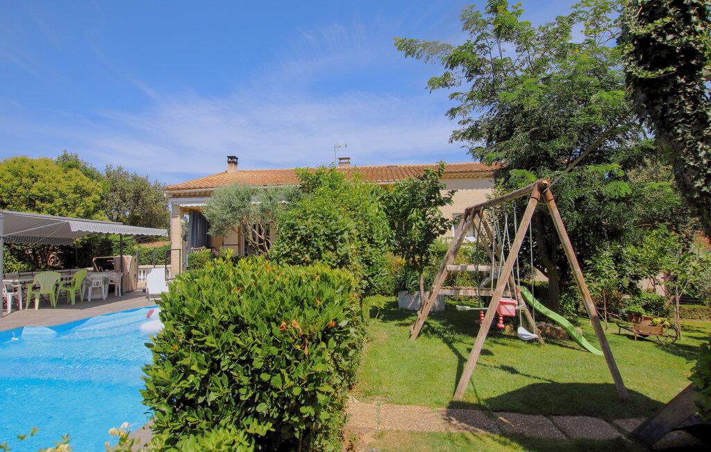 I den velstelte hagen finner du et vakkert, skjermet basseng og en koselig spiseplass i skyggen. Barna dine vil glede seg over trehytta og lekeplassen, mens du kan fordype deg i ferielesning eller tenne opp grillen.