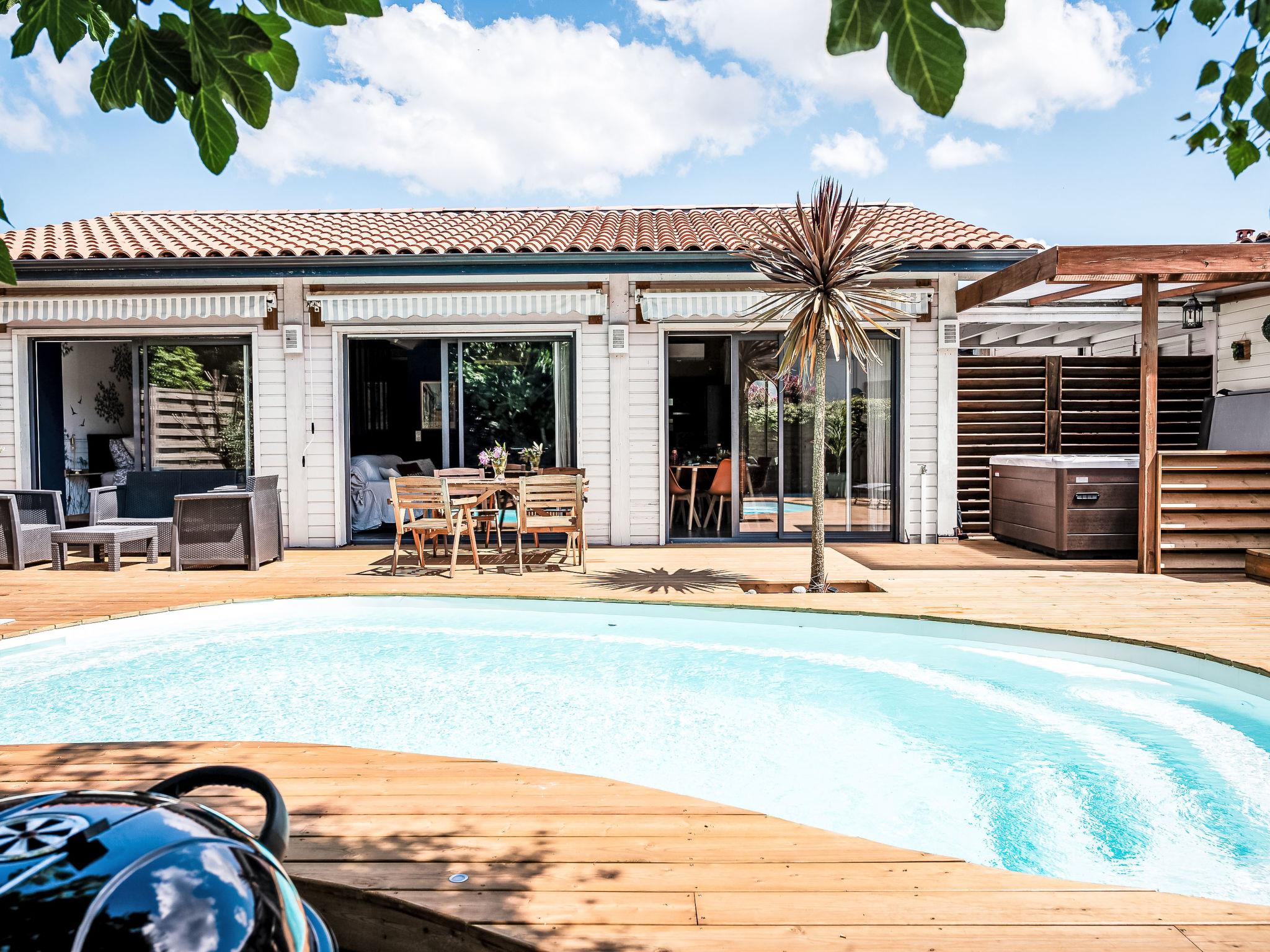 Ideally located a few minutes walk from the centre of Biscarosse Bourg and its amenities (shops, restaurants, market ...), close to the cycle tracks (which lead to the beach and even to the Dune du Pilat for the more sporty), this chalet has been designed to make you enjoy an unforgettable holiday. The solarium terrace equipped with deckchairs, a garden table and a barbecue will allow you to enjoy the beautiful summer days and evenings. The location is quiet and sunny, ideal for a relaxing holiday with family. The property was renovated in 2025, featuring a new hot tub with super-powerful jets, a renovated wooden deck and new flooring.