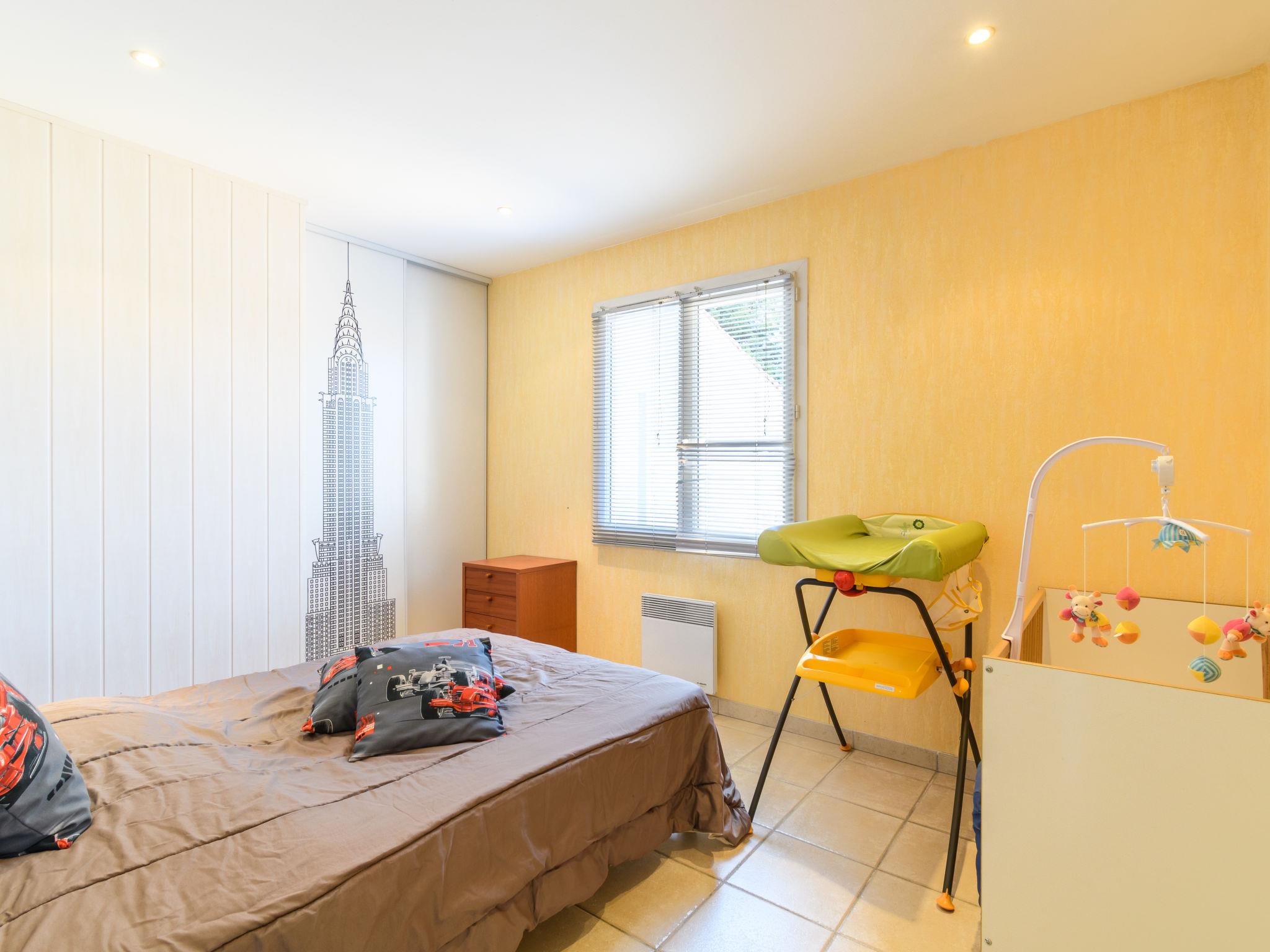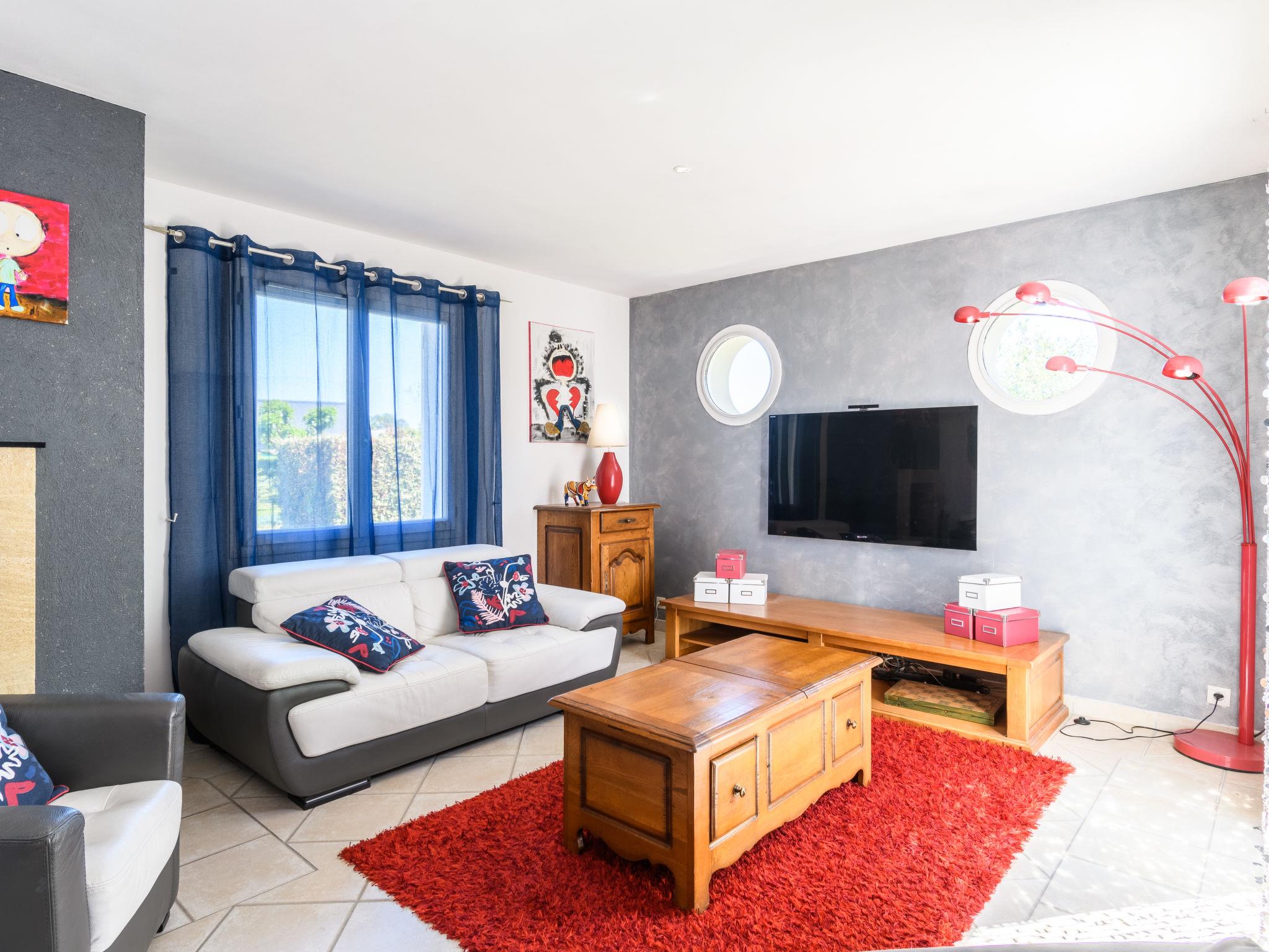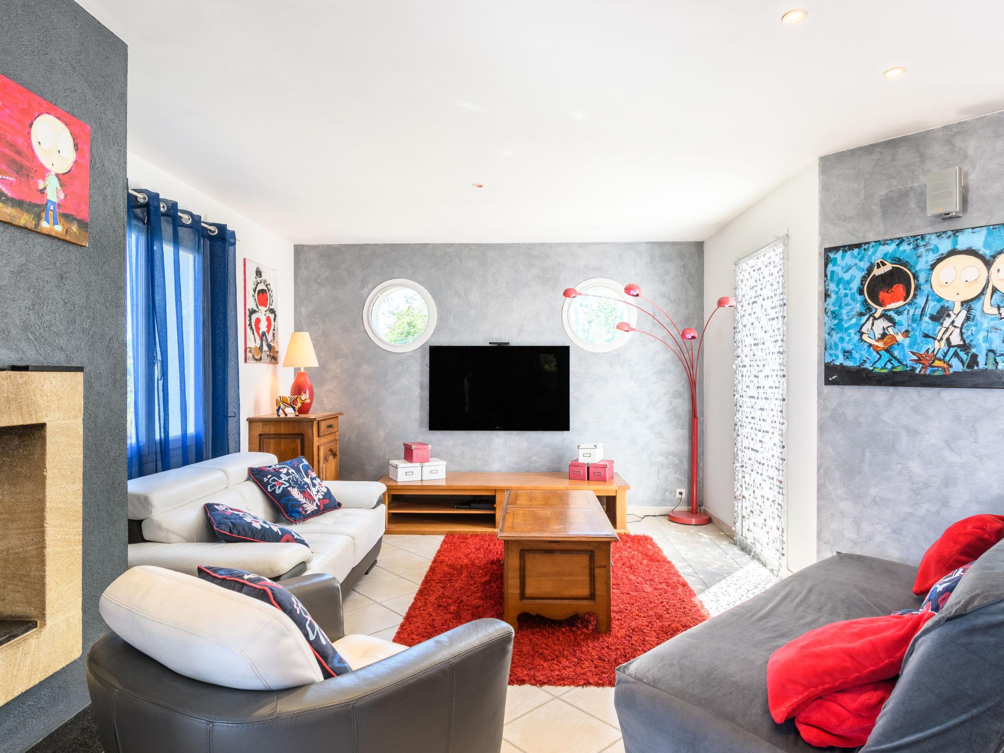 "La Clairière", 5-room house 140 m2. Beautiful and cosy furnishings: living/dining room with open-hearth fireplace (only for decoration), dining table, bar and satellite TV (flat screen). Exit to the terrace. 1 room with 1 double bed (2 x 80 cm, length 190 cm), TV. 2 rooms, each room with 1 french bed (140 cm, length 190 cm). 1 room with 1 french bed (160 cm, length 200 cm). Open kitchen (oven, dishwasher, 6 gas rings, toaster, kettle, microwave, freezer, electric coffee machine) with small dining table. Exit to the terrace. Bath/WC, shower, sep. WC, double hand-basin. Electric heating. Terrace partly roofed. Terrace furniture, barbecue (portable), deck chairs, box-room. Facilities: washing machine, dryer, iron, children's high chair, baby cot (extra). Internet (WiFi, free). Please note: non-smoking house. Smoke alarm.