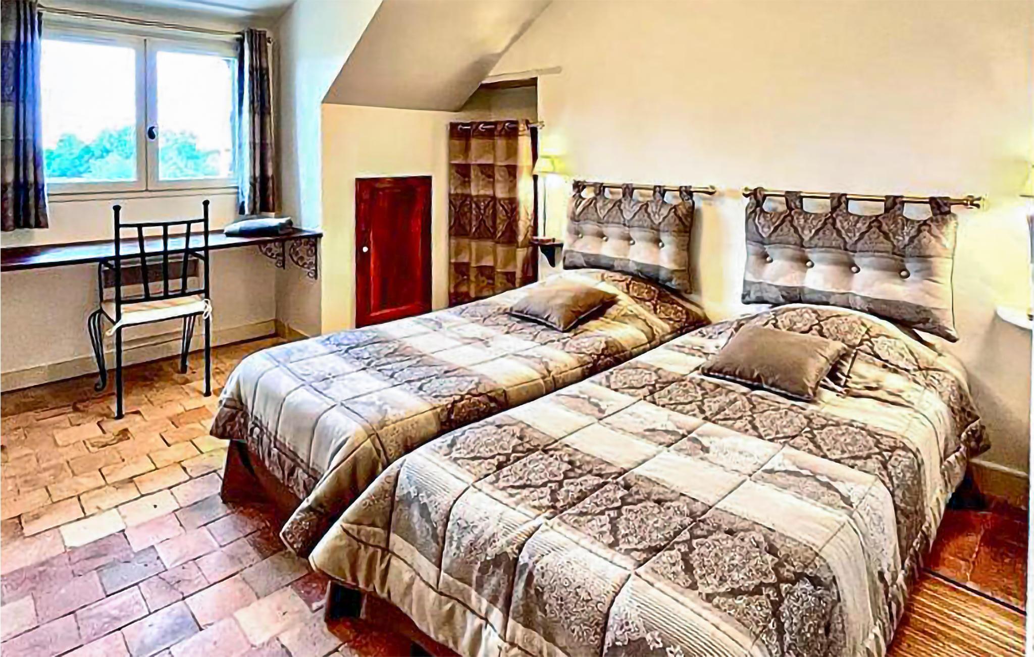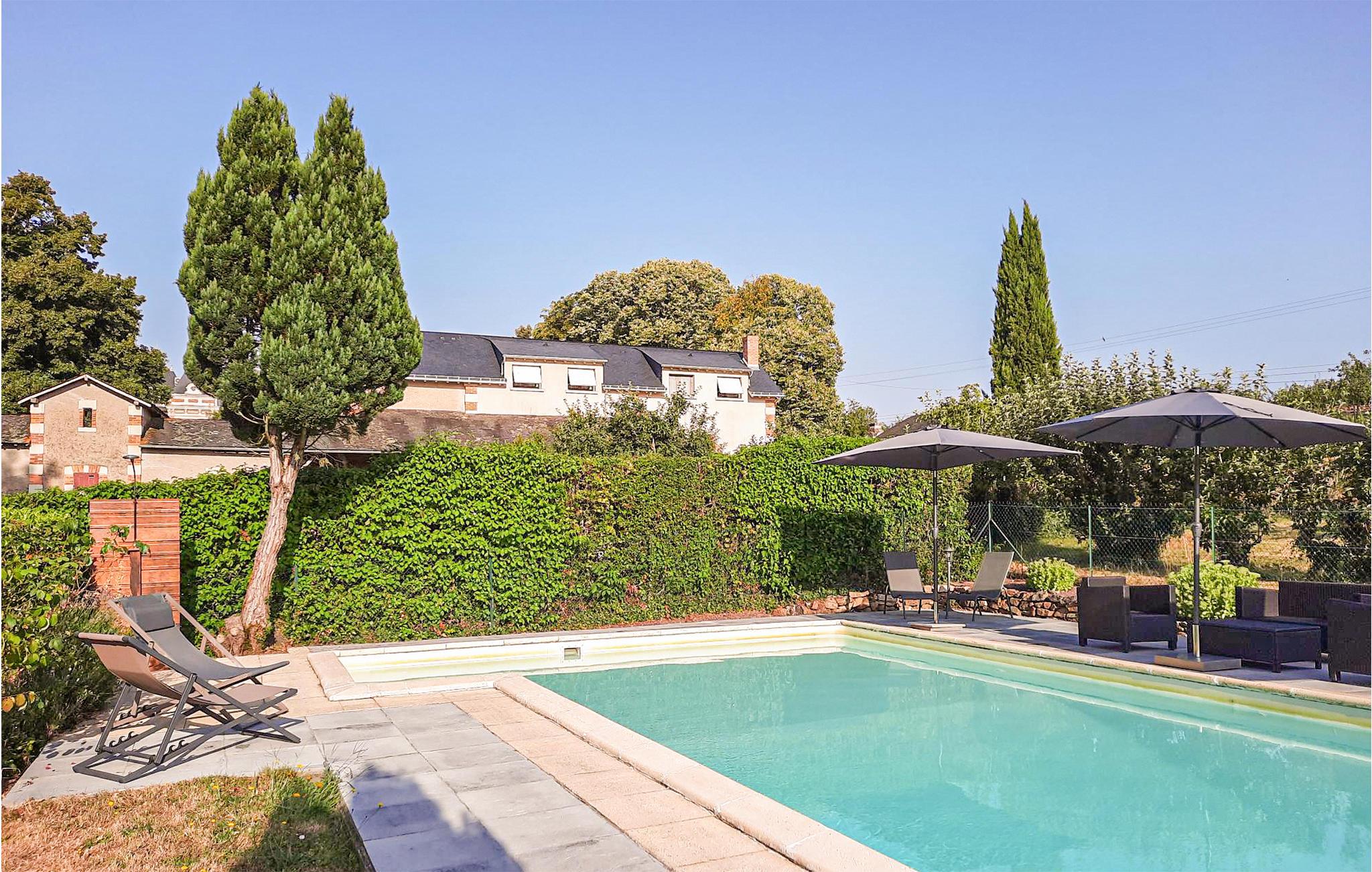 Dette pent møblerte og veldig komfortable feriehuset, som ønsker deg velkommen i en park med århundrer gamle trær, er uthuset til et slott fra 1800-tallet. I tillegg til stuen er det også et TV-område i første etasje. I uteområdet, som er avgrenset av murer, venter flere avslapnings- og rekreasjonsmuligheter på ferierende: overbygde hagemøbler, solsenger ved det oppvarmede bassenget ved siden av frukthagen og bord for piknik. Det er også en lekeplass og grill. Ta del i musikkfestivalen i Sablé og oppdag departementet Mayenne under en båttur på kanalene. Aktiviteter: Ridning, fotturer (fra landsbyen), tennis (1 km), golf, swinggolf, fiske og ulike vannsport. Attraksjoner: Middelalderlandsbyen Saint-Denis-d'Anjou, Laval, Sainte-Suzanne med et fantastisk utsiktspunkt, Meslay-du-Maine, kjent for sin hesteoppdrett, og klosteret Saint-Pierre de Solesmes. 14 km fra Sablé stasjon, som også betjenes av det franske høyhastighetstoget.