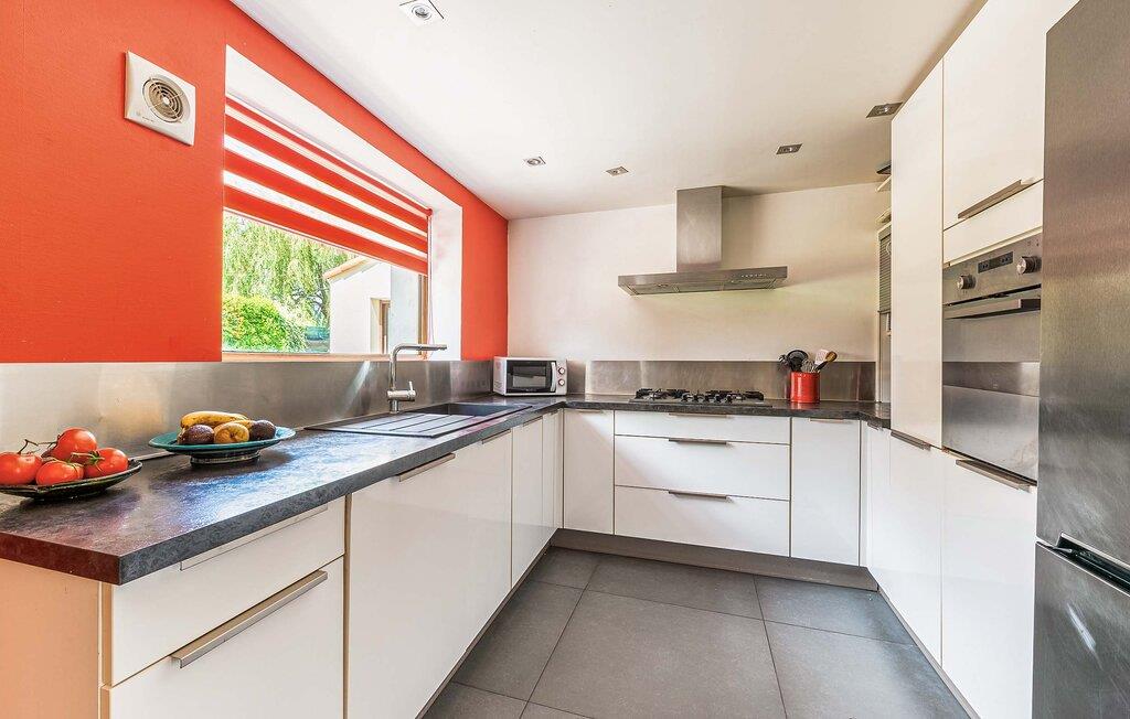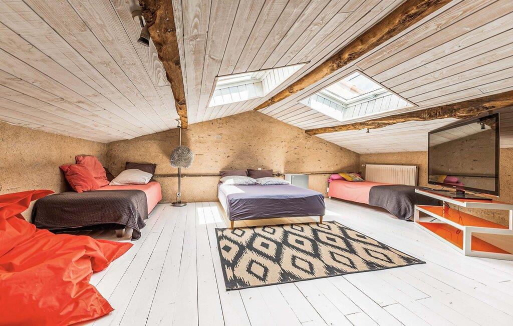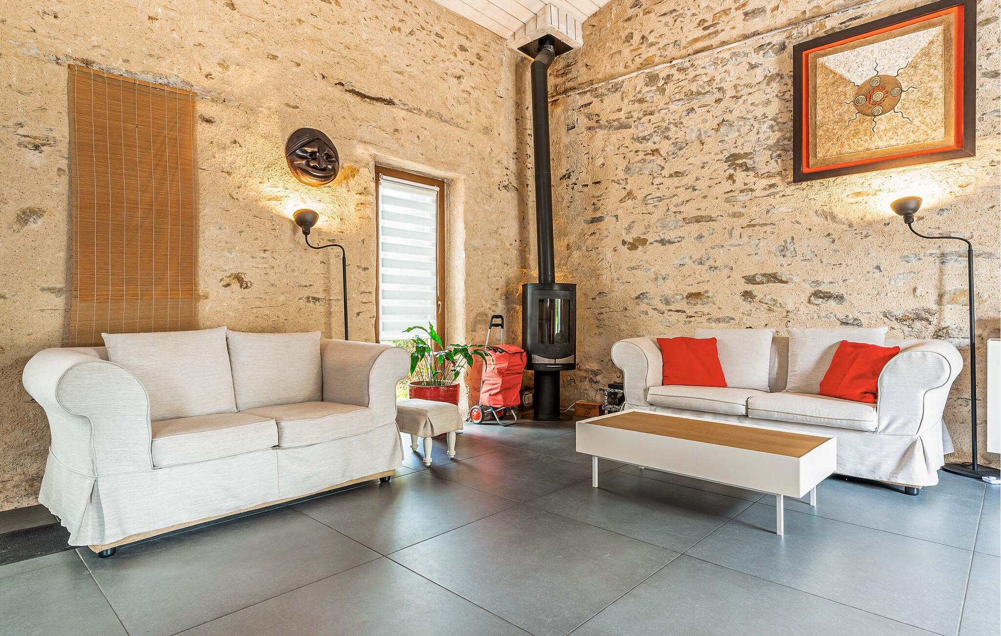 Slapp av i dette innbydende feriehuset og gå inn i den store katedrallignende stuen. Det høye taket, steinveggene, galleriet og den koselige atmosfæren er den ideelle rammen for hyggelige kvelder med peis og spill. Det velutstyrte kjøkkenet vil også friste deg til å nyte matlagingskvelder, og soverommene vil hjelpe deg til å slappe av.