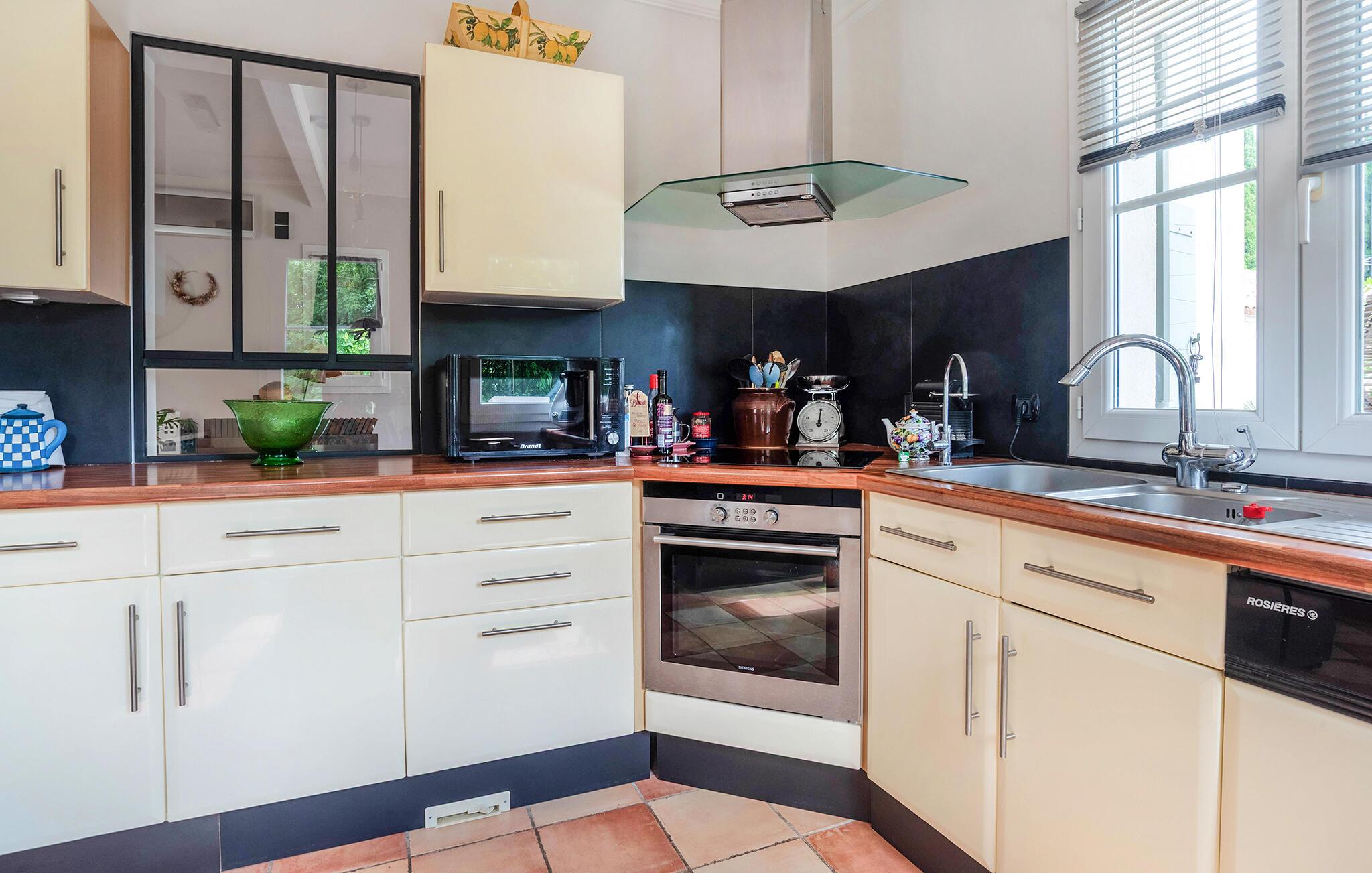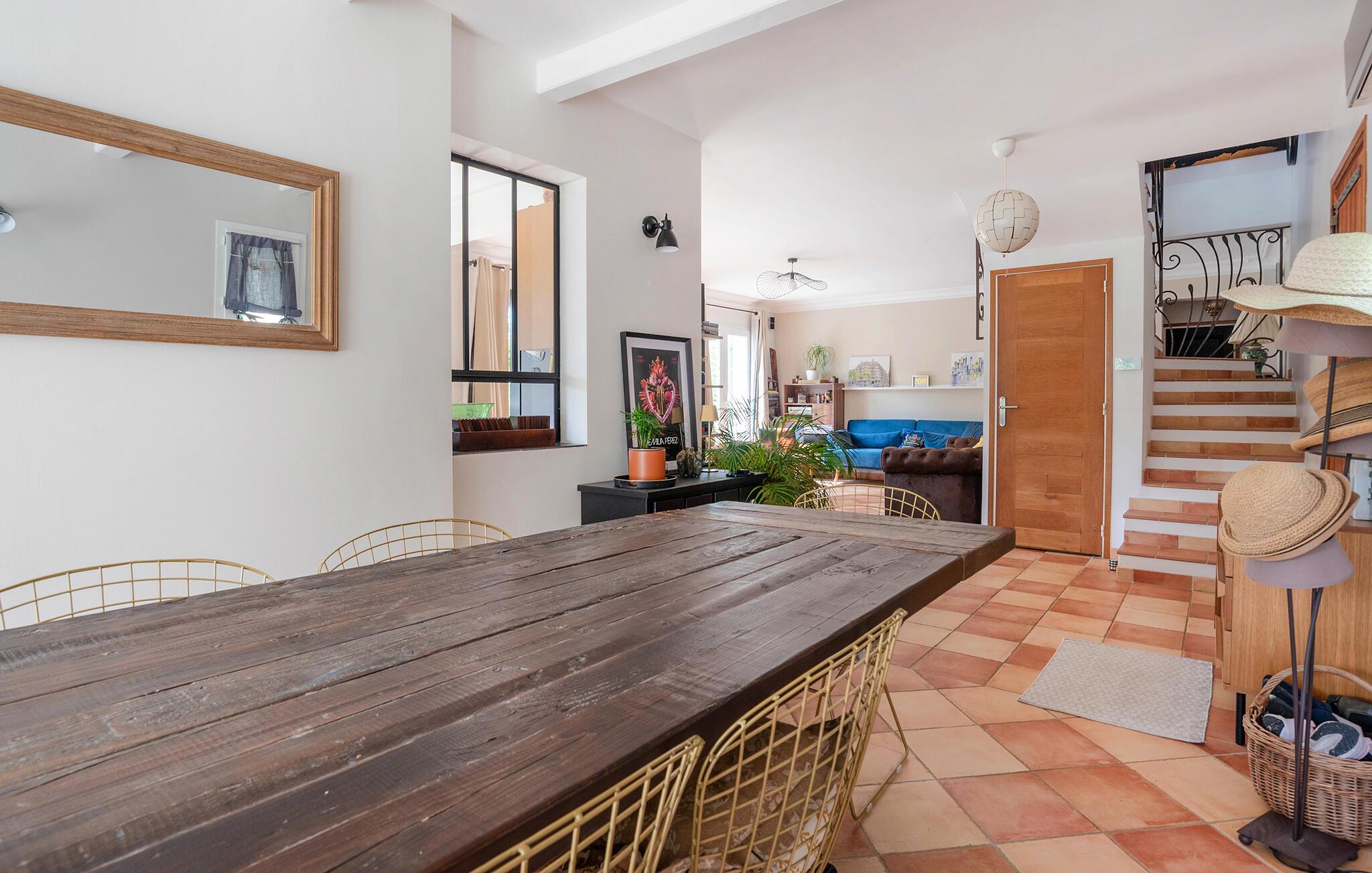 Nyt ferien i denne stilfulle villaen med rolig beliggenhet. Finn deg til rette i de koselig møblerte stuene. De lyse rommene med store vinduer kombinerer fransk sjarm med moderne komfort. Slapp av i de komfortable sofaene, se en film eller les en god bok. Den åpne spiseplassen er det perfekte stedet å avslutte dagen med et måltid sammen ved det store trebordet. Kjøkkenet gir deg muligheten til å tilberede dine favorittretter.
