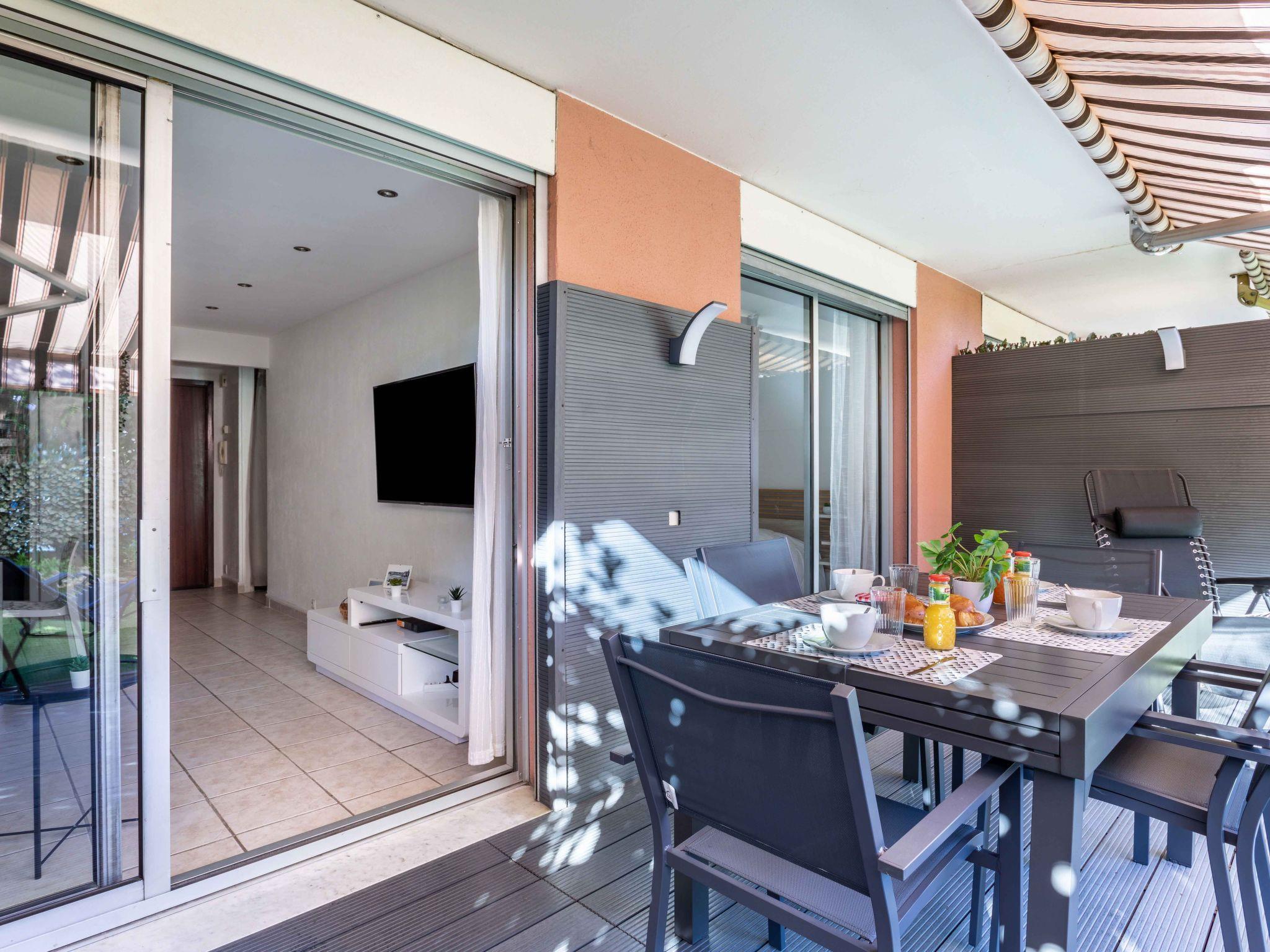 2-room apartment 40 m2, on the ground floor, south facing position. Bright, beautiful and modern furnishings: living/dining room with 1 sofabed (140 cm, length 190 cm), TV (flat screen), air conditioning. Exit to the garden, to the terrace. 1 room with 1 french bed (1 x 140 cm, length 190 cm). Exit to the garden, to the terrace. Open kitchen (oven, 3 induction hot plates, toaster, kettle, microwave, freezer, electric coffee machine). Shower/WC. Gas heating. Terrace 10 m2, south facing position, garden 80 m2, south facing position. Terrace furniture. View of the garden. Facilities: washing machine, iron, hair dryer. Internet (WiFi, free). Parking (1 car). Please note: smoke alarm. Offer by a private individual according to Art. 155, IV of CGI. 06027024724SB