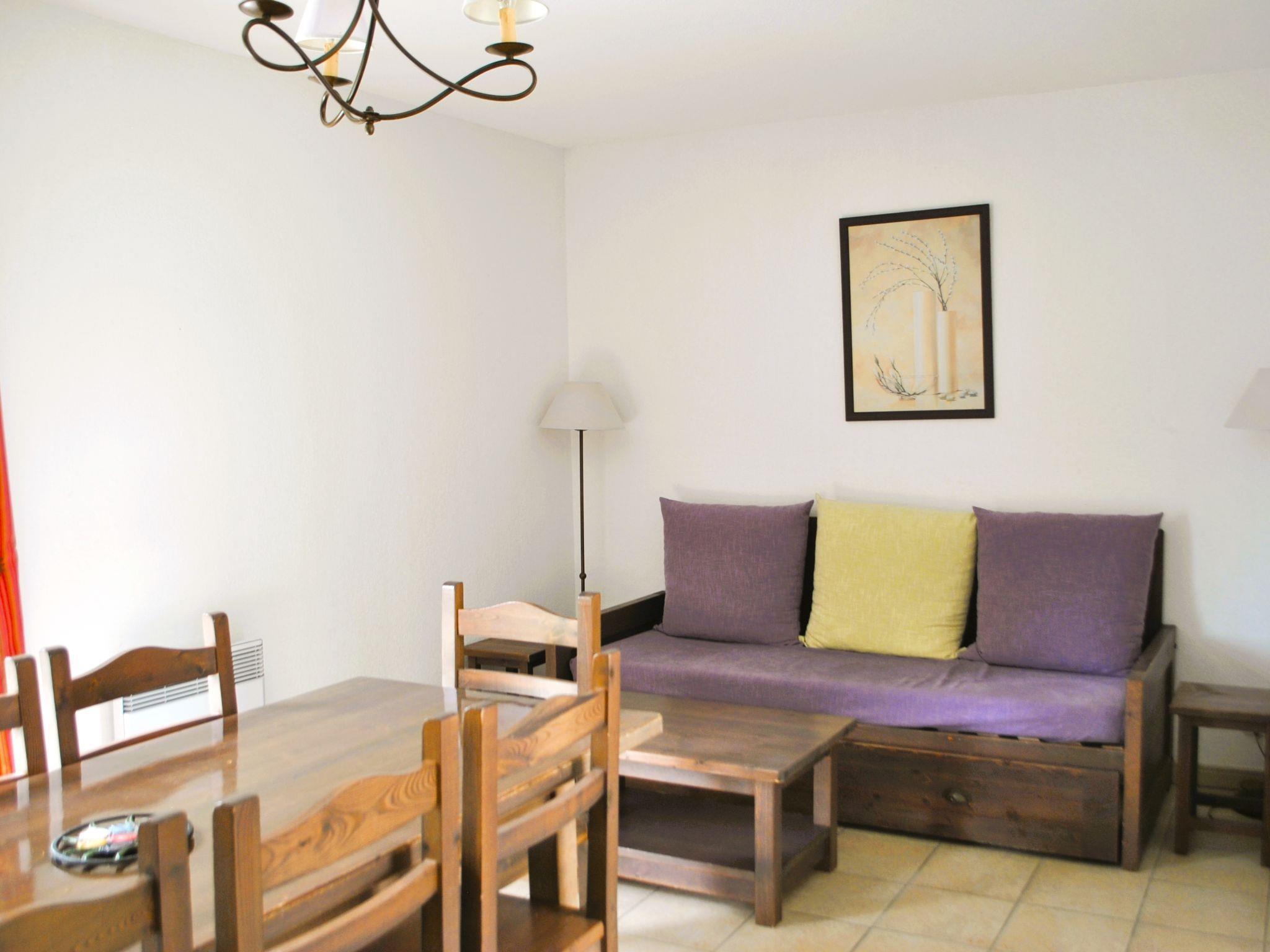 "Domaine des Cazelles", 3-room terraced house 45 m2 on 2 levels. Practical furnishings: living/sleeping room with 1 pull-out bed (2 pers. 2 x 90 cm), dining table and TV. Exit to the terrace. Kitchenette (4 hot plates, dishwasher, toaster, kettle, electric coffee machine, combination microwave). Sep. WC. Upper floor: 1 room with 1 french bed (length 190 cm). 1 room with 2 beds (80 cm, length 190 cm). Bath/WC. Electric heating. Terrace. Terrace furniture. Facilities: Internet (WiFi, extra). Maximum 2 pets/ dogs allowed.