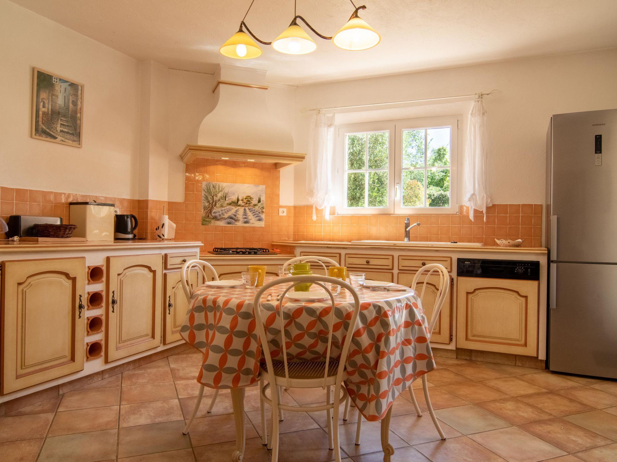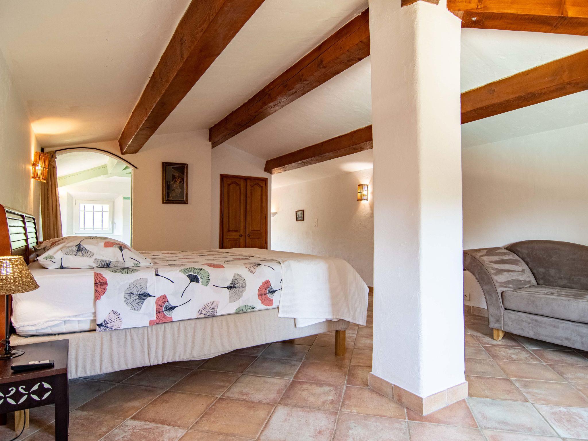 "Villa Gaïa", 5-room house 170 m2 on 2 levels. Comfortable and tasteful furnishings: large living room with open-hearth fireplace, dining table, satellite TV and DVD. Exit to the terrace. 1 room with 1 french bed (160 cm). Exit to the terrace. 2 rooms, each room with 2 beds. Kitchen (oven, dishwasher, 4 gas rings, toaster, kettle, microwave, freezer, electric coffee machine) with small dining table. Exit to the terrace. Bath/shower, sep. WC, double hand-basin. Upper floor: 1 open large room with sloping ceilings with 1 french bed (160 cm), shower/WC. Gas heating, underfloor heating. Large terrace partly roofed. Terrace furniture, barbecue, deck chairs (8). View of the swimming pool and the garden. Facilities: washing machine, iron, children's high chair, baby cot. Internet (WiFi, free). Please note: non-smoking house. Maximum 1 pet/ dog allowed. Smoke alarm. Access to the house via a 12-step staircase. When there are less than the maximum number of guests staying at the property, not all of the bedrooms will be available for use.