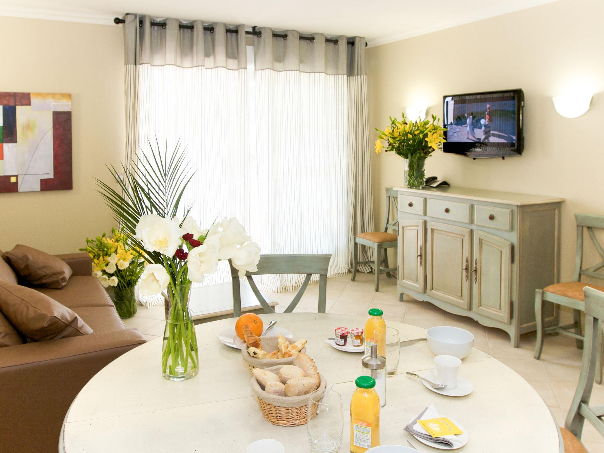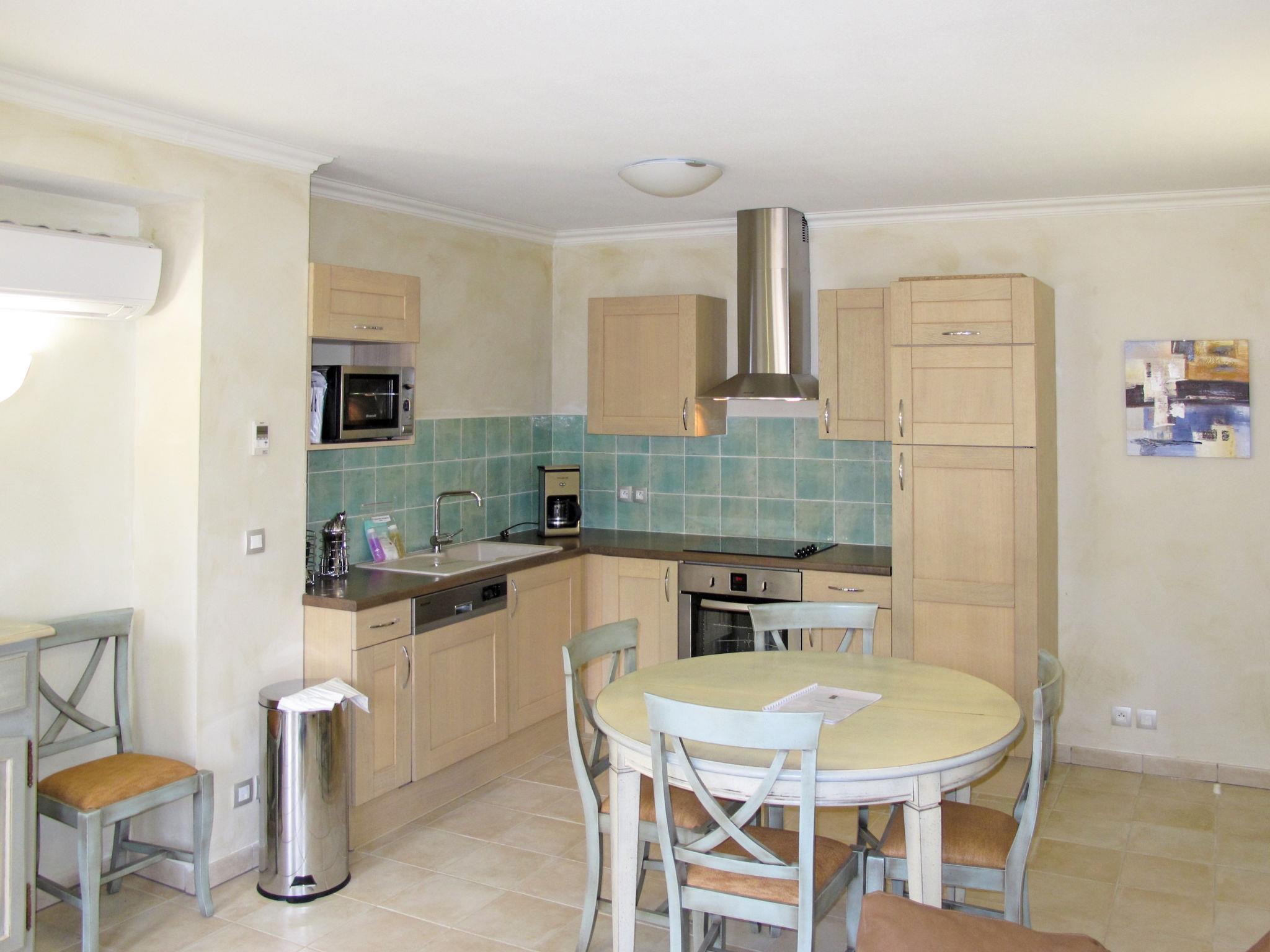 "Domaine de Camiole", 1-room apartment 20 m2. Tasteful furnishings: living/sleeping room with 2 sleeping facilities, dining table and satellite TV. Open kitchen (dishwasher, 2 ceramic glass hob hotplates, electric coffee machine, combination microwave). Bath or shower/WC. Heating, air-conditioning. Balcony. Balcony furniture. Facilities: Internet (WiFi, free). Please note: non-smokers only. Maximum 1 pet/ dog allowed. Smoke alarm, fire extinguisher. The property is one of a type of property or apartment.