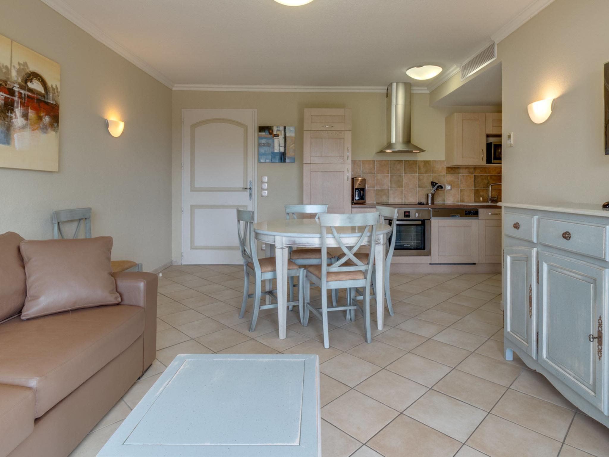 "Domaine de Camiole", 3-room apartment 46 m2. Tasteful furnishings: living/sleeping room with 1 double sofabed, dining table and satellite TV. 1 room with 1 french bed. 1 room with 2 sleeping facilities. Open kitchen (dishwasher, 4 ceramic glass hob hotplates, microwave, electric coffee machine). Sep. WC, bath or shower. Heating, air-conditioning. Facilities: Internet (WiFi, free). Please note: non-smokers only. Maximum 1 pet/ dog allowed. Smoke alarm, fire extinguisher.