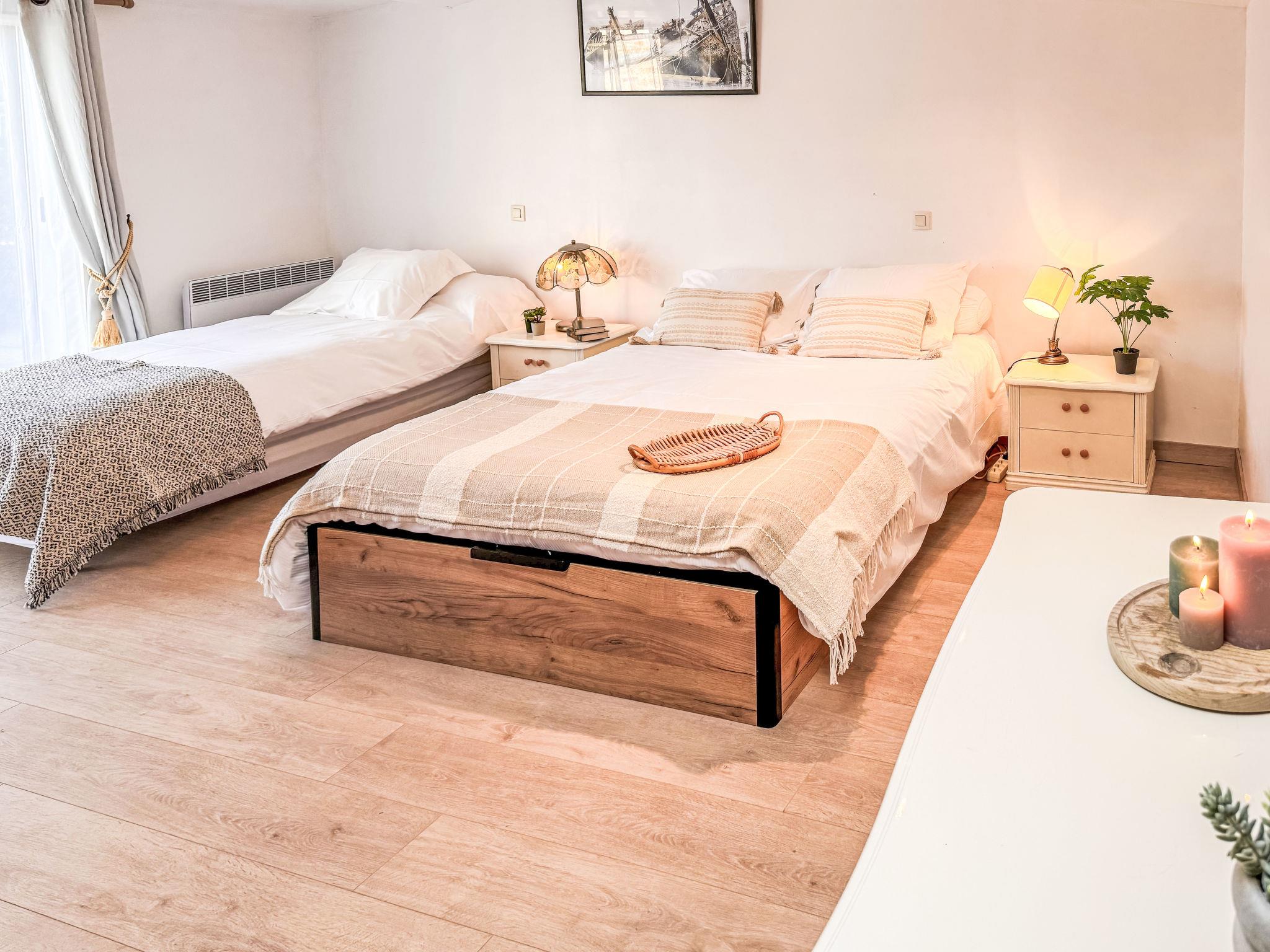 "La houle", 3-room house 90 m2 on 2 levels. Comfortable furnishings: living/dining room with veranda with TV (flat screen). Exit to the garden, to the terrace. 1 large room with 1 bed (90 cm, length 190 cm), 1 french bed (1 x 140 cm, length 190 cm). Exit to the terrace. Open kitchen (oven, dishwasher, 2 ceramic glass hob hotplates, toaster, kettle, microwave, freezer, grill, electric coffee machine). Shower, 2 sep. WC's, double hand-basin. Electric heating. Upper floor: 1 large room with 1 bed (90 cm, length 190 cm), 1 french bed (2 x 90 cm, length 190 cm), TV (flat screen). Large terrace 100 m2, south facing position, large garden, lawn. Terrace furniture, barbecue, deck chairs. Facilities: washing machine, iron, hair dryer. Internet (WiFi, free). Garage on the property. Please note: private entrance, smoke alarm. Offer by a private individual according to Art. 155, IV of CGI.