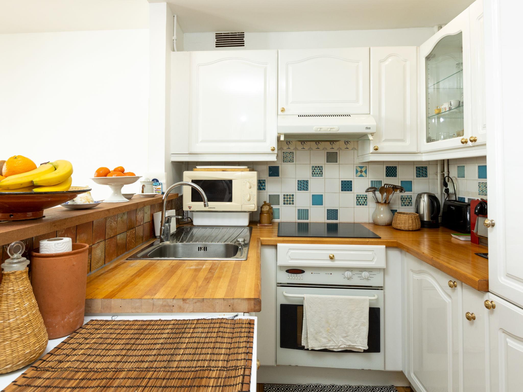 "L'Emeraude", 2-room apartment 55 m2 on 1st floor. Beautiful and modern furnishings: large living/dining room 30 m2 with 1 sofabed (140 cm, length 190 cm). 1 room with 1 french bed (1 x 140 cm, length 190 cm). Open kitchen (oven, dishwasher, 4 induction hot plates, toaster, kettle, microwave, electric coffee machine). Bathroom, sep. WC. Gas heating. Parquet floors. Terrace 12 m2. Terrace furniture. Very beautiful view of the sea and the port. Facilities: washing machine. Internet (WiFi, extra). Garage (1 car). Please note: non-smokers only. Smoke alarm. Offer by a private individual according to Art. 155, IV of CGI.