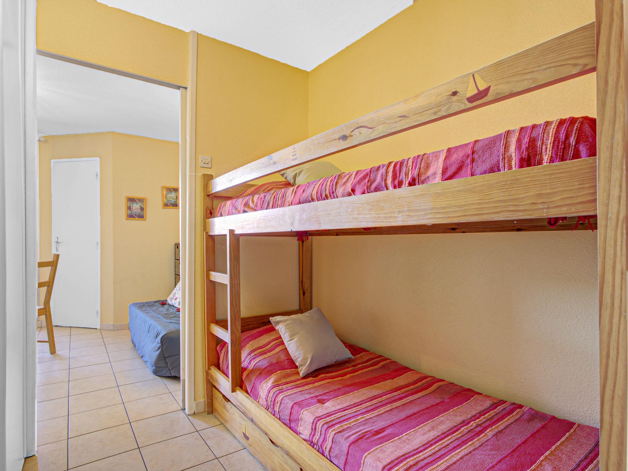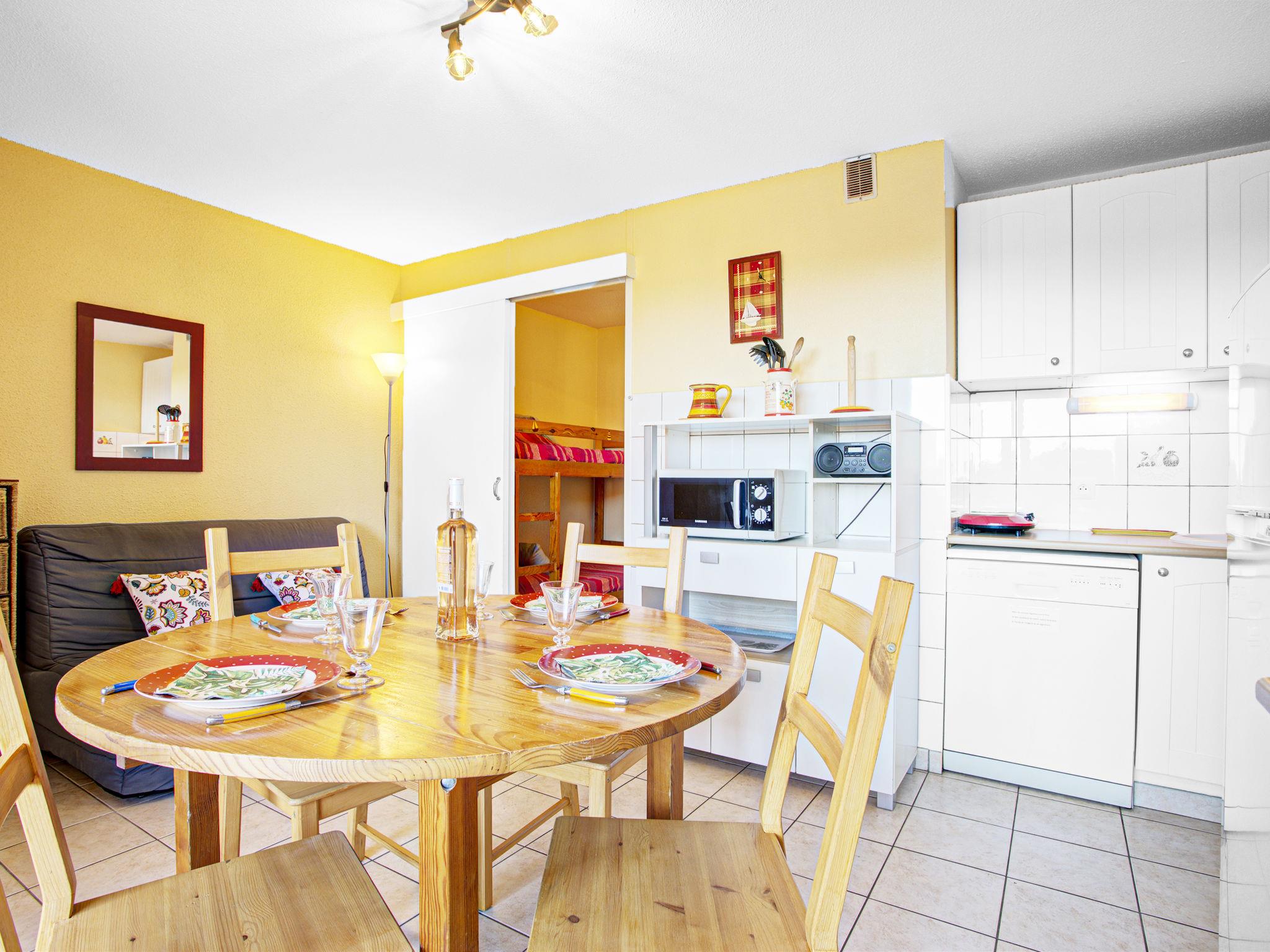 2-room apartment 25 m2 on 2nd floor. Beautiful furnishings: living/dining room with TV (flat screen). Exit to the balcony. 1 small room with 1 french bed (140 cm, length 190 cm). Entrance hall with 1 x 2 bunk beds (70 cm, length 190 cm). Kitchenette (2 hot plates, mini-oven, dishwasher, microwave, freezer, electric coffee machine). Shower/WC. Air-conditioning, forced-air heating. Balcony 5 m2, east facing position. Terrace furniture. Beautiful view of the swimming pool. Facilities: washing machine. Internet (WiFi, extra). Parking. Please note: smoke alarm, no lift.