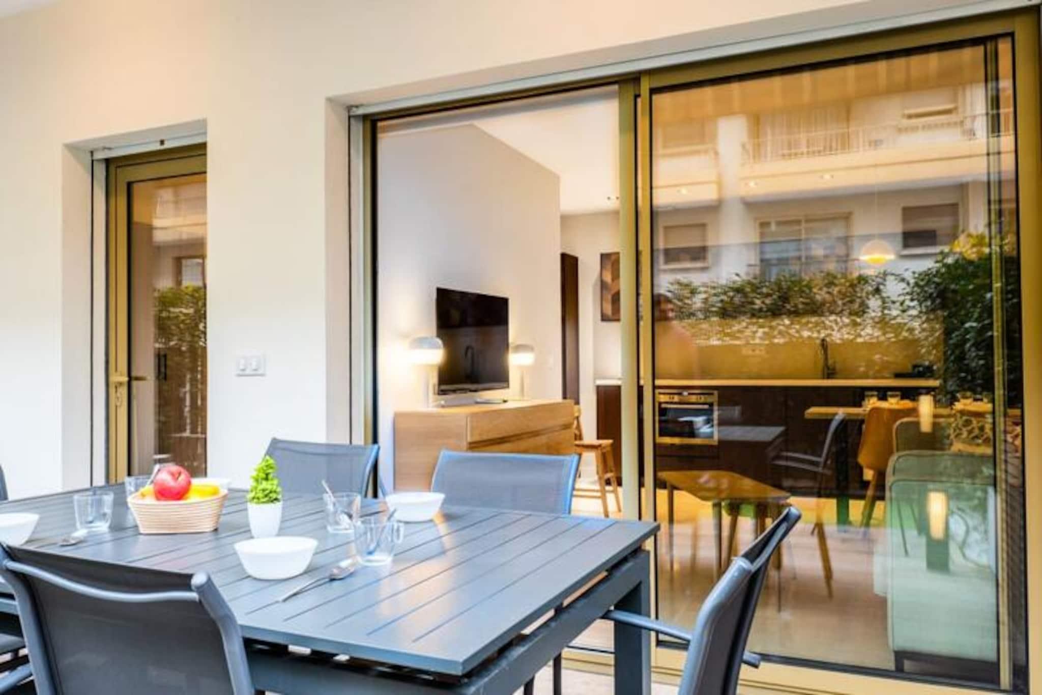 Tenk deg å tre inn i en fredelig oase i hjertet av Cannes, hvor moderne eleganse møter middelhavssjarm. Denne vakkert renoverte leiligheten på 50 m² tilbyr en rolig flukt midt i det pulserende sentrum. Med en privat terrasse og frodig hage befinner du deg bare noen øyeblikk unna den ikoniske Croisetten, den travle Rue d'Antibes og det verdensberømte Palais des Festivals, alt innen 10 minutters gange. Enten du er her for glamouren under filmfestivalen eller en avslappende ferie ved sjøen, er denne leiligheten din perfekte base. Innvendig er leiligheten gjennomtenkt designet for komfort og stil. Stuen har en koselig stue med smart-TV, spiseplass for fire og et fullt utstyrt åpent kjøkken som åpner ut mot den vestvendte hagen. Terrassen, komplett med spisebord for seks og hagemøbler, inviterer deg til å nyte solfylte lunsjer eller kveldscocktailer. Hovedsoverommet har en myk dobbeltseng, et garderoberom og en smart-TV, mens det andre soverommet har to køyesenger og god oppbevaringsplass. Et elegant dusjrom med vaskemaskin og et separat toalett fullfører plassen, noe som sikrer et praktisk og hyggelig opphold. Gå ut, og du er fordypet i det beste Cannes har å by på. Spaser langs Croisetten på bare ett minutt, handle i de elegante butikkene på Rue d’Antibes, eller nyt utsøkt mat på nærliggende restauranter som Le Cirque eller La Cantina. For cocktailer og livlige kvelder er Café Hoche et must. Palais des Festivals ligger bare 10 minutters gange unna, noe som gjør denne leiligheten ideell for både fritids- og forretningsreisende. Med gratis gateparkering, klimaanlegg, Wi-Fi og concierge-tjenester, er hver minste detalj vurdert for å gjøre oppholdet ditt uforglemmelig. Enten du er her for å utforske glamouren i Cannes eller bare slappe av i et fredelig hagetilfluktssted, tilbyr denne leiligheten det beste fra begge verdener.
