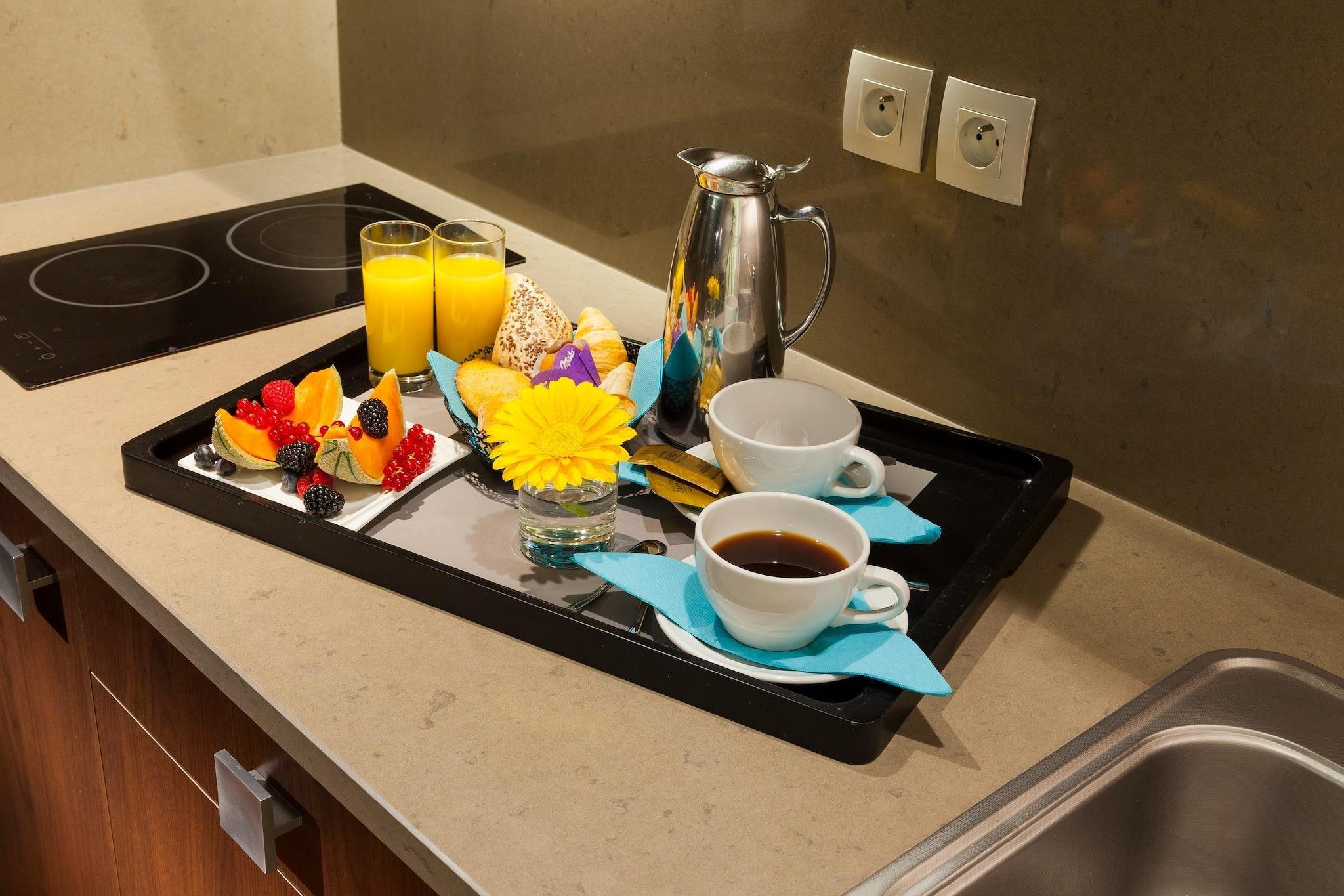 Enten du feirer bryllupsreise, jubileum eller bare en romantisk utflukt, er denne luksuriøse bryllupssuiten i Cannes det perfekte kystfristedet. Suiten er designet for par som verdsetter intimitet, komfort og et snev av glamour, og tilbyr et stilig rom på 33 m² med en king-size-seng, elegant interiør og en privat møblert terrasse på 20 m² – ideelt for å nippe til champagne under stjernene. Start morgenen med en fredelig frokost utendørs, og ta deretter bare noen få skritt til de gylne strendene på Croisetten. Ta en spasertur langs den berømte promenaden, kikk i designerbutikker, nyt lange lunsjer på kafeer ved vannkanten, eller utforsk Cannes' gamleby, Le Suquet, med sine brosteinsbelagte gater og vidstrakte havutsikt. Tilbake i suiten kan du slappe av på badet i spa-stil med dusj og et balneoterapi-badekar bygget for to. Avslapning og nytelse venter på det luksuriøse badet, komplett med både dusj og et balneoterapi-forsterket badekar – ideelt for en forfriskende morgen eller et beroligende kveldsbad. Den fullt utstyrte kjøkkenkroken, den elegante terrassen (20 m²) og det eksklusive... Fasiliteter som klimaanlegg, en 55-tommers 4K-TV med premiumkanaler, Nespresso-maskin, safe og høyhastighets-Wi-Fi forbedrer oppholdet ditt ytterligere. Strykejern, strykebrett, hårføner og til og med en barneseng (på forespørsel) sørger for bekvemmelighet og trygghet.