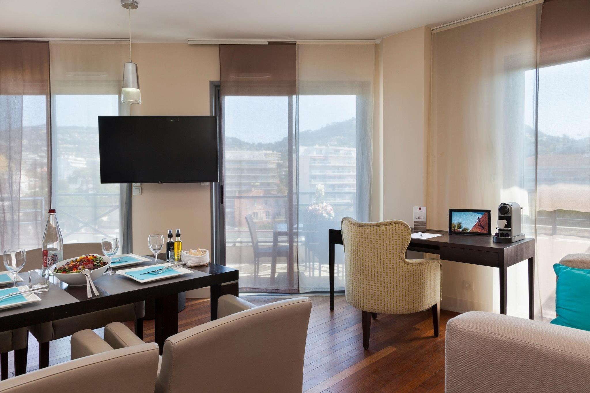 Denne romslige Executive-suiten med terrasse er et eksepsjonelt valg for familier, små grupper eller forretningsreisende som ønsker å nyte både elegansen og energien i Cannes i full komfort. Med 67 m² gjennomtenkt designet boareal tilbyr den to separate soveområder som kan konfigureres med enten dobbeltsenger eller enkeltsenger, samt en komfortabel sovesofa som er perfekt for opptil fem gjester. Enten du planlegger en familieferie, en gruppereis til filmfestivalen eller et lengre forretningsopphold, tilbyr denne suiten plassen og fleksibiliteten du trenger. Inne finner du alt for å gjøre oppholdet ditt uanstrengt: et elegant bad med både dusj og balneoterapibadekar for avslapning etter stranden, et fullt utstyrt kjøkken for hjemmelagde måltider og førsteklasses fasiliteter som klimaanlegg, høyhastighets Wi-Fi, en 55-tommers 4K-TV, Nespresso-maskin og rikelig med lagringsplass. Det er en praktisk og polert base for de som verdsetter bekvemmelighet uten å gå på kompromiss med stil. Det som virkelig skiller denne suiten fra andre er den fantastiske 70 m² store terrassen, din private utendørs lounge med sol, skygge og plass til å spise eller slappe av. Fra morgenkaffe med en sjøbris til kveldsdrinker under stjernene, utvider dette utendørsområdet boarealet ditt til middelhavsluften. Denne suiten ligger bare noen få minutter fra Croisetten, stranden og de pulserende handlegatene i Cannes, og er ideell for de som ønsker å utforske om dagen og trekke seg tilbake i luksus om natten.