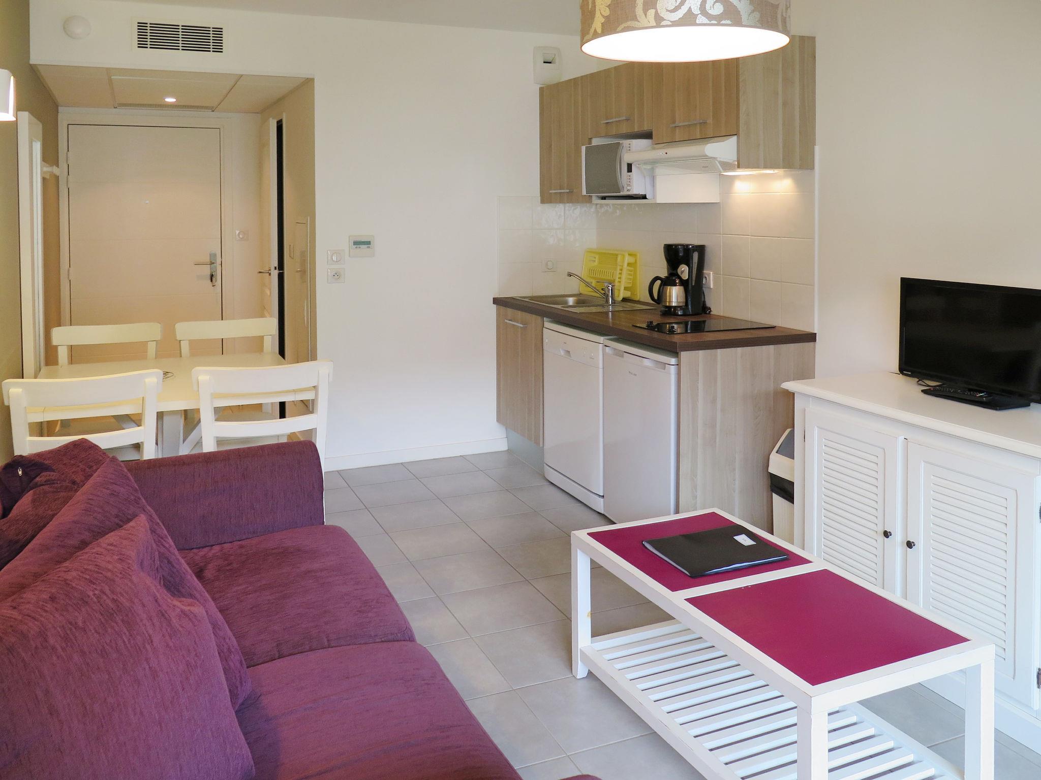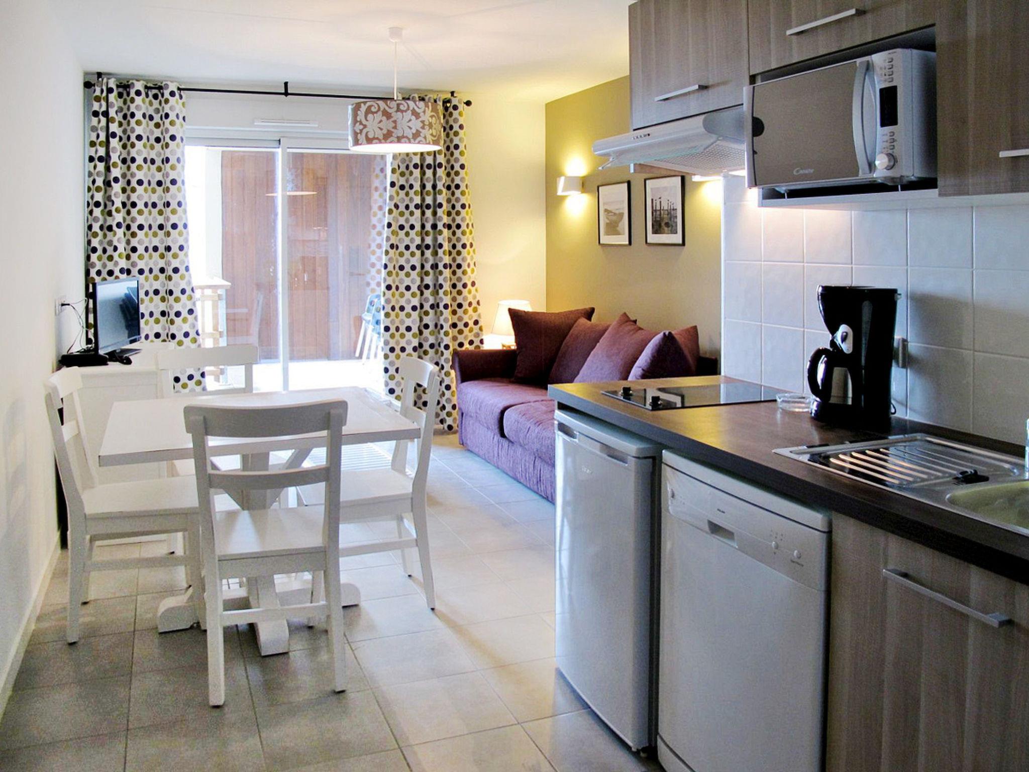 "L'Estacade", 2-room apartment 35 m2. Bright, practical furnishings: living/sleeping room with 1 double sofabed, dining table and TV. 1 room with 1 french bed (160 cm). Kitchenette (dishwasher, 2 ceramic glass hob hotplates, toaster, kettle, microwave, electric coffee machine). Bath/WC. Electric heating. Balcony or terrace. Terrace furniture, balcony furniture. Facilities: Internet (WiFi, extra). Please note: non-smokers only. Maximum 1 pet/ dog allowed. Smoke alarm, fire extinguisher. The property is one of a type of property or apartment.