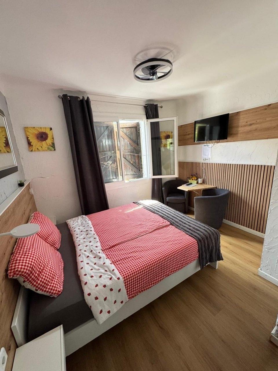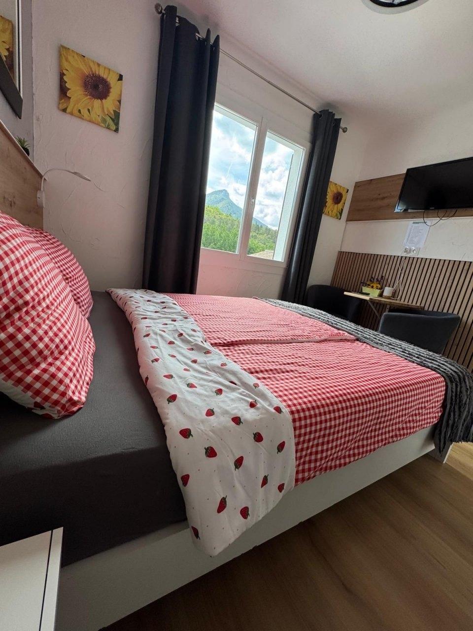 Unser Doppelzimmer-Basic bietet ein Doppelbett 160x200, großes Badezimmer mit Waschbecken, Dusche + WC, Garderobe, 2 Sessel die einen Sitzbereich bilden, Tisch, Smart-TV, Handtücher, Seife, Bettwäsche u. Haartrockner direkter Blick in die Berge.Unsere Chambres dhôtes hat vier Gästezimmer, ein Zimmer mit Balkon und ein Zimmer mit Wintergarten und Balkon Alle Zimmer können die große Terrasse nutzen Wir haben extra Parkplätz für Autos auch mit Anhänger und separate Motoradparkplätze.