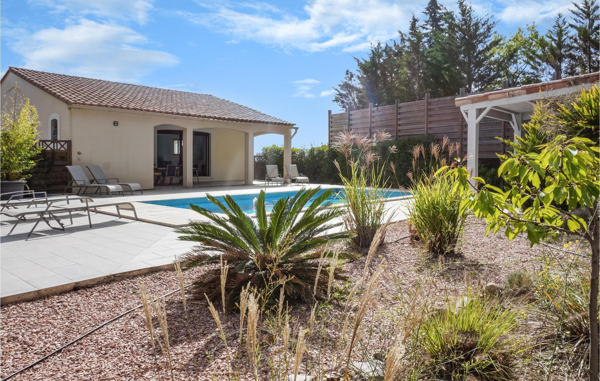 Dette vakre feriehuset med privat basseng venter på deg i Caunes-Minervois, i departementet Aude, 21 km fra den imponerende byen Carcassonne. Det komfortabelt møblerte huset er fullt klimatisert og har et privat svømmebasseng, som kan varmes opp på forespørsel og mot et gebyr, noe som gjør det til et hyggelig sted å tilbringe tid om våren og høsten. Bassenget er utstyrt med et automatisk deksel. Villaen er moderne og lys og har tre soverom, alle med eget bad. Fra balkongen i øverste etasje er det en fantastisk utsikt over Minervois-landskapet. Eiendommen, som ligger i en skråning av Black Mountain, garanterer tilstrekkelig privatliv. Caunes-Minervois er en vakker middelalderlandsby i gangavstand fra huset, med flere butikker, kafeer og en lekeplass for barn. Notre Dame du Cros ligger en 30-minutters spasertur unna for klatring og fotturer, og det er bare en 25-minutters kjøretur til Carcassonne, hvis hovedattraksjon, Cité de Carcassonne, har blitt erklært som UNESCOs verdensarvliste. Spaser gjennom Carcassone til fots eller oppdag byen fra taubanen eller en hestevogn. Gourmeter kan glede seg til det occitanske kjøkkenet og må prøve den berømte cassouleten (bønnestuing). Langs Canal du Midi, som forbinder Toulouse med Sète, kan du ta en veldig fin sykkeltur eller spasertur og selvfølgelig bli med på en båttur.
