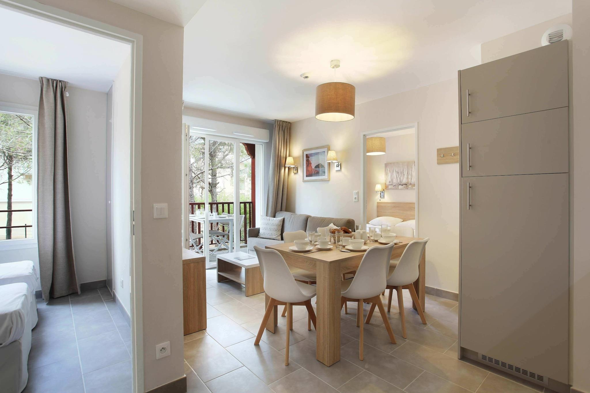 Moderne sjarm ved sjøen Résidence Les Canissons presenterer et friskt og innbydende tilfluktssted i hjertet av Cavalaire-sur-Mer, kun 800 meter fra den vidstrakte sandstranden. Denne moderne, mellomstore boligen har stilige leiligheter som er nøye innredet for komfort og bekvemmelighet. Hver enhet har en velutstyrt kjøkkenkrok og en overbygd balkong eller terrasse med hagemøbler, perfekt for å nyte morgenkaffen eller slappe av med utsikt over solnedgangen. Enten du reiser alene, som et par eller med familie, gir disse lyse, luftige leilighetene den ideelle hjemmebasen for din provençalske ferie. Utforsk den livlige Saint-Tropez-bukten Residensen ligger i en livlig kystby, og plasserer deg nær det beste fra Var-regionen. Vandre i den sjarmerende havnen i Cavalaire-sur-Mer, sol deg på uberørte strender, eller ta en kort kjøretur til ikoniske Saint-Tropez med sine travle markeder og historiske gater. Friluftselskere vil sette pris på nærliggende turstier gjennom det naturskjønne Massif des Maures, hvor duftende furuskoger og fantastiske kystpanoramaer venter for å inspirere eventyrene dine. Nyt de lokale smakene Oppdag de autentiske smakene fra Sør-Frankrike på lokale favoritter som La Marine og L'Escale, feiret for sin ferske sjømat og regionale spesialiteter. De livlige kafeene og bistroene ved vannkanten gir innbydende rom for å nyte provençalske viner og lette retter, og bringer essensen av Middelhavet til bordet ditt.