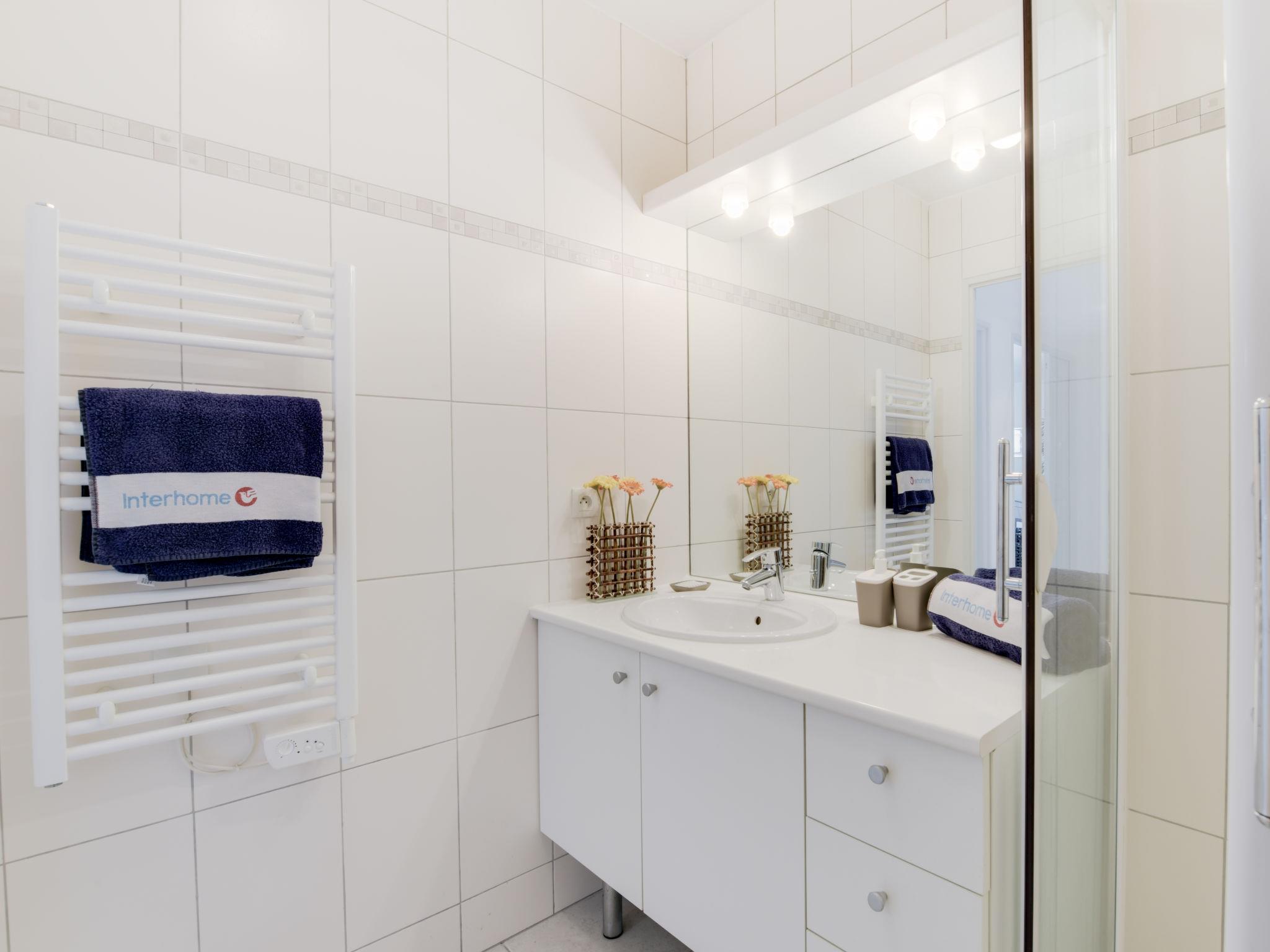 2-room apartment 41 m2 on 3rd floor. Comfortable furnishings: living/dining room with 1 double sofabed (1 x 140 cm, length 190 cm), TV (flat screen). Exit to the terrace. 1 room with 1 french bed (1 x 140 cm, length 190 cm). Exit to the terrace. Open kitchen (oven, dishwasher, 3 ceramic glass hob hotplates, toaster, kettle, microwave, freezer, electric coffee machine). Shower, sep. WC. Air-conditioning, forced-air heating. Terrace 10 m2, roofed, north facing position and west facing position. View of the countryside. Facilities: washing machine, iron, hair dryer. Internet (WiFi, extra). Parking space n 99 (roofed), height 240 cm, width 240 cm. Please note: smoke alarm. Depth 460 cm. FR8430.170.1