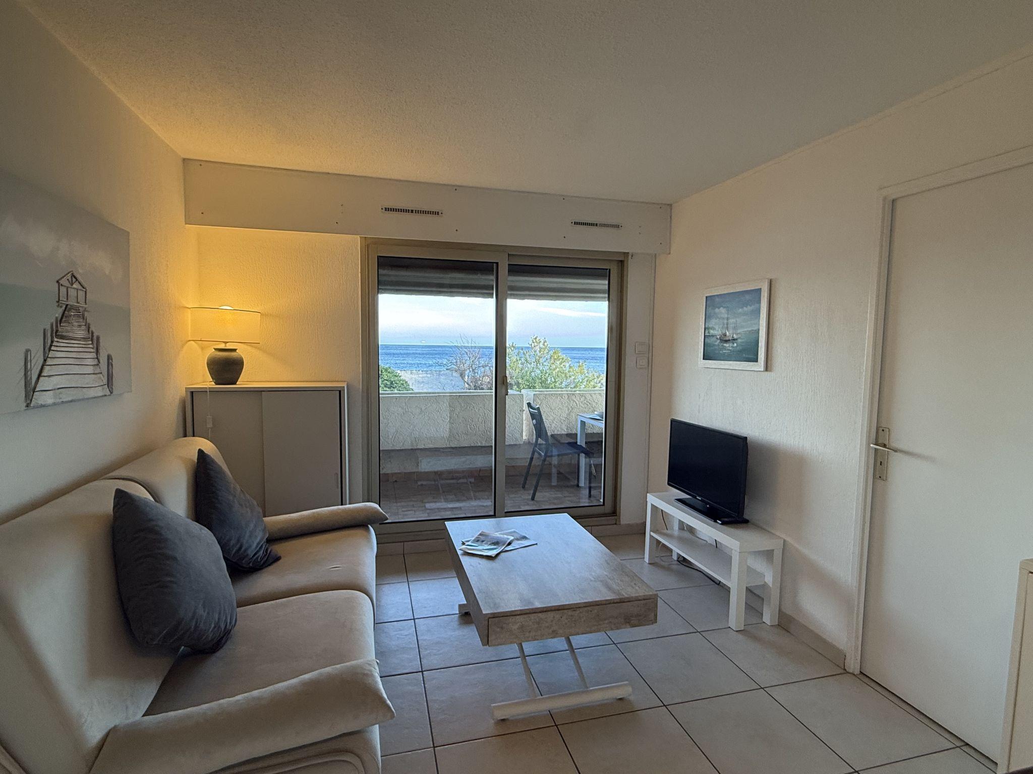 3-room apartment 35 m2 on 1st floor, south facing position. Practical and comfortable furnishings: living/dining room with panoramic window with 1 double sofabed (1 x 140 cm, length 190 cm), TV (flat screen), air conditioning and electric shutters. Exit to the terrace. 1 room with panoramic window with 1 french bed (1 x 140 cm, length 190 cm), electric heater. Exit to the terrace. 1 room with 1 x 2 bunk beds (80 cm, length 190 cm), electric heater. Open kitchen (oven, dishwasher, 3 ceramic glass hob hotplates, toaster, kettle, microwave, freezer, electric coffee machine). Shower, sep. WC. Electric heating, boiler (100 litres). Terrace 11 m2, south facing position. Terrace furniture, deck chairs (2). Beautiful view of the sea. Facilities: washing machine. Internet (WiFi, extra). Parking space n 15 (fenced). Please note: TV only FR. Smoke alarm.