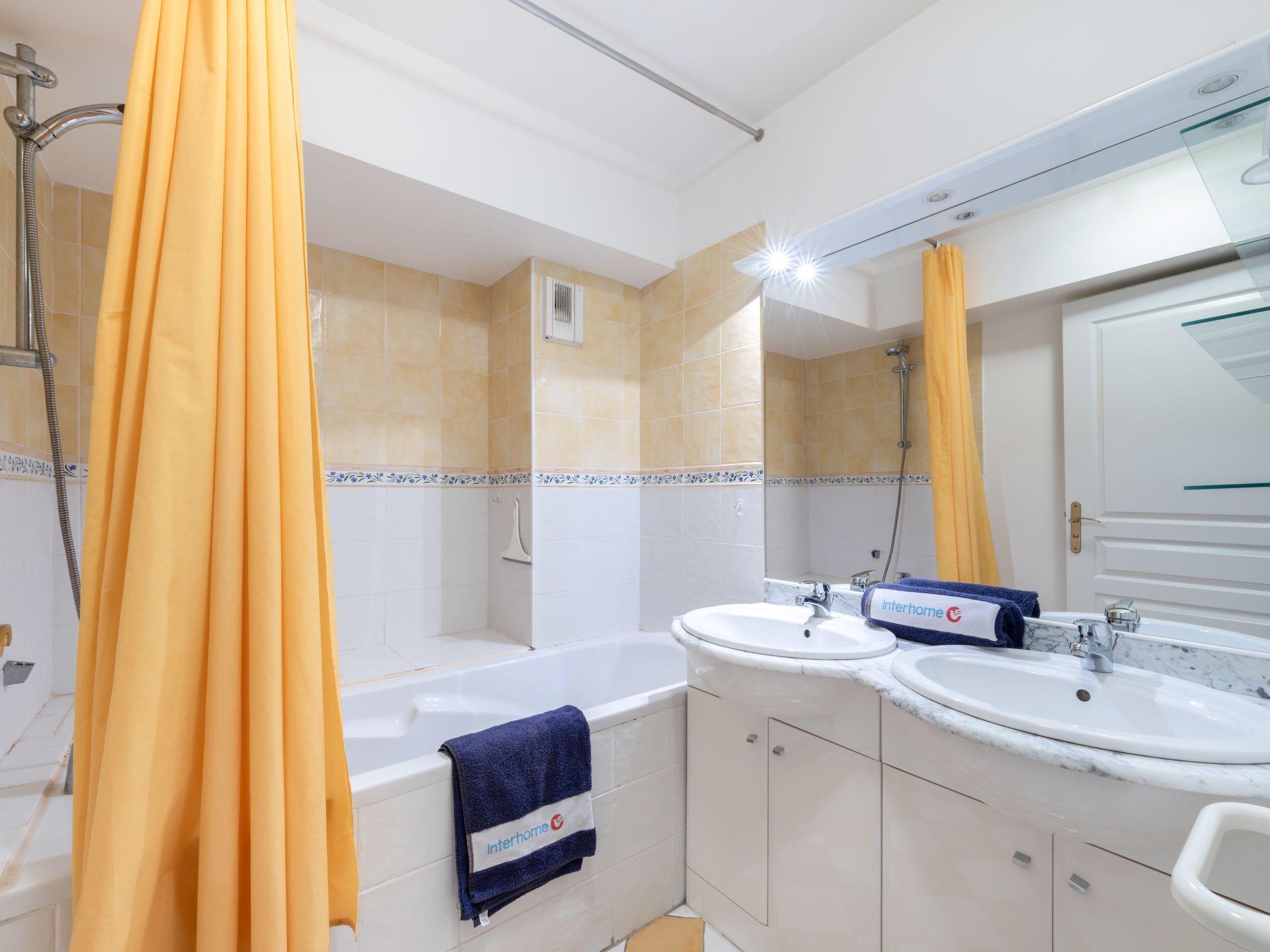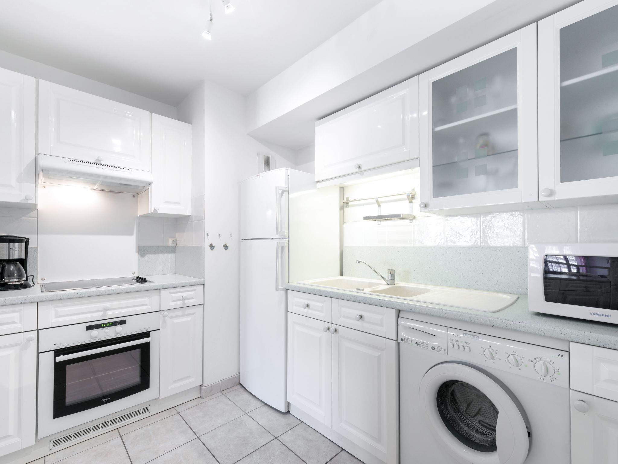 2-room apartment 50 m2 on 3rd floor. Comfortable and beautiful furnishings: open living room with 1 sofabed (140 cm, length 190 cm), TV (flat screen). Exit to the terrace. 1 room with 1 french bed (140 cm, length 190 cm). Open kitchen (oven, 4 ceramic glass hob hotplates, toaster, microwave, freezer, electric coffee machine). Bathroom, sep. WC. Electric heating, air-conditioning. Terrace 9 m2, south facing position. Terrace furniture. Beautiful view of the garden. Facilities: washing machine, iron. Internet (WiFi, extra). Garage space n 49 (1 car), height 180 cm, width 253 cm. Please note: TV only FR. Smoke alarm.