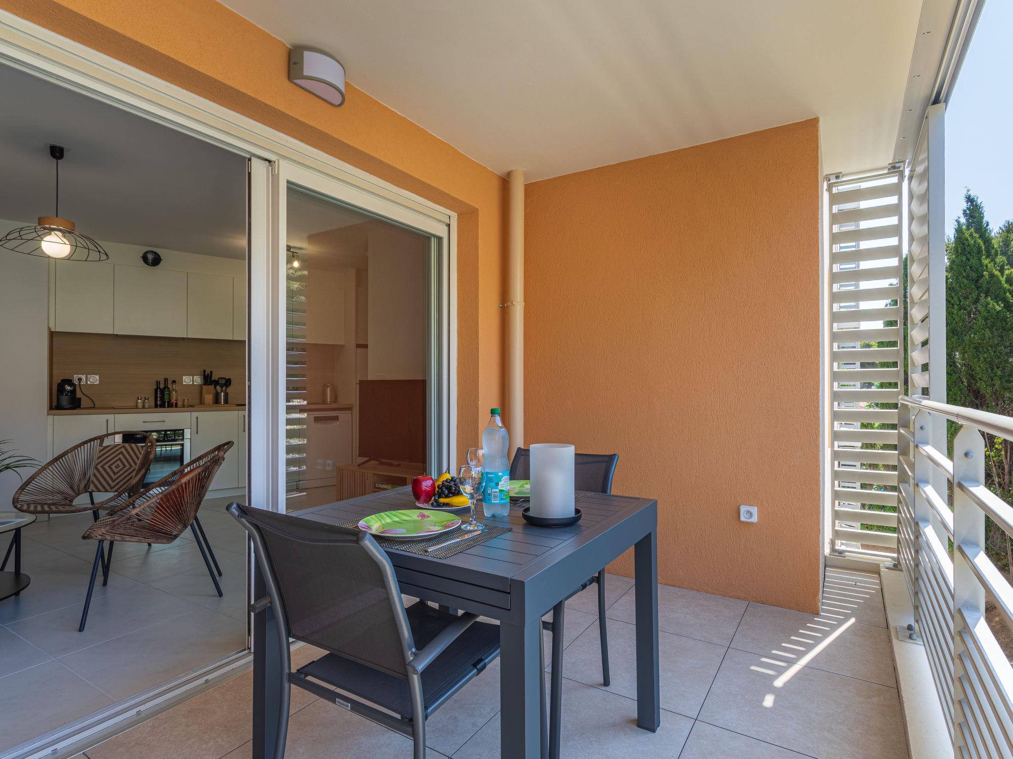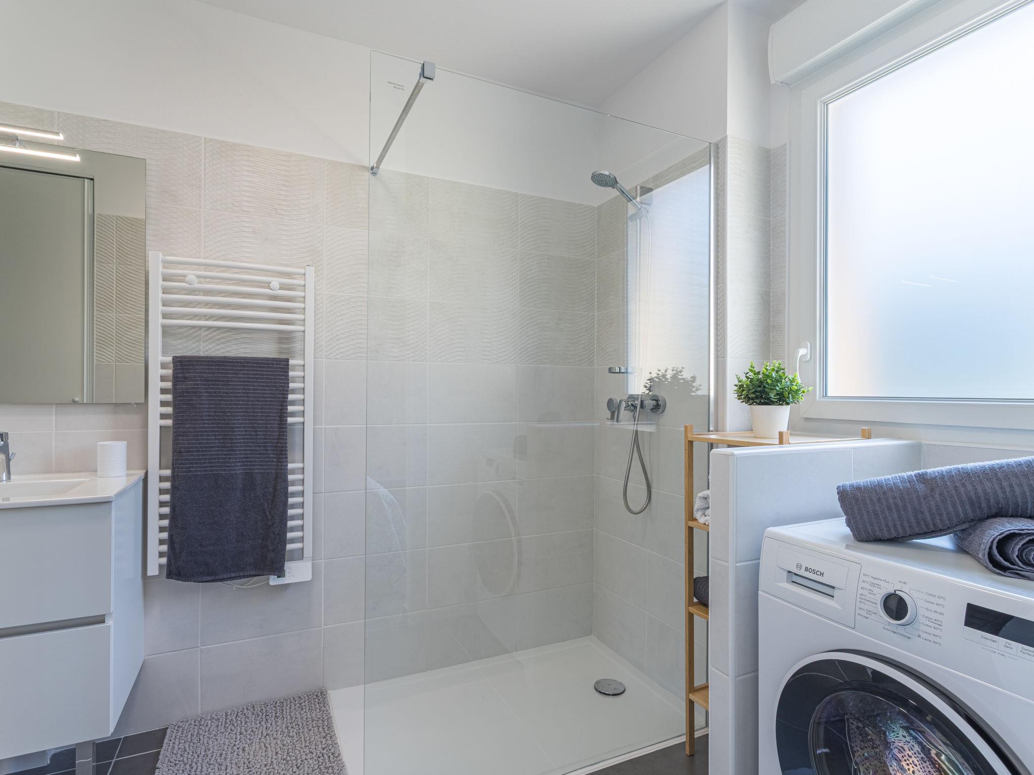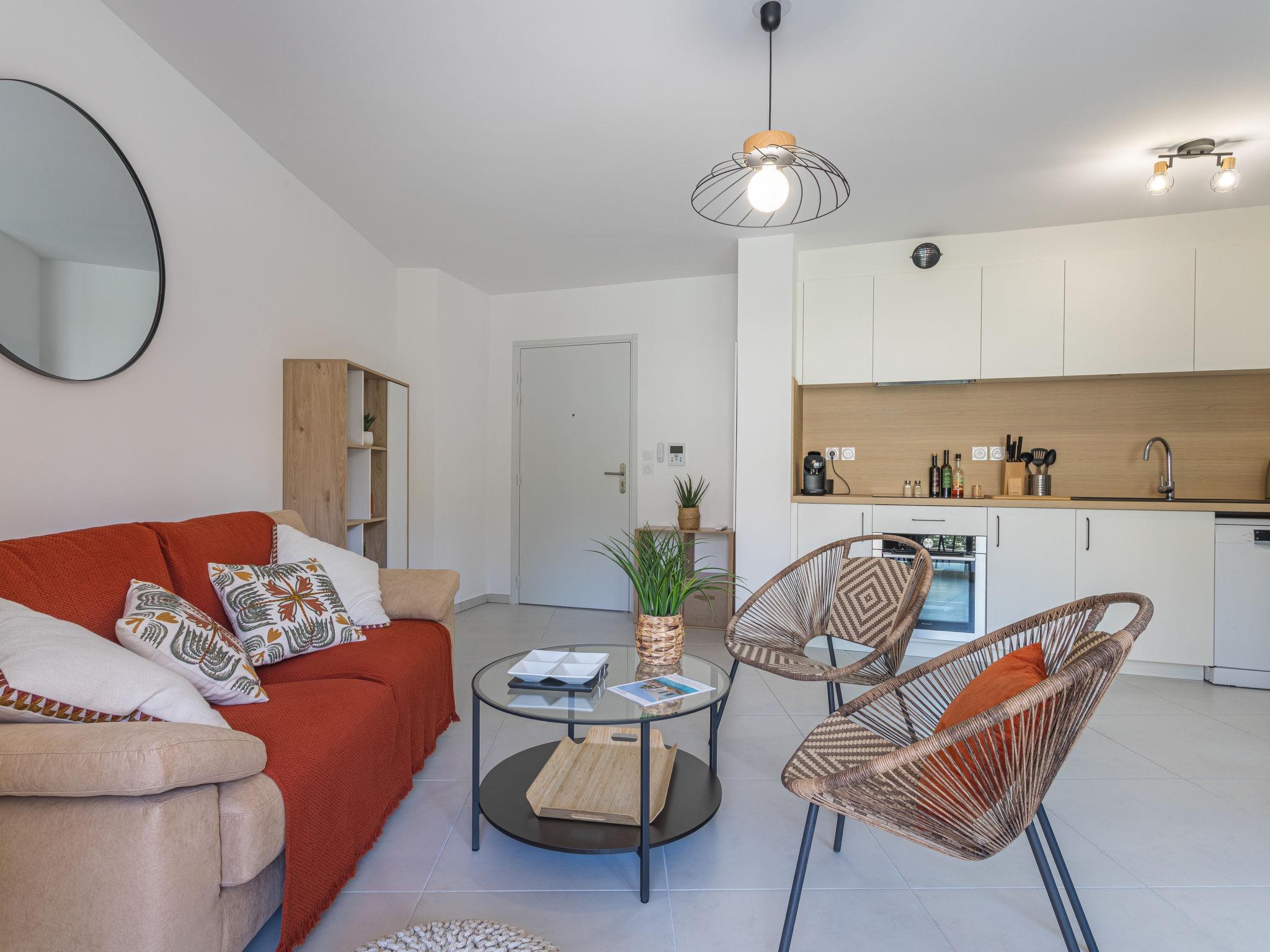 2-room apartment 42 m2 on 2nd floor. Bright, comfortable furnishings: living/dining room with TV (flat screen), air conditioning. Exit to the terrace. 1 room with Dressing room with 1 french bed (160 cm, length 190 cm), bathroom. Open kitchen (oven, dishwasher, 3 induction hot plates, toaster, kettle, microwave, electric coffee machine, Capsules for coffee machine (l'or) extra). Sep. WC. Electric heating. Terrace 8 m2, south-east facing position. Terrace furniture. Facilities: washing machine, iron, hair dryer. Internet (WiFi, free). Garage space n 1 (2 cars), height 194 cm, width 280 cm. Please note: non-smokers only. Smoke alarm. Offer by a commercial proprietor according to Art. 155, IV, CGI