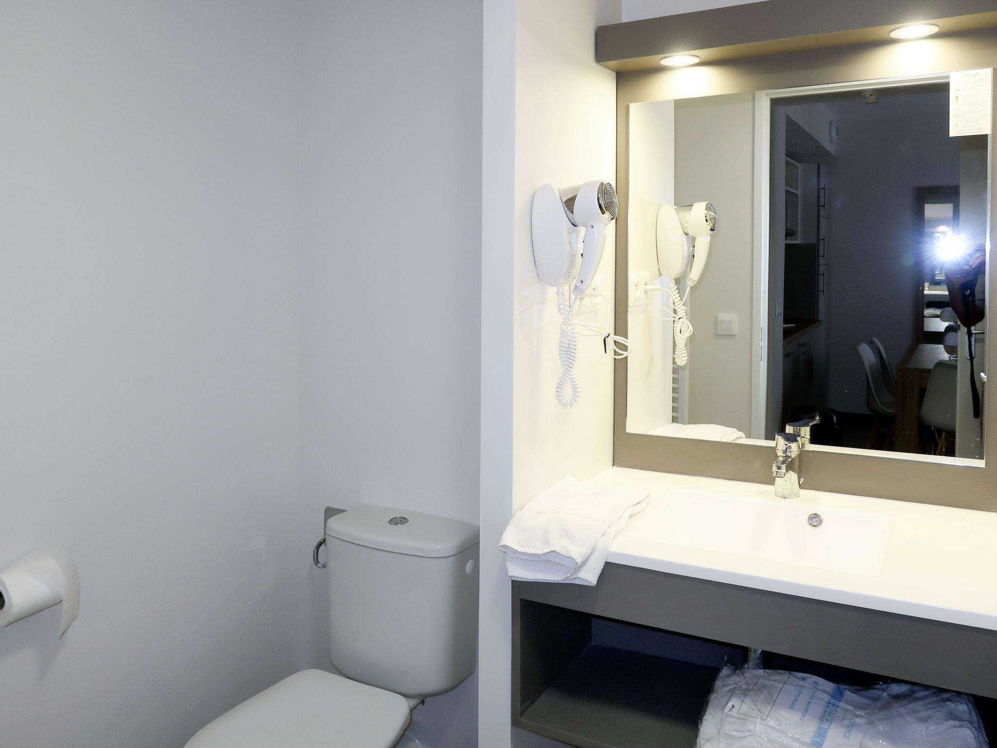 "Résidence Odalys Collection Les Canisson", 3-room apartment 40 m2. Bright, modern furnishings: living/sleeping room with 1 double sofabed, dining table and satellite TV. Exit to the balcony, to the terrace. 1 room with 1 french bed. 1 room with 2 sleeping facilities (90 cm, length 190 cm), shower/WC. Kitchenette (dishwasher, 4 ceramic glass hob hotplates, toaster, kettle, electric coffee machine, combination microwave). 2 baths or showers/WC. Electric heating, air-conditioning. Small balcony or small terrace. Terrace furniture, balcony furniture. Facilities: children's high chair, baby cot (extra). Internet (WiFi, free). Please note: non-smokers only. Maximum 1 pet/ dog allowed. Smoke alarm.