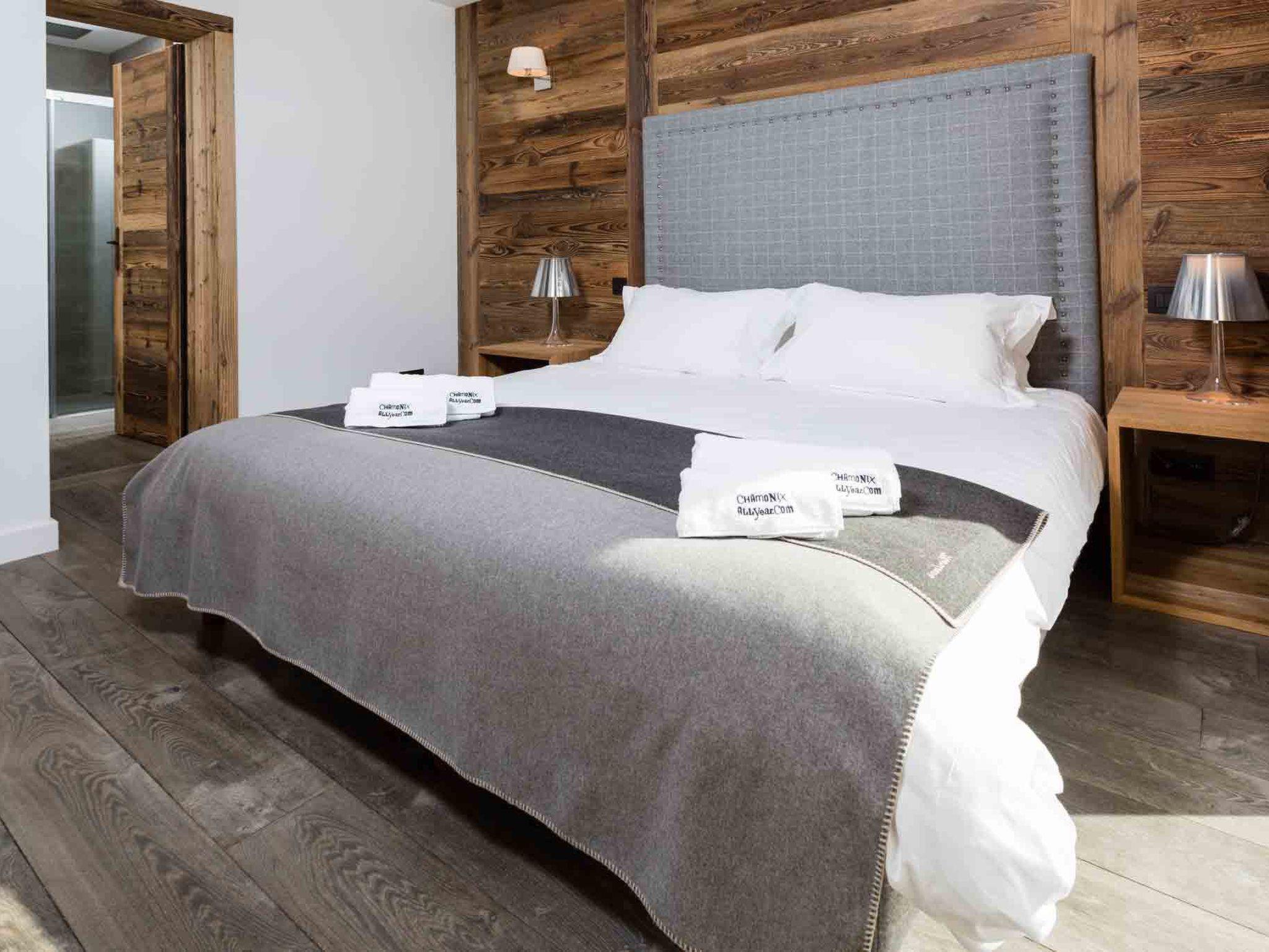 Chalet Les Praz is a stunning, luxurious 4 bedroom Chamonix chalet, located in Les Praz, just 5 minutes' drive from Chamonix and a short walk to the Flegere ski lift. Recently built, the chalet is finished to a very high standard with a huge open plan living room on the first floor with feature fireplace, and doors leading to large sunny terrace facing Mont Blanc. The chalet sleeps up to 8 people with 4 spacious bedrooms, all with ensuite bathrooms. There are 3 bedrooms on the ground floor as well as a 4th bedroom off the living area with king bed and ensuite bathroom. All the bedrooms have mountain views and two of them have direct access out to the garden as well. The lounge has a flatscreen TV with French satellite channels & DVD player, and there are two Parrot bluetooth speakers too. The kitchen is very well-equipped with Nespresso machine, fondue and raclette set, as well as a large fridge freezer with integrated wine fridge. There are two separate dining tables and chairs to allow guests to dine inside or on the terrace outside too. Wifi internet access is available throughout the chalet, and there is parking for up to 3 cars outside too. The chalet also benefits from dishwasher, washing machine & dryer, and lots of additional luxury items to help you enjoy your stay.