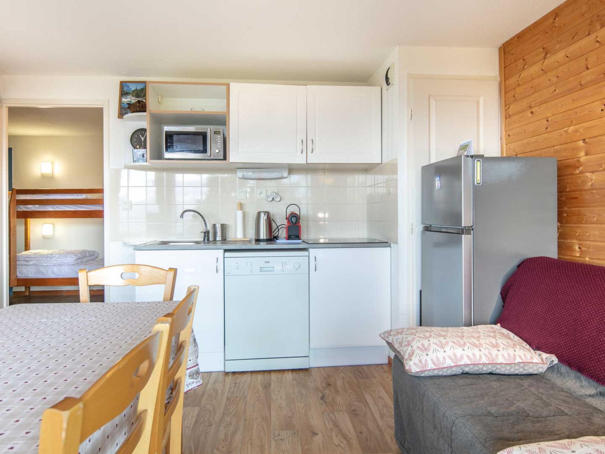 "V du Bachat Sorbiers E", 1-room studio 38 m2 on 2nd floor. Object suitable for 6 adults. Living room with 1 sofabed and 1 x 1 bunk beds, 1 double bed, 1 pull-out bed and TV. Kitchen (oven, dishwasher, toaster, kettle, microwave, freezer, electric coffee machine). Bath/WC. Balcony. View of the mountains. Facilities: Internet (WiFi, free). Parking. Please note: non-smokers only. Offer by a commercial proprietor according to Art. 155, IV, CGI