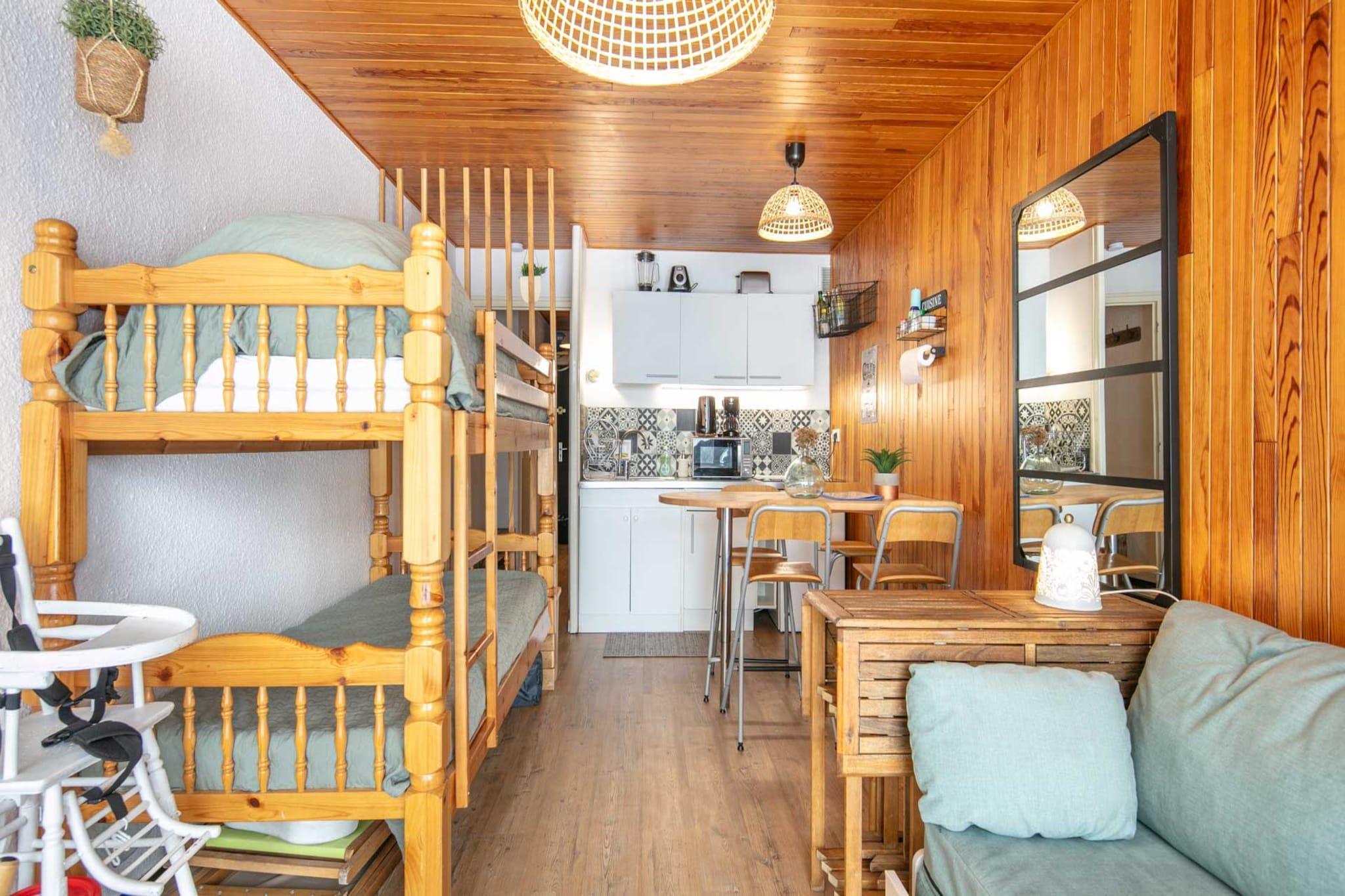 Dette lyse og koselige tilfluktsstedet på 25 m² i Chamrousse er perfekt for opptil fire gjester, og tilbyr en veldesignet plass som er ideell for par, små familier eller venner. Studioet har allsidige soveplasser, Wi-Fi, elektrisk oppvarming, TV og vaskemaskin for ekstra komfort. En privat terrasse med utemøbler inviterer gjestene til å slappe av og nyte de rolige fjellomgivelsene. Bygningen inkluderer også heis og friluftsparkering i nærheten for enkelhets skyld. Eiendommen ligger i et familievennlig alpint område, kun 600 meter fra skianlegget, noe som gjør det til en flott base for vintersportsentusiaster. Et supermarked ligger bare 450 meter unna, og en rekke restauranter innen 550 meter tilbyr deilige spisesteder. Enten du står på ski, går tur eller bare nyter utsikten, er alt du trenger innen rekkevidde. Det elektriske kjøkkenet med åpen planløsning er fullt utstyrt med kjøleskap, mikrobølgeovn, kaffetrakter, brødrister, vannkoker, servise og redskaper – noe som gjør tilberedningen av måltidet enkelt og hyggelig. Badet har hårføner og strykejern for ekstra enkelhet. Med sine gjennomtenkte fasiliteter og førsteklasses beliggenhet, lover dette studioet en avslappende og minneverdig fjellferie.