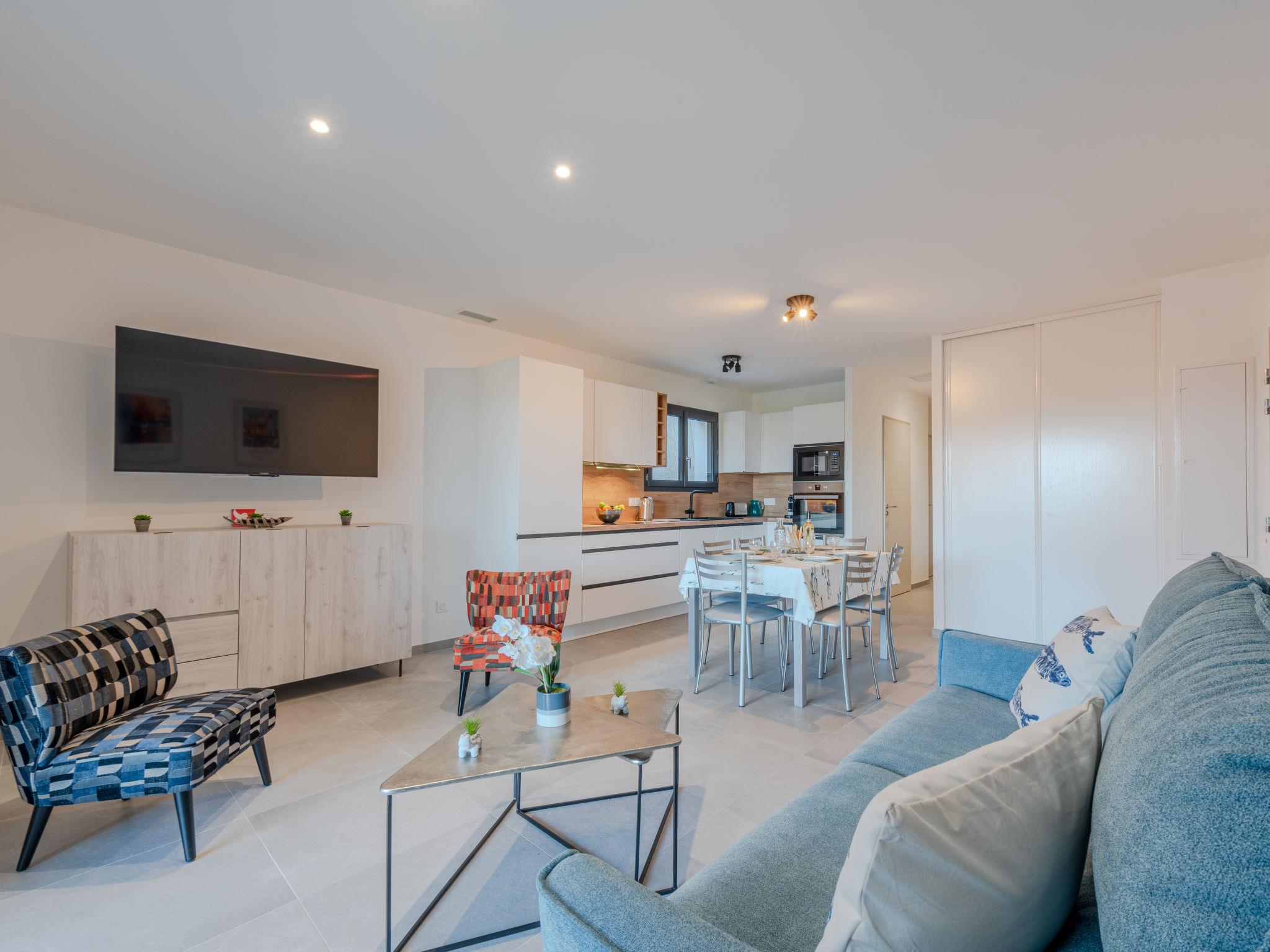 3-room apartment 77 m2 on 1st floor. Beautiful furnishings: living/dining room with TV (flat screen). Exit to the terrace. 1 room with 1 french bed (160 cm, length 200 cm), shower. 1 room with 1 french bed (140 cm, length 190 cm), shower. Open kitchen (oven, dishwasher, 4 induction hot plates, toaster, kettle, microwave, freezer, electric coffee machine, Capsules for coffee machine (nespresso) extra). Sep. WC. Air-conditioning, forced-air heating. Terrace 12 m2, north-east facing position. Terrace furniture. Facilities: washing machine, dryer, iron. Internet (WiFi, free). Parking (1 car). Please note: non-smokers only. Smoke alarm. Offer by a private individual according to Art. 155, IV of CGI.