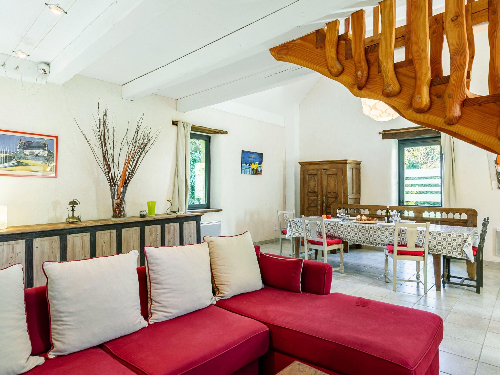 Beautiful, cosy country house "Les Trois Baudets", surrounded by trees and fields. 3 km from the centre of Elliant, 5.5 km from the centre of Rosporden, outside the resort, 18.5 km from the centre of Concarneau, 19 km from the sea, 19 km from the beach, in the countryside. For shared use: property 4 ha with trees, meadow. Private: garden 400 m2 with wildlife garden and trees. In the house: storage room for bicycles. Parking on the premises. Supermarket 3 km, bus stop "Salle des Sports" 2.6 km, sandy beach "Les Sables Blancs,Concarneau" 19 km. Sports harbour 21 km, golf course (18 hole) 20 km, surf school 19 km, sailing school 19 km. Nearby attractions: Quimper 18 km, Tregunc 19 km, Pont-Aven 20 km, Pointe de Trevignon 27 km. On the estate animal husbandry. Please note: the owner lives on the same property.