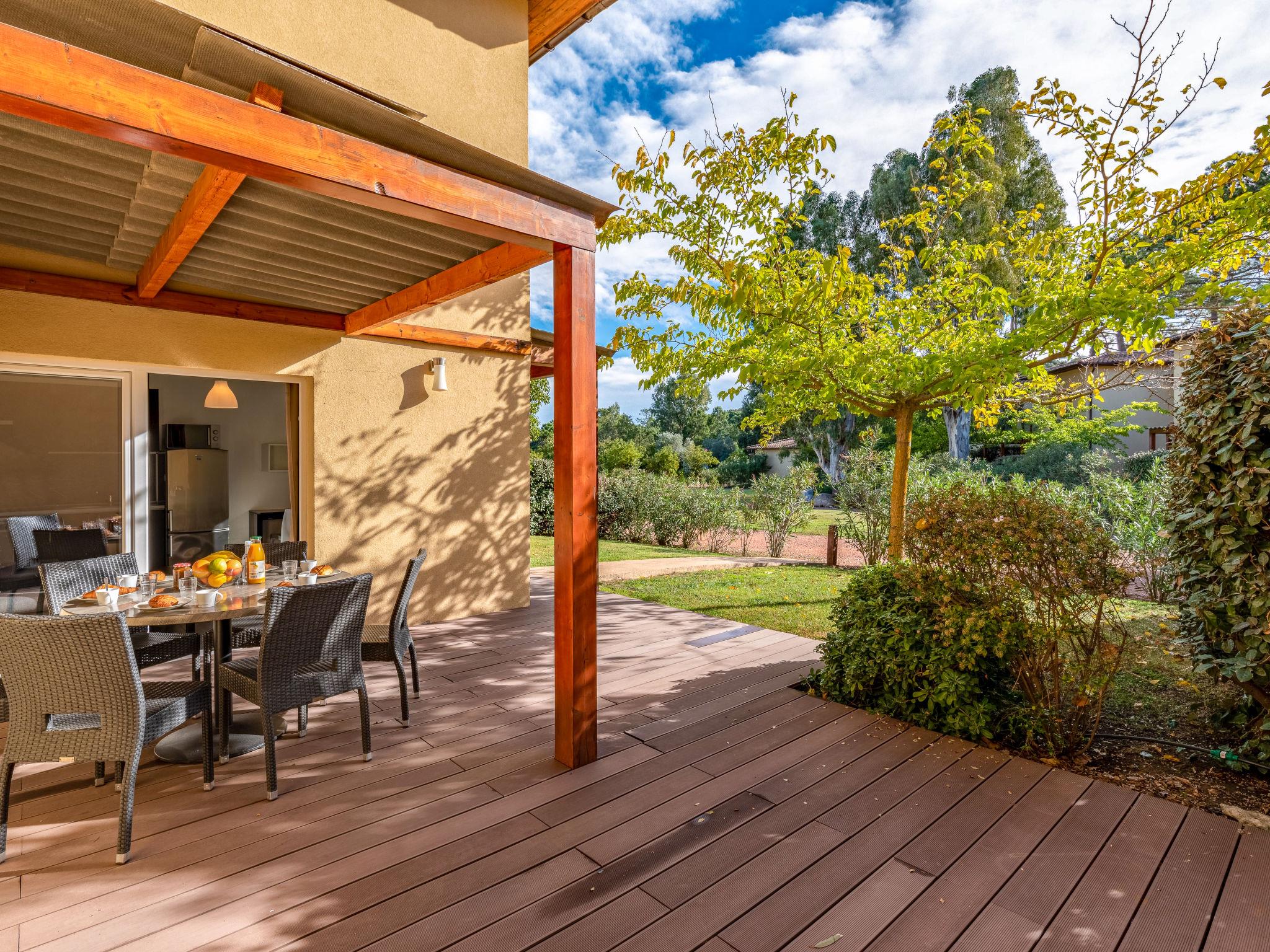 Resort "Marina di Favone", 2 storeys. 3 houses in the residence. 18 apartments in the residence. 300 m from the centre of Favone, 10 km from the centre of Solenzara, 116 km from the centre of Bastia, 200 m from the sea, road to cross. For shared use: property 15'000 m2 with plants and trees, meadow, swimming pool (14 x 7 m, seasonal availability: 30.Apr. - 31.Oct. pool opening hours: 09:00-20:00). WC in the pool area, outdoor shower, hot tub, boccia, terrace, garden furniture (slide, swing). In the complex: reception, bar, WiFi, washing machine, tumble dryer (for shared use). Parking on the premises. E-charging station. Shop 10 km, bus stop 350 m, sandy beach "Plage de Favone" 200 m. Minigolf 100 m. Nearby attractions: Porto-Vecchio 28 km, Plage de Santa Giulia 36 km, Plage de Palombaggia 37 km, Bonifacio 55 km. Please note: car recommended. The photograph shows a typical example.