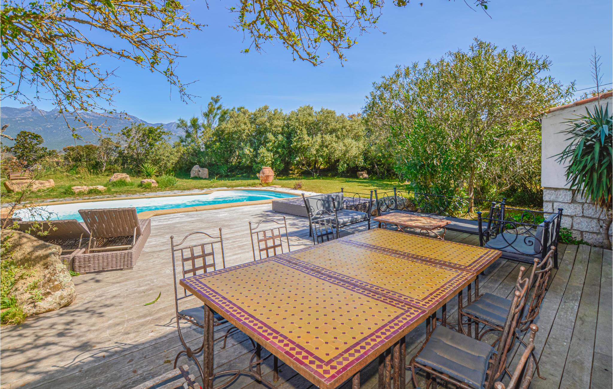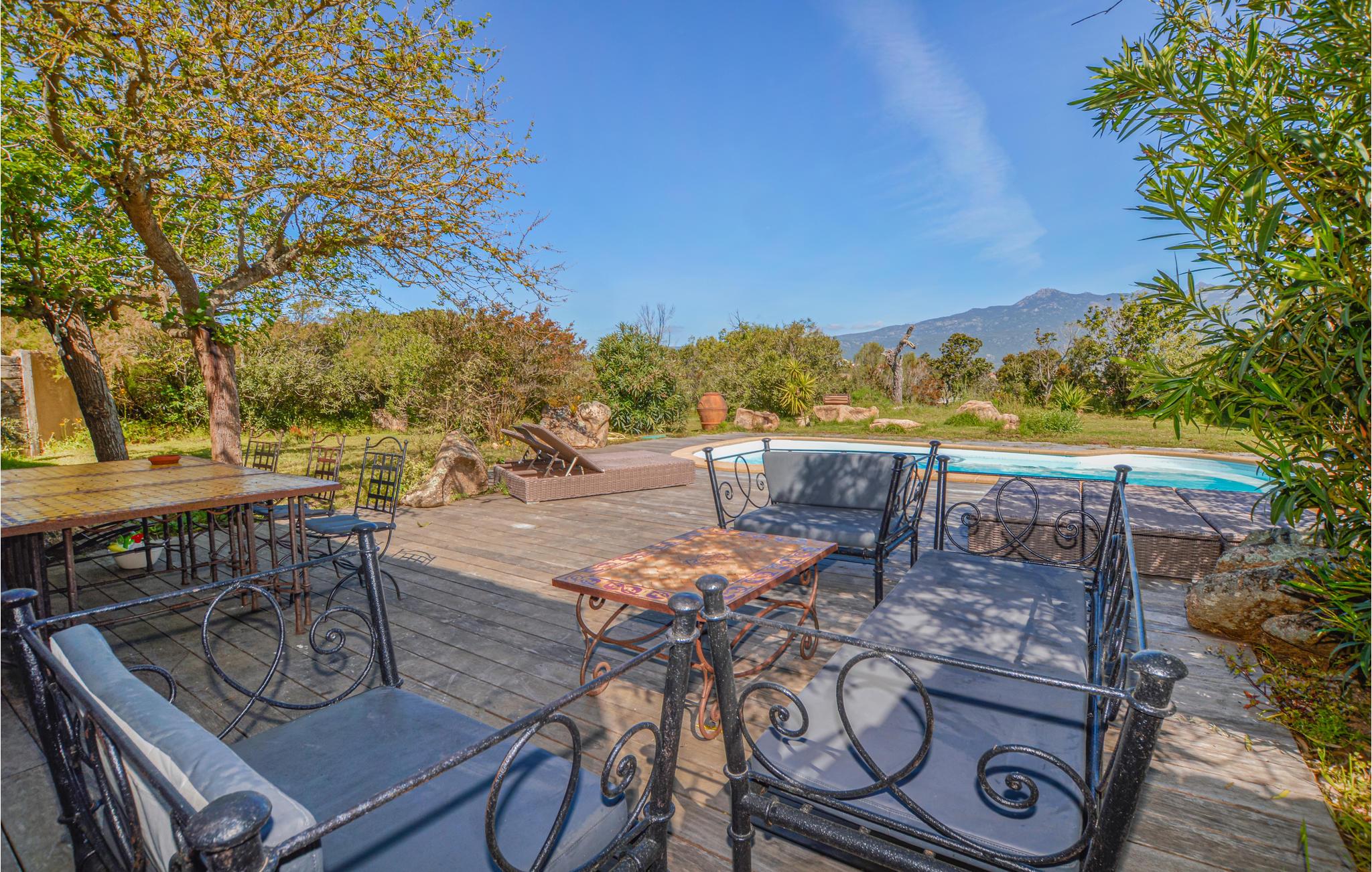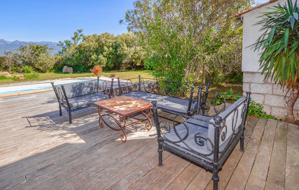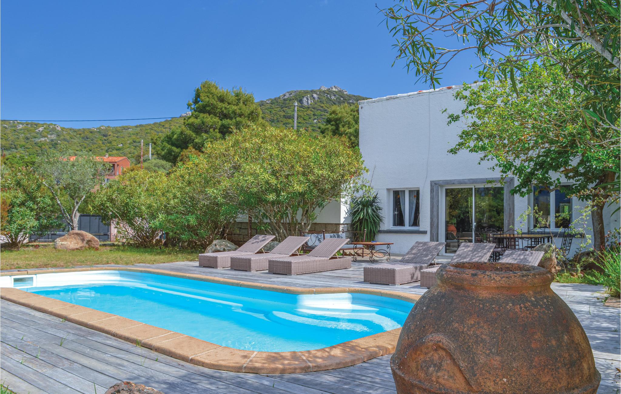 Dette store feriehuset med plass til 10 personer har en ideell beliggenhet bare 4 km fra de paradisiske sandstrendene i Figari og Pianottoli-Caldarello. Det private bassenget, beskyttet mot innsyn, lover mange morsomme timer i den korsikanske solen for store og små. Av de fire soverommene er to hovedsoverom, hvert med et flott bad. Den romslige stuen åpner ut mot bassengområdet og gir deg en vakker utsikt over panoramafjellet Uomo Di Cagna. Regionen er preget av en naturlig skjønnhet og tiltrekker seg blant annet den berømte Orii, navnet på en type bygning under et naturlig fjelloverheng (Abri) eller i et naturlig hulrom (Tafoni). Du kan også oppleve Lion de Roccapina-klippen, som ligner en løve, den vakre stranden Plage de Roccapina eller den flotte havnebyen Bonifacio. Bare 20 km fra villaen ligger Porto-Vecchio med sine vakre strender Rondinara og Santa-Giulia for dine føtter.