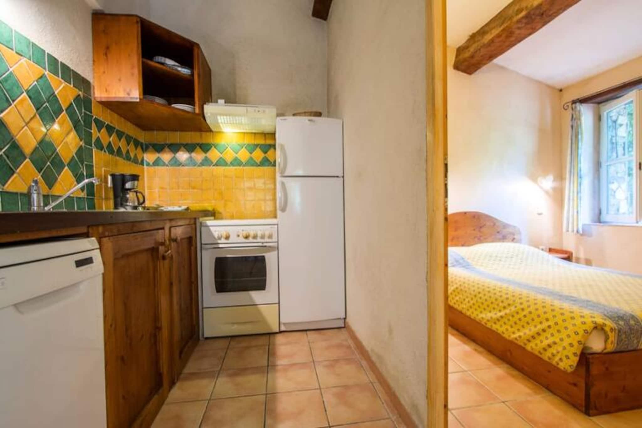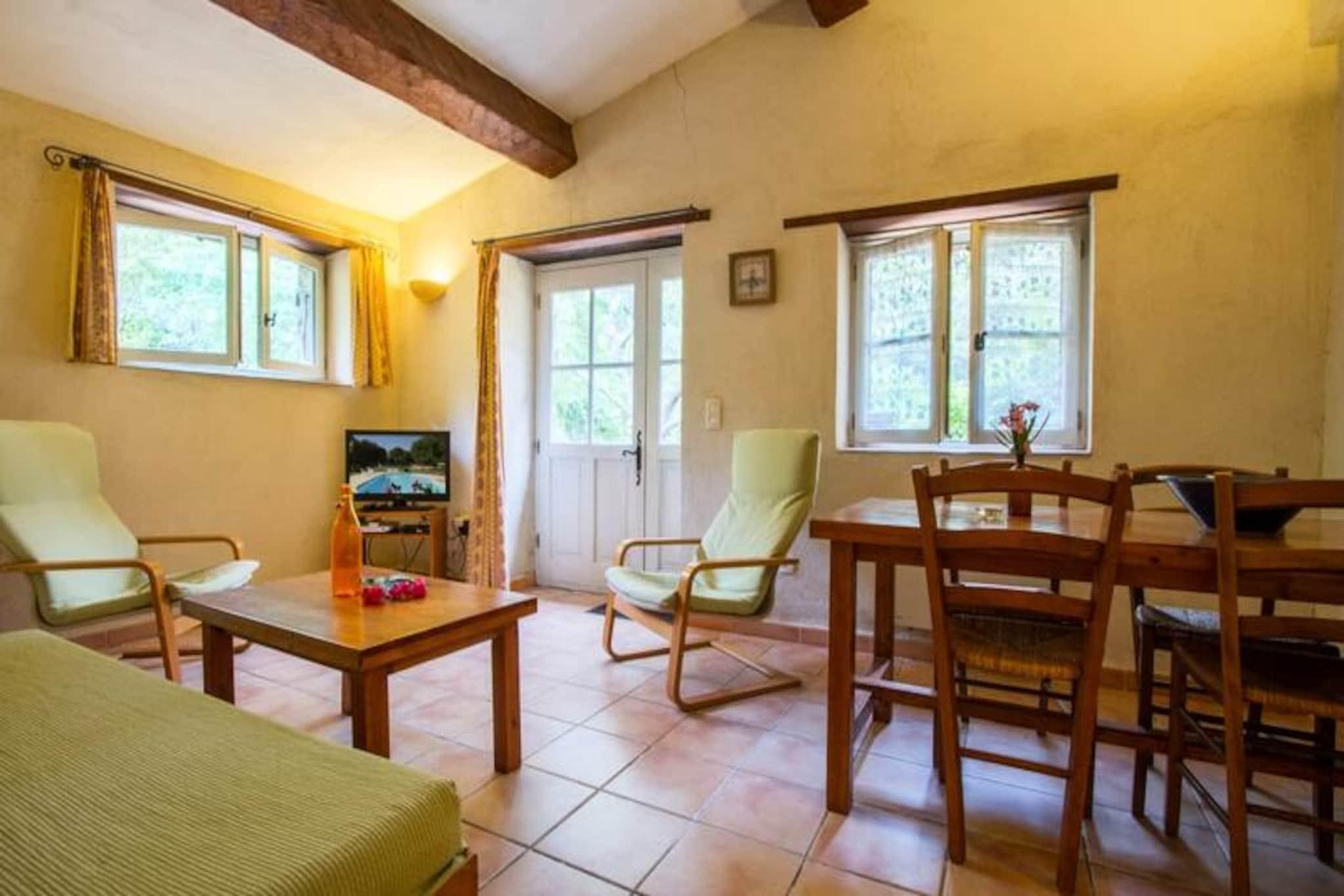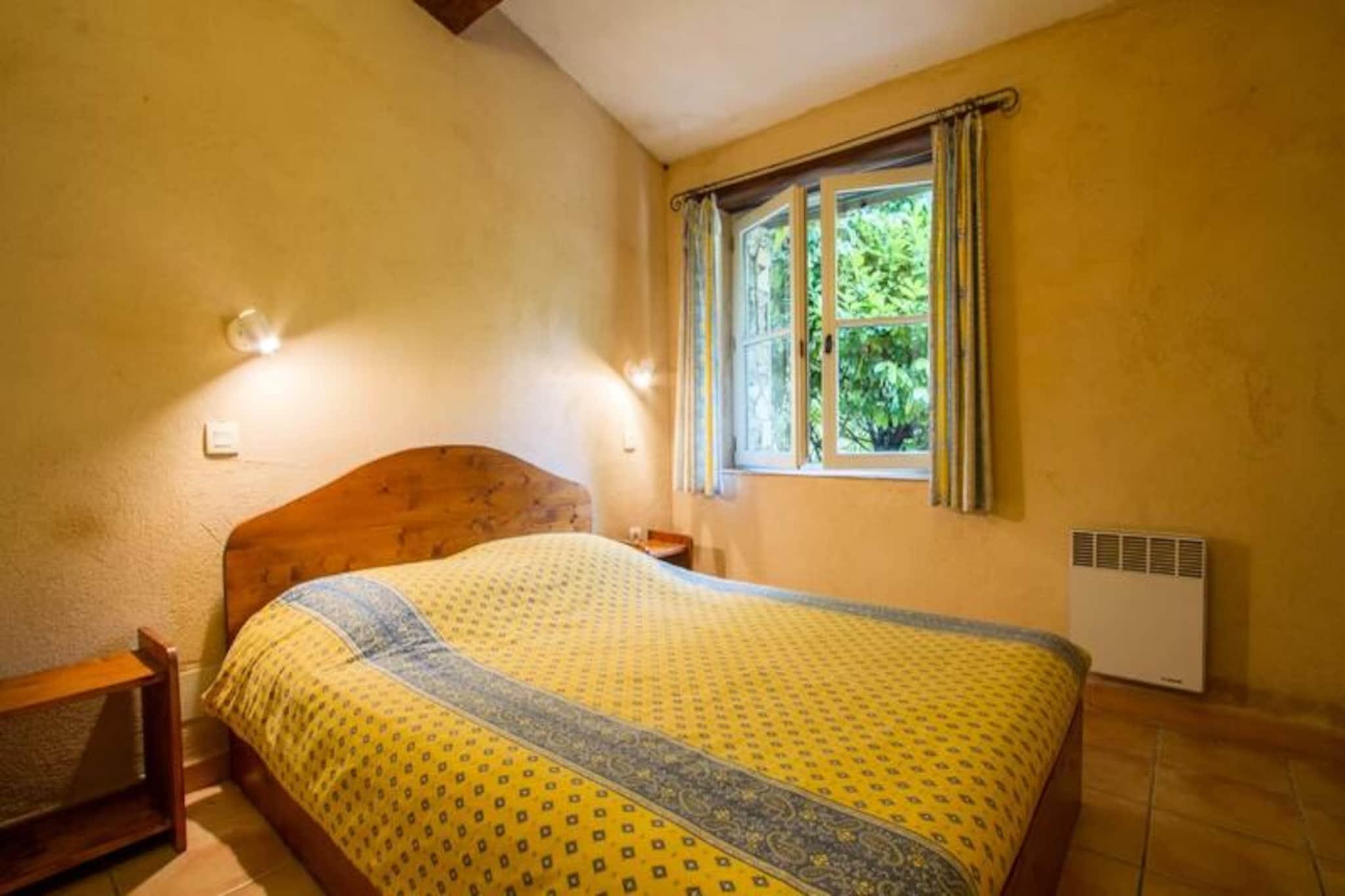Dette sjarmerende feriehuset tilbyr et komfortabelt, én-etasjes boareal med to soverom, ideelt for et fredelig tilfluktssted. Hovedsoverommet har en dobbeltseng, mens det andre soverommet kan konfigureres med enten tre enkeltsenger eller en kombinasjon av en dobbeltseng og en enkeltseng. Eiendommen er kjæledyrvennlig, og den romslige stuen har salong og spiseplass. Gjestene kan slappe av og slappe av i den koselige atmosfæren. Eiendommen ligger i hjertet av Provence Verte, og er omgitt av en naturskjønn eiendom på 6 hektar. Gjestene kan utforske den frodige parken med århundregamle eiketrær, furutrær og middelhavsplanter. Området er perfekt for utendørsaktiviteter og for å nyte regionens naturlige skjønnhet. Det felles svømmebassenget er tilgjengelig for en forfriskende svømmetur. Det velutstyrte kjøkkenet tilbyr alt som trengs for å tilberede måltider, og badet har moderne bekvemmeligheter. Eiendommen har også en privat sørvendt terrasse med direkte utgang til hagen. For ytterligere avslapning er et spa med badstue, hammam og boblebad tilgjengelig etter avtale. Miljøvennlig praksis er inkorporert, med organiske og nedbrytbare produkter som brukes til rengjøring.