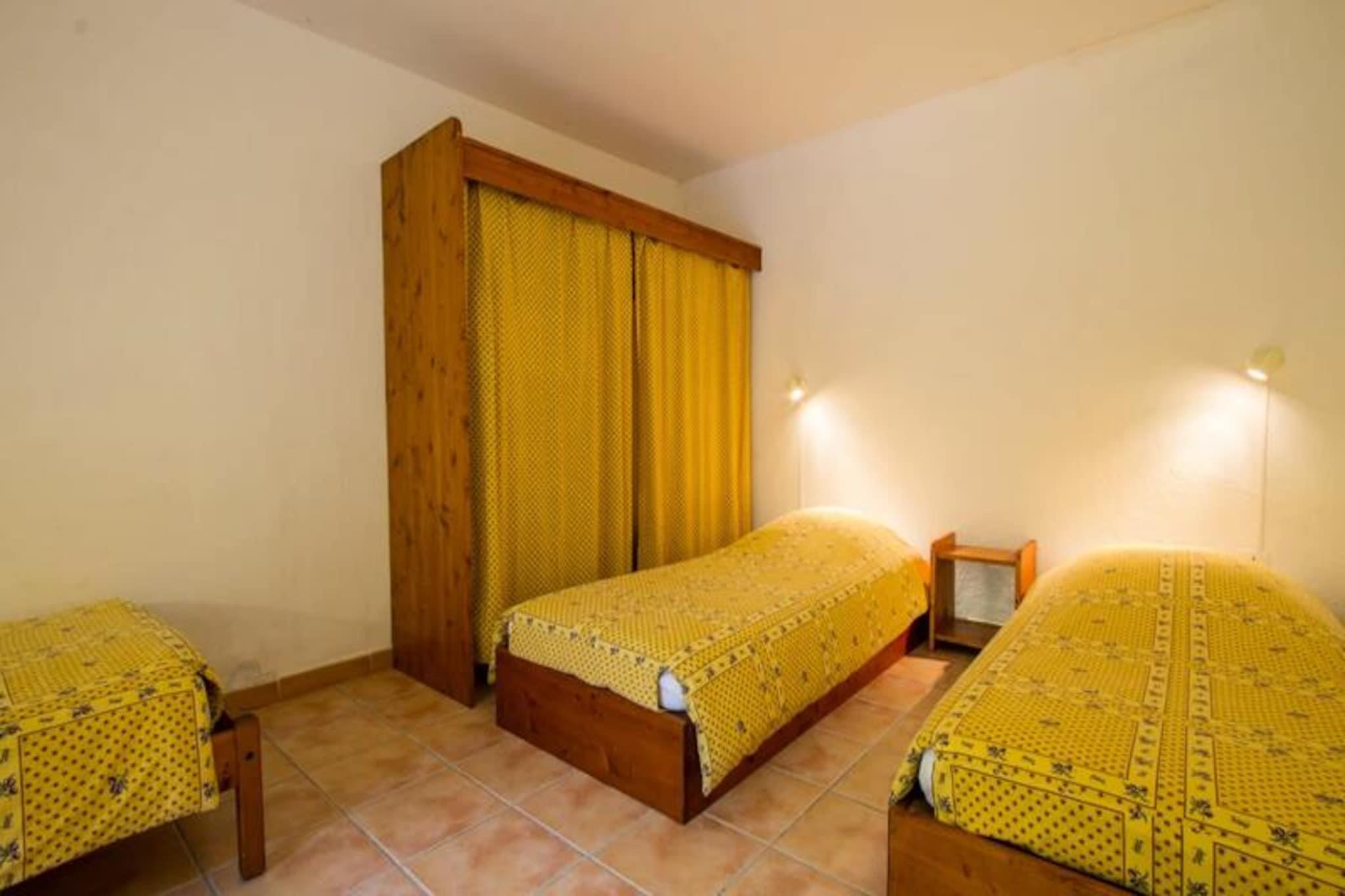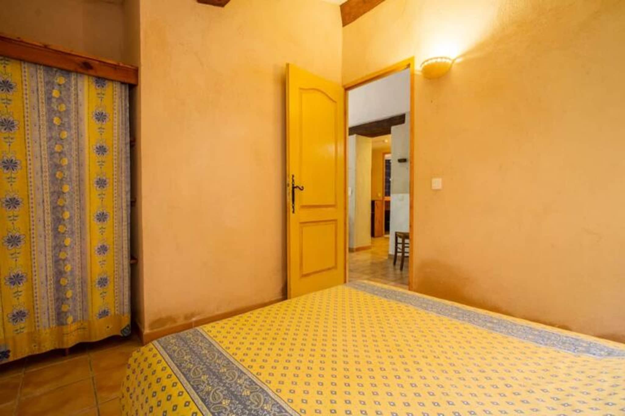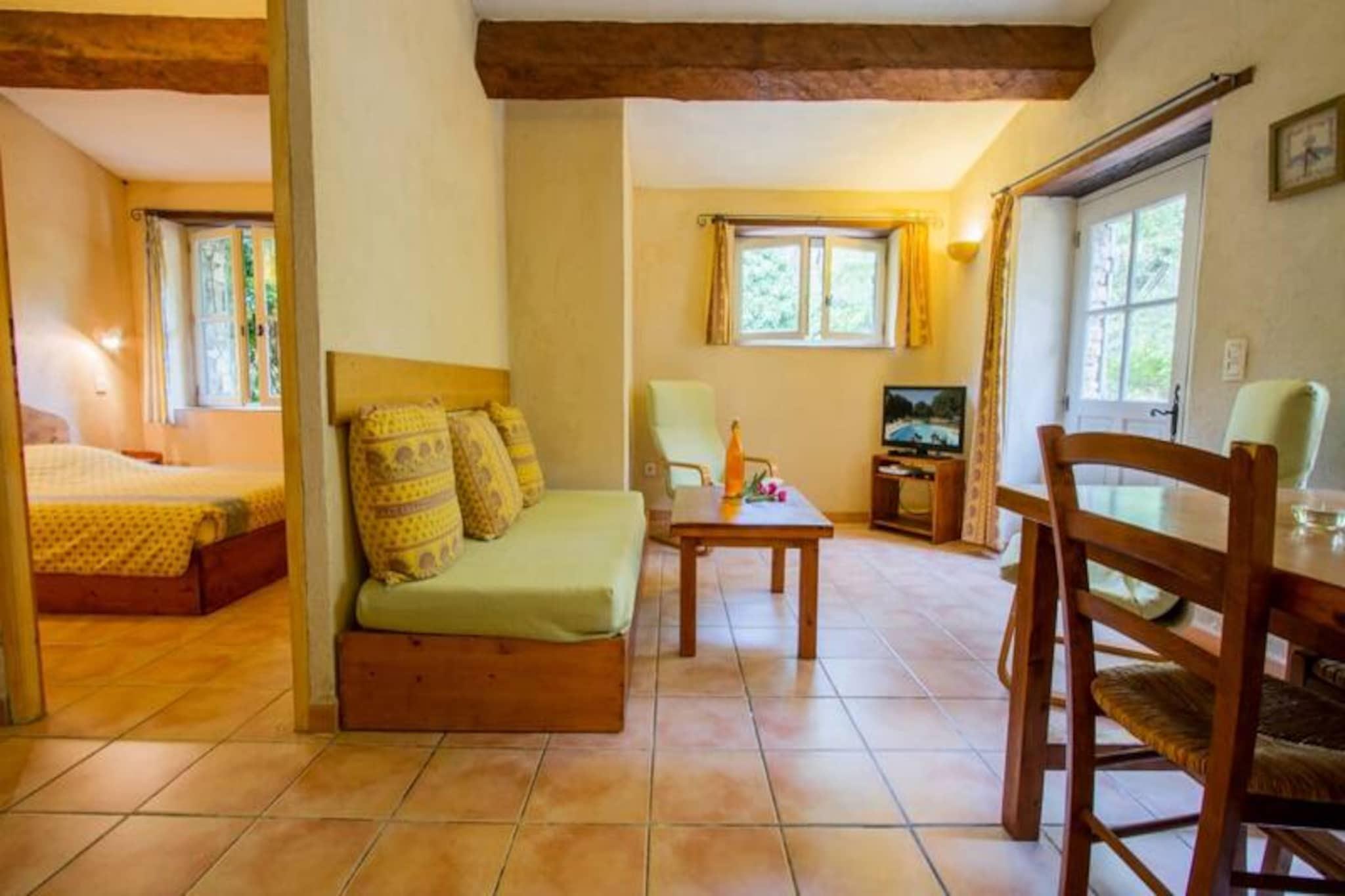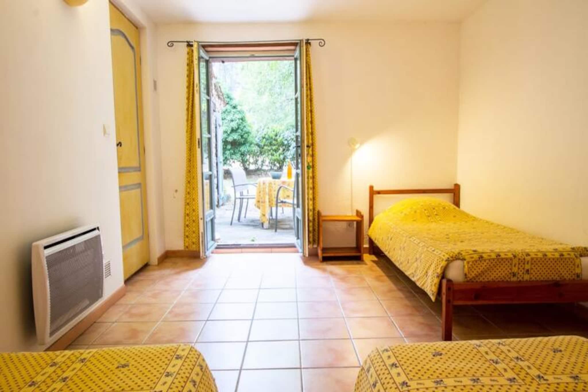 Dette sjarmerende feriehuset tilbyr et komfortabelt, én-etasjes boareal med to soverom, ideelt for et fredelig tilfluktssted. Hovedsoverommet har en dobbeltseng, mens det andre soverommet kan konfigureres med enten tre enkeltsenger eller en kombinasjon av en dobbeltseng og en enkeltseng. Eiendommen er kjæledyrvennlig, og den romslige stuen har salong og spiseplass. Gjestene kan slappe av og slappe av i den koselige atmosfæren. Eiendommen ligger i hjertet av Provence Verte, og er omgitt av en naturskjønn eiendom på 6 hektar. Gjestene kan utforske den frodige parken med århundregamle eiketrær, furutrær og middelhavsplanter. Området er perfekt for utendørsaktiviteter og for å nyte regionens naturlige skjønnhet. Det felles svømmebassenget er tilgjengelig for en forfriskende svømmetur. Det velutstyrte kjøkkenet tilbyr alt som trengs for å tilberede måltider, og badet har moderne bekvemmeligheter. Eiendommen har også en privat sørvendt terrasse med direkte utgang til hagen. For ytterligere avslapning er et spa med badstue, hammam og boblebad tilgjengelig etter avtale. Miljøvennlig praksis er inkorporert, med organiske og nedbrytbare produkter som brukes til rengjøring.