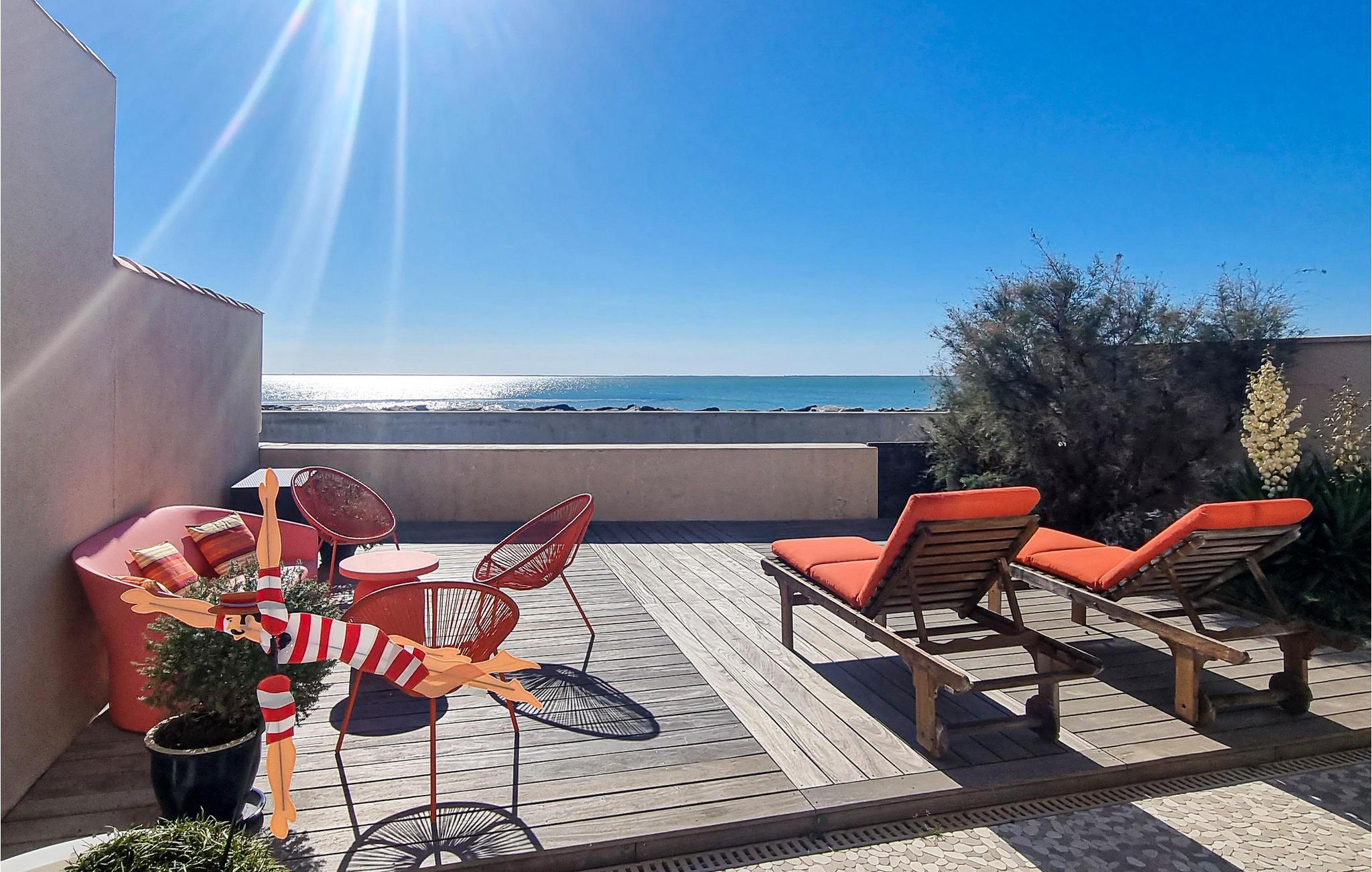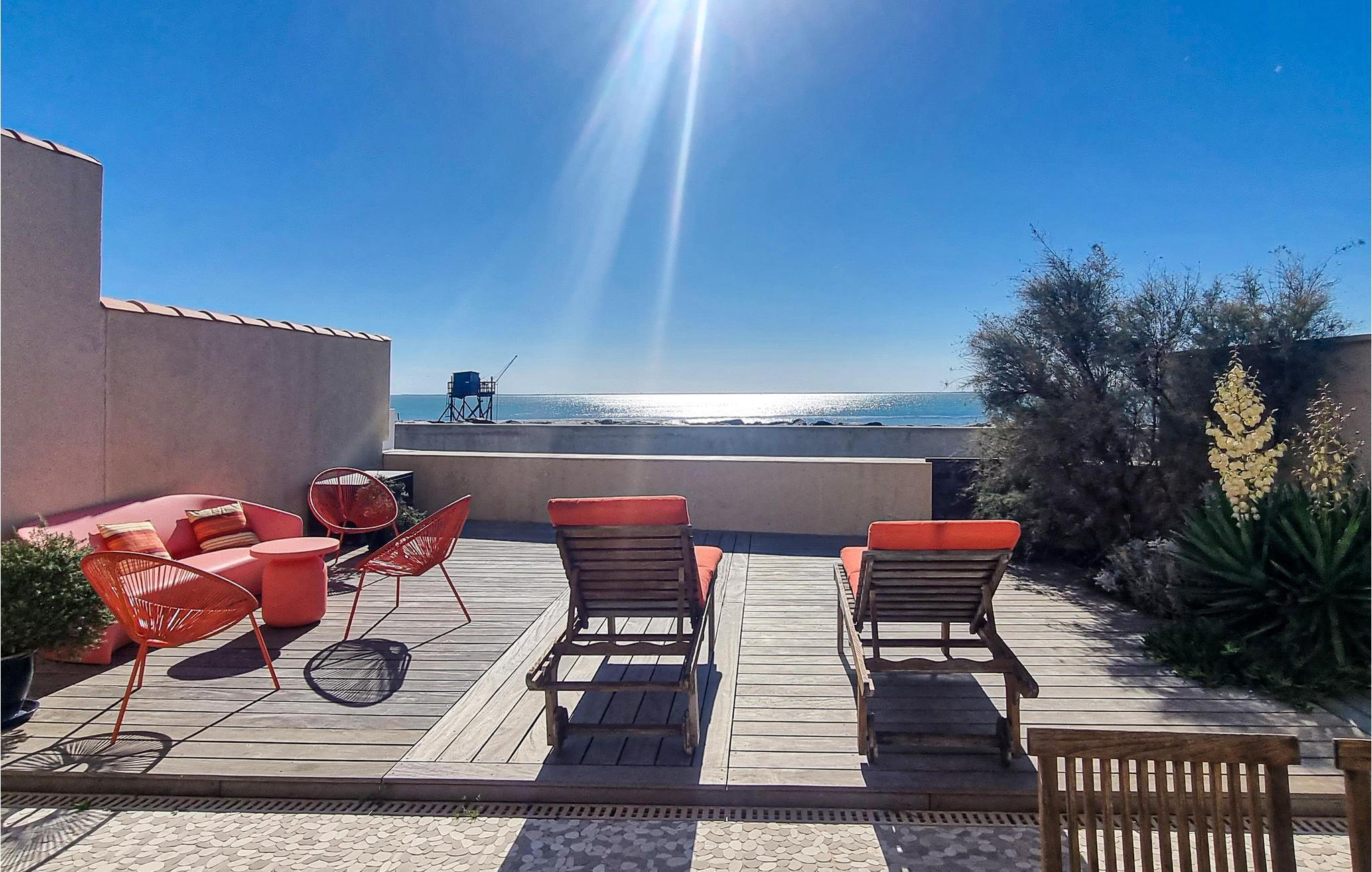 Den romslige terrassen er et hyggelig sted hvor du kan slappe av sammen på utemøbler og solstoler og tilberede maten på planchaen mens du sitter under markisen.
