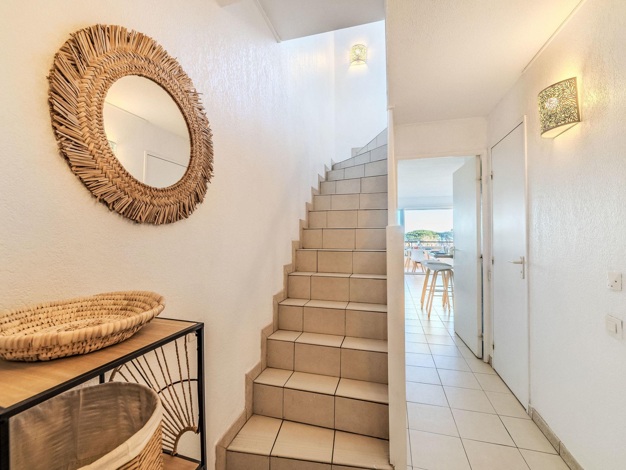 "Les Marines de Gassin 14", 3-room maisonette 45 m2 on 3rd floor. Partly renovated in 2022, cosy furnishings: living/dining room with TV (flat screen). Exit to the terrace. 1 small room with 1 x 2 bunk beds (80 cm, length 190 cm). Kitchenette (mini-oven, dishwasher, 4 ceramic glass hob hotplates, toaster, kettle, electric coffee machine, Capsules for coffee machine (Nespresso) extra). Bathroom, sep. WC. Upper floor: 1 room with 1 french bed (140 cm, length 200 cm). Shower, sep. WC. Electric heating. 2 terraces 16 m2, east facing position. Terrace furniture. Beautiful view of the sea. Facilities: washing machine, iron, hair dryer. Internet (WiFi, extra). Parking space n 294. Please note: non-smokers only. 1 small pet/ dog allowed. Smoke alarm. Offer by a private individual according to Art. 155, IV of CGI. 83065000695JM